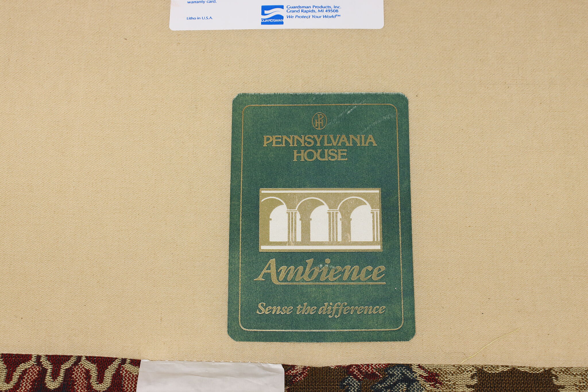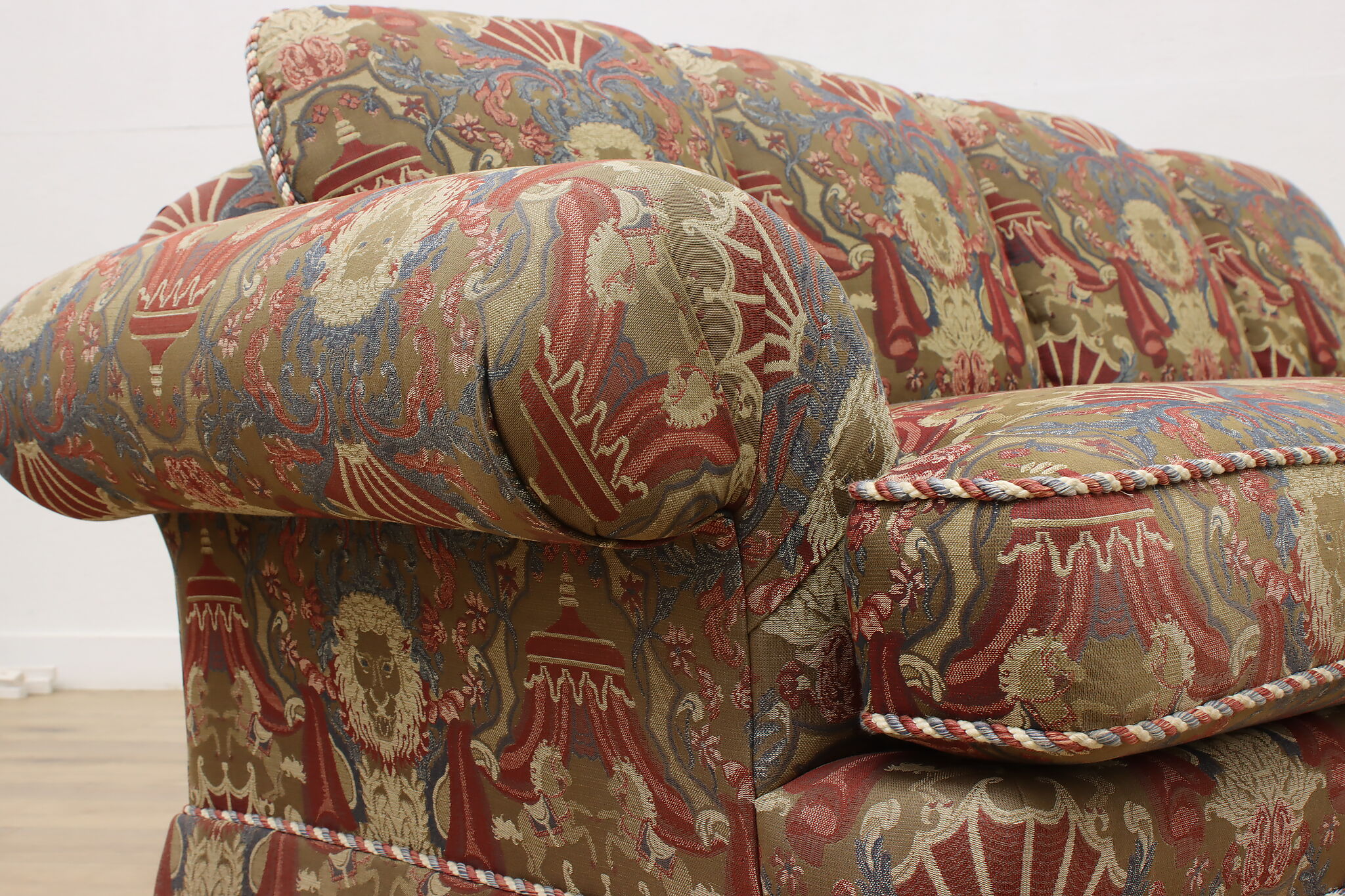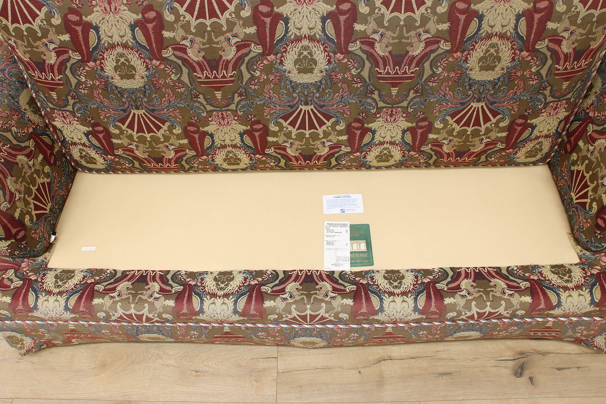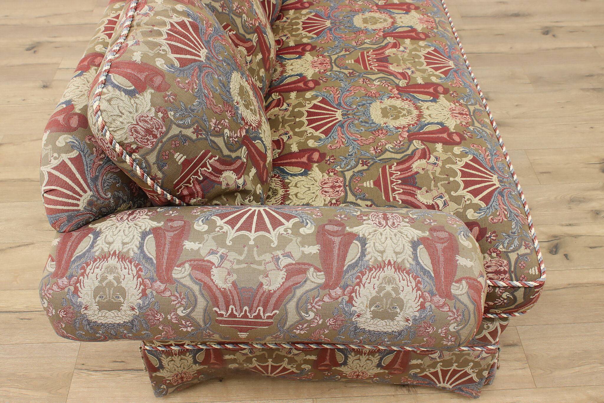 This traditional design sofa or couch has unique upholstery with circus tents, lions, and horses!