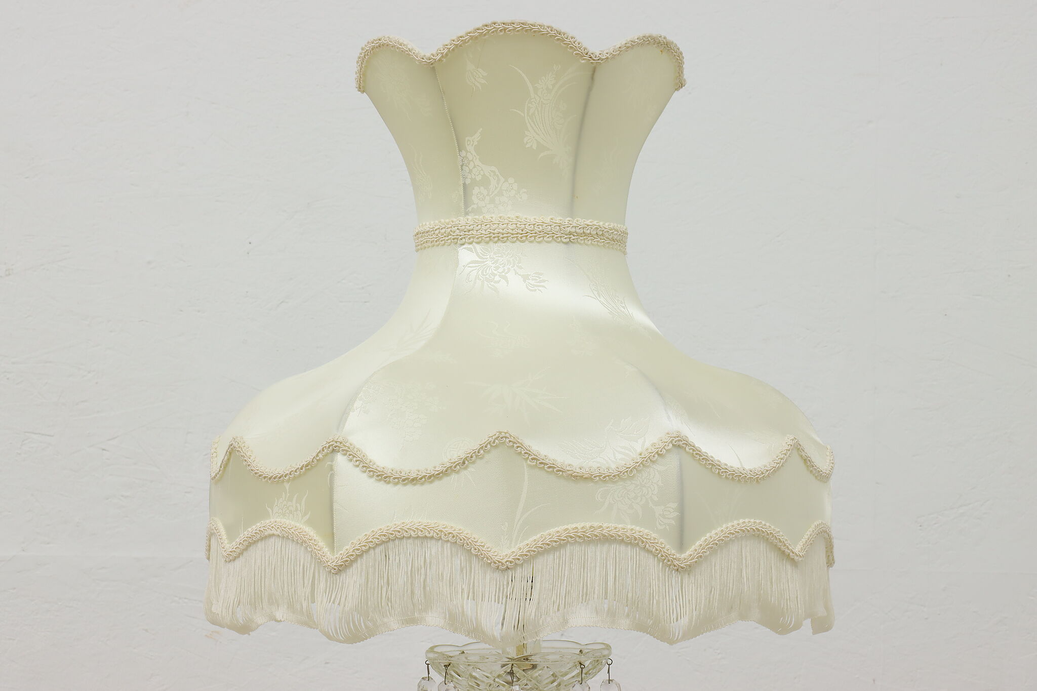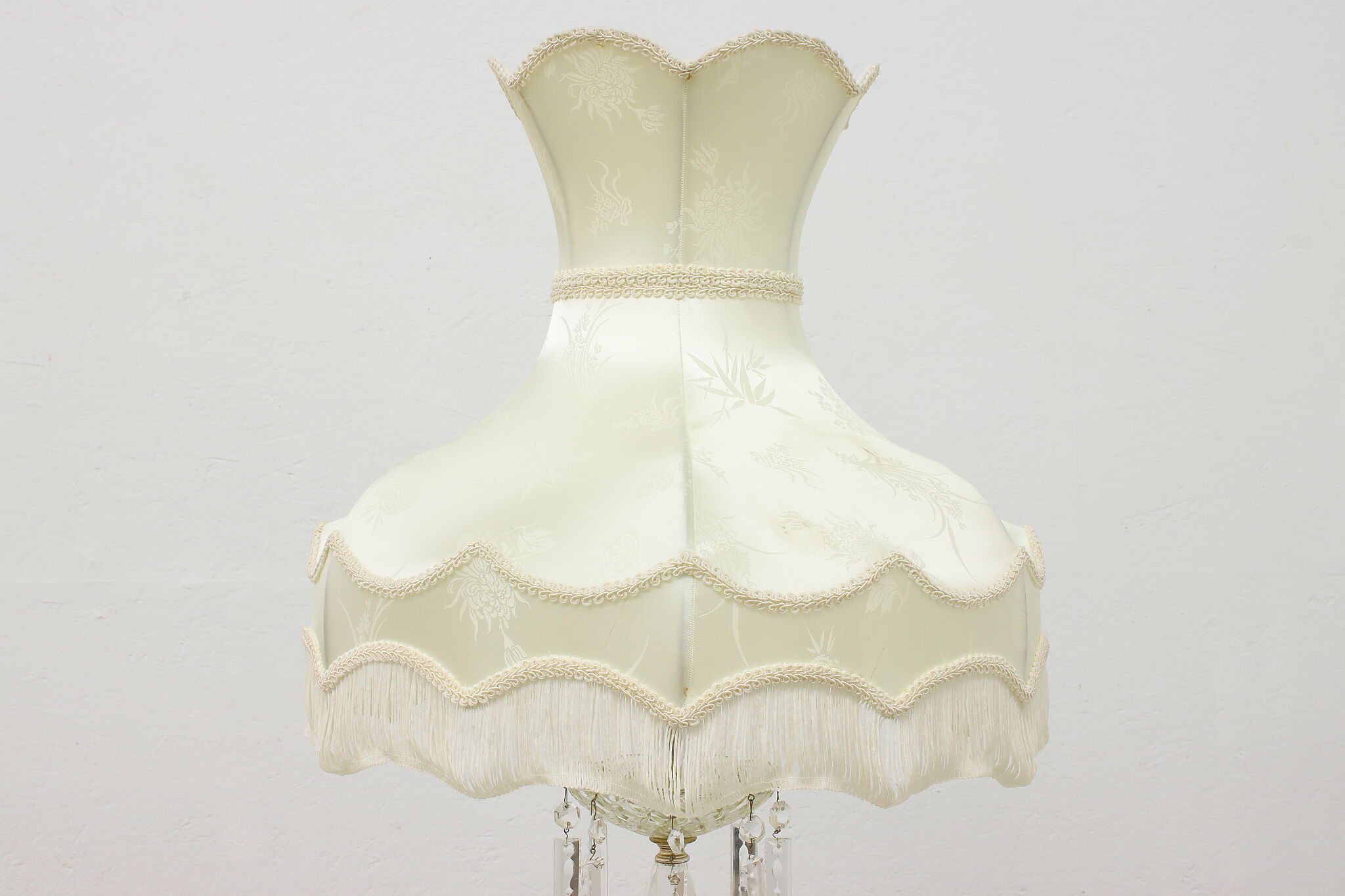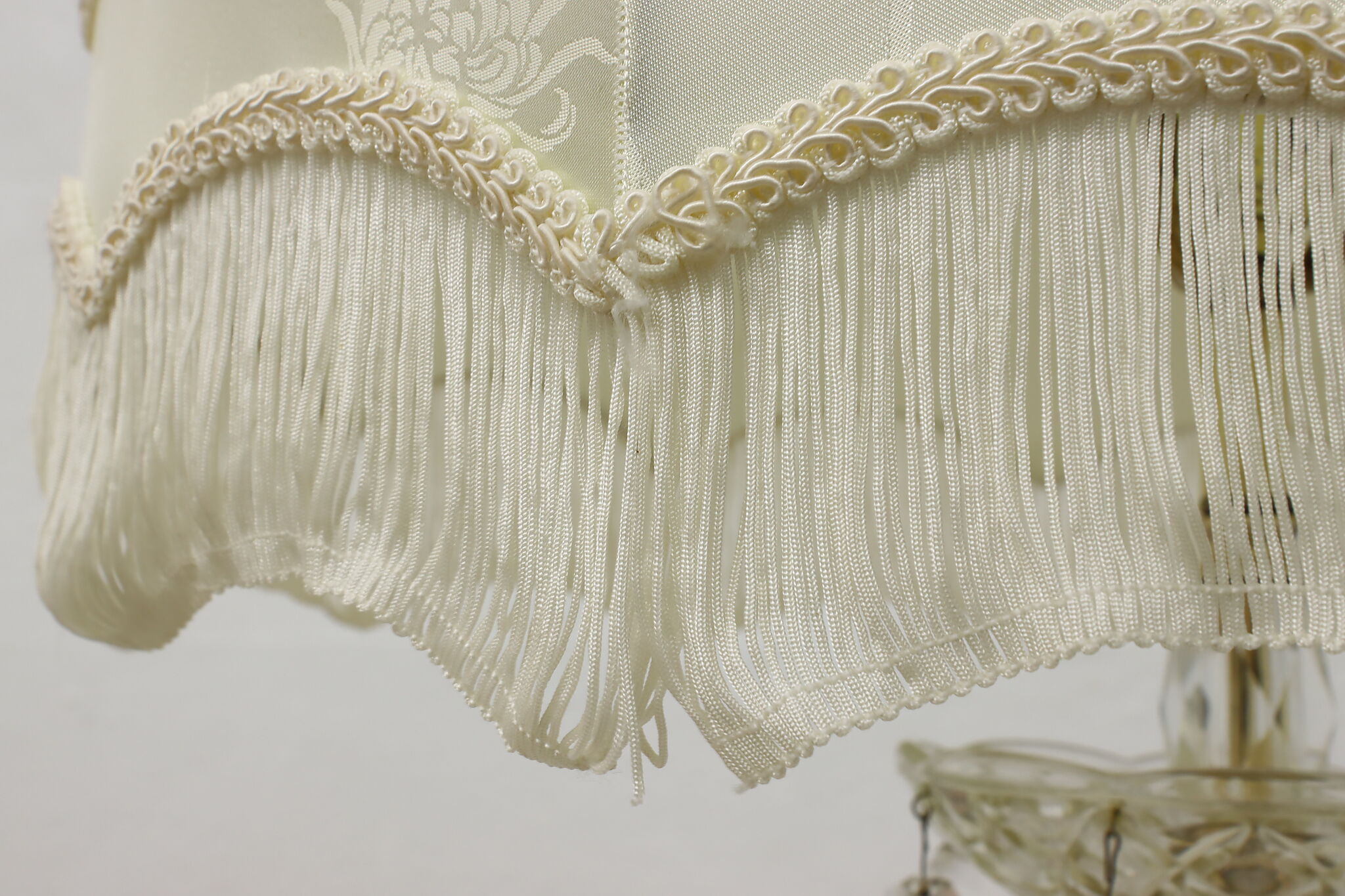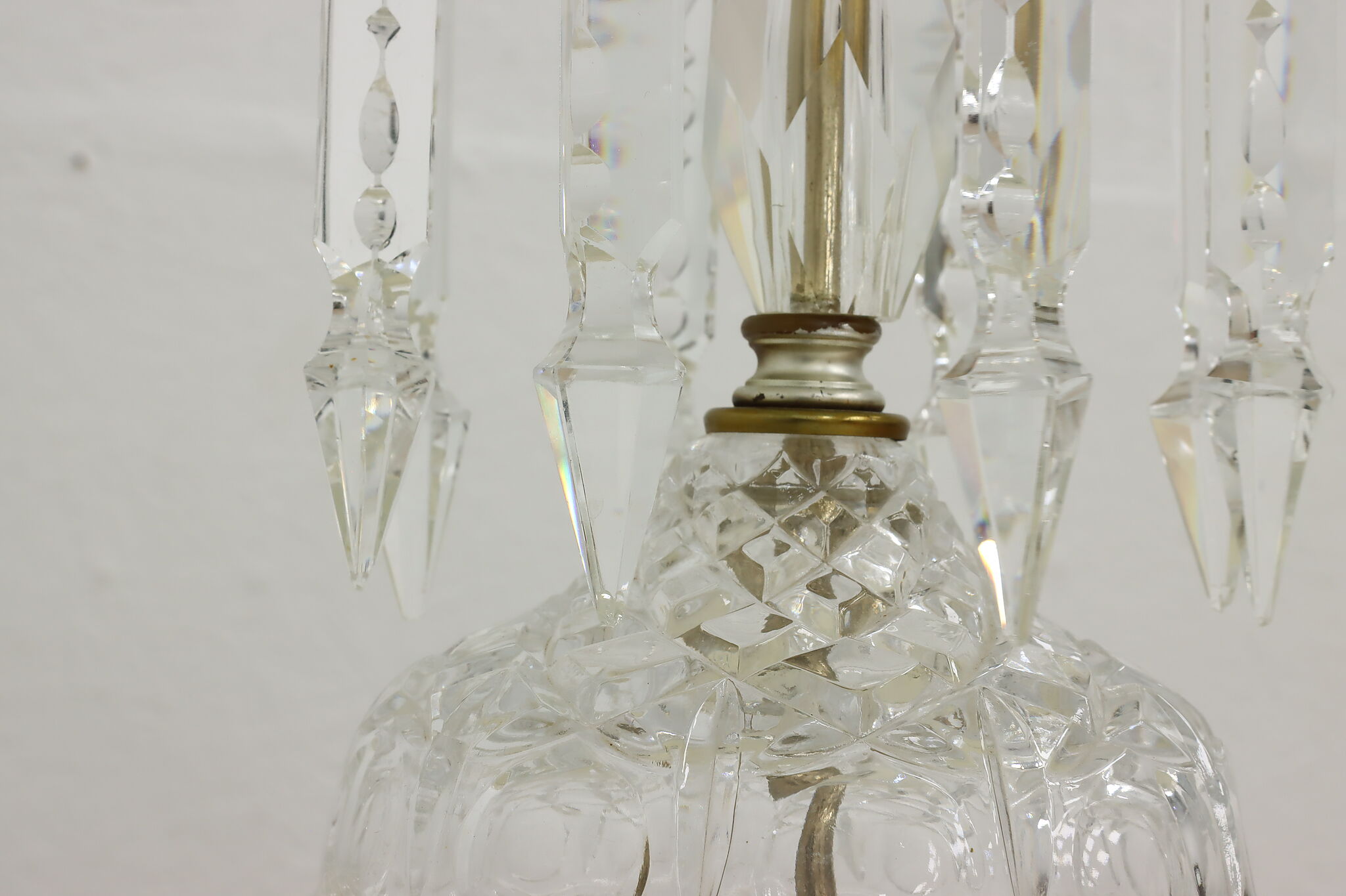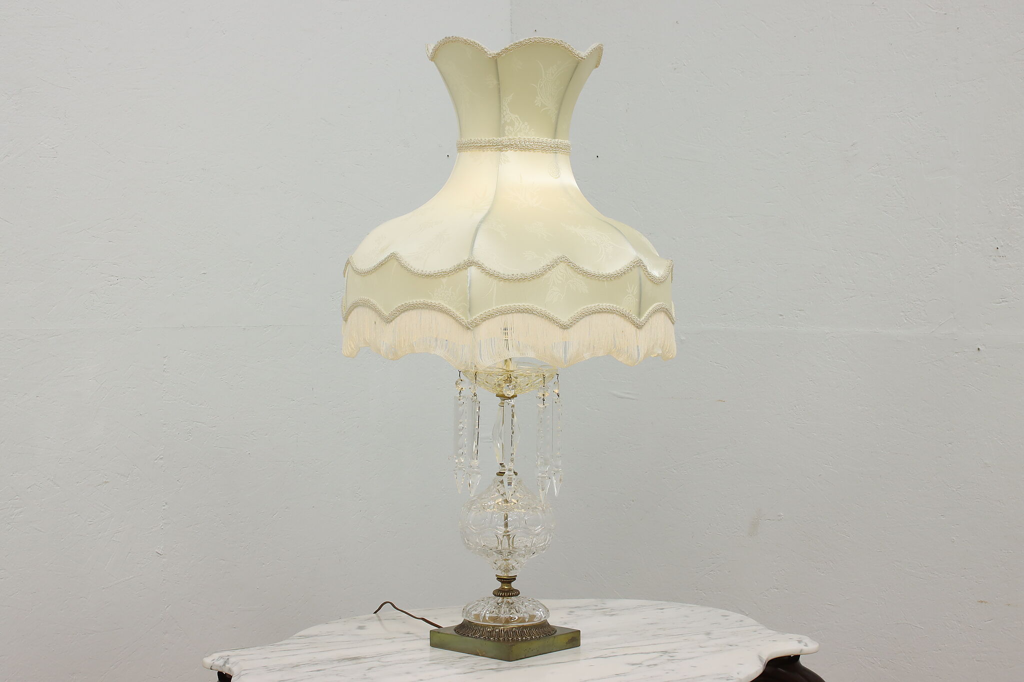 This beautiful lamp has large hanging cut crystal prisms for a dash of elegance.