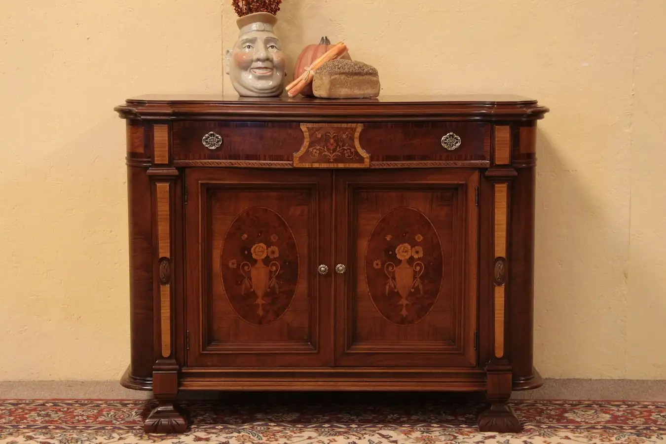 Extraordinarily well crafted in America, this is truly majestic antique furniture is from about 1925. Dimensions are 45" wide, 22" deep and 34" tall.