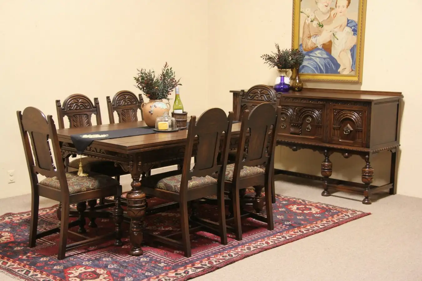 Richly carved of oak about 1925 in the English Tudor manner of Henry VIII, this dining set includes a table with two draw or pull out leaves, six chairs and a sideboard, server or buffet.