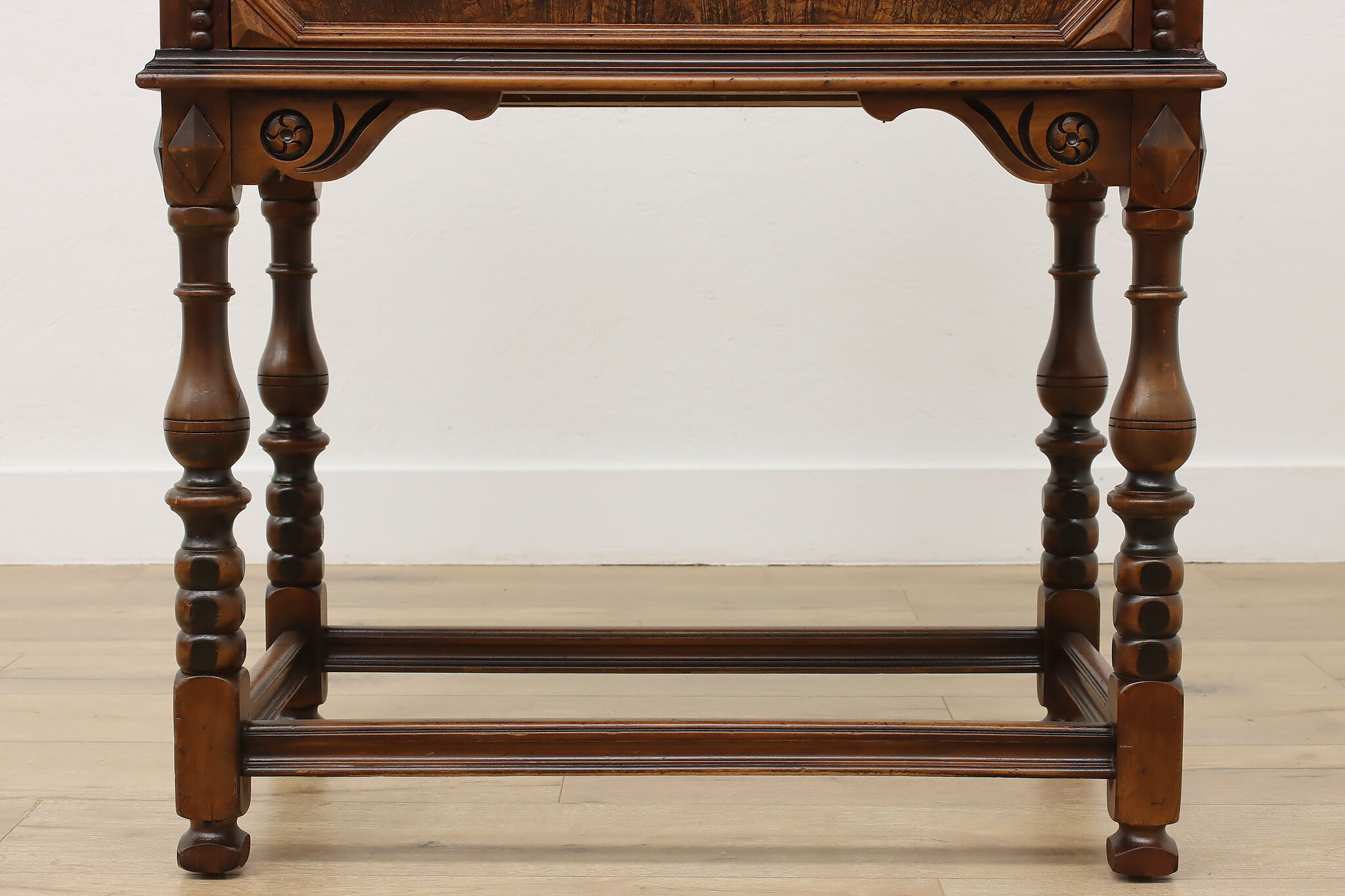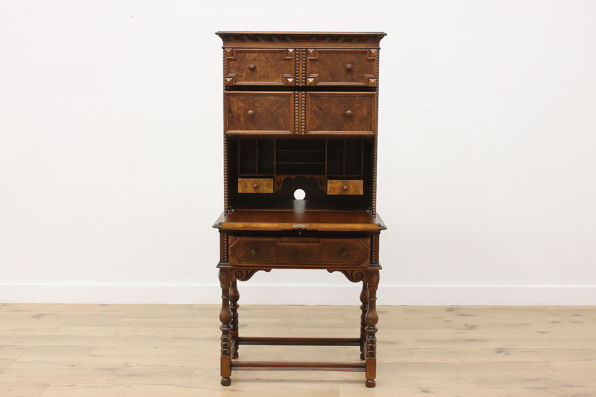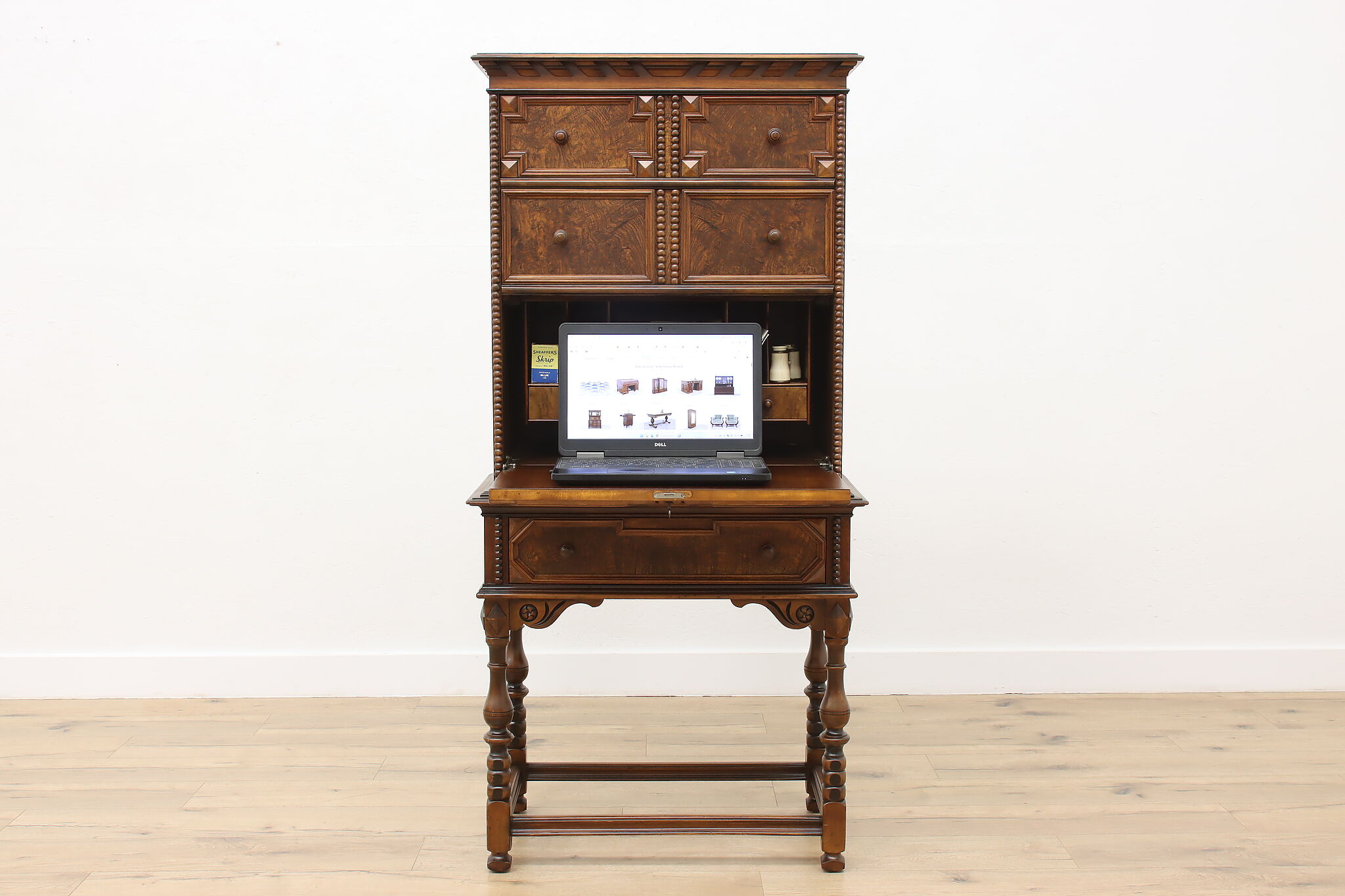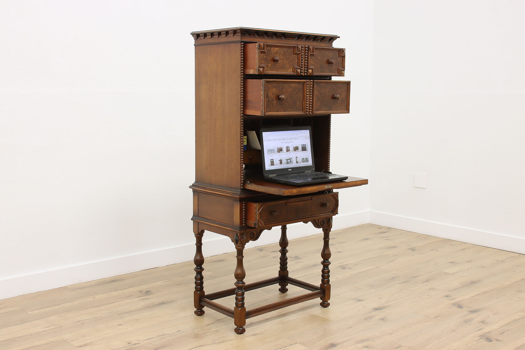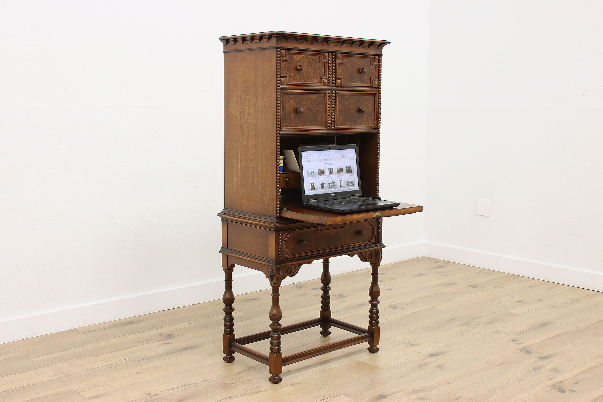 Looking for a secretary desk that has antique character with modern day practicality? This Tudor design beauty is an excellent option that works well with a laptop and can be folded away after use.