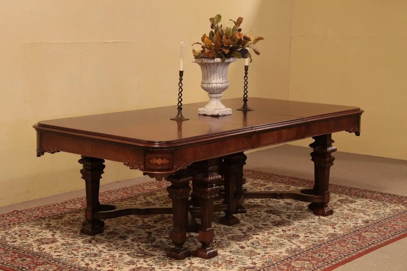 This spectacular carved dining table in English Tudor or Renaissance style includes a wide leaf and is made by famous American maker, "Rockford."