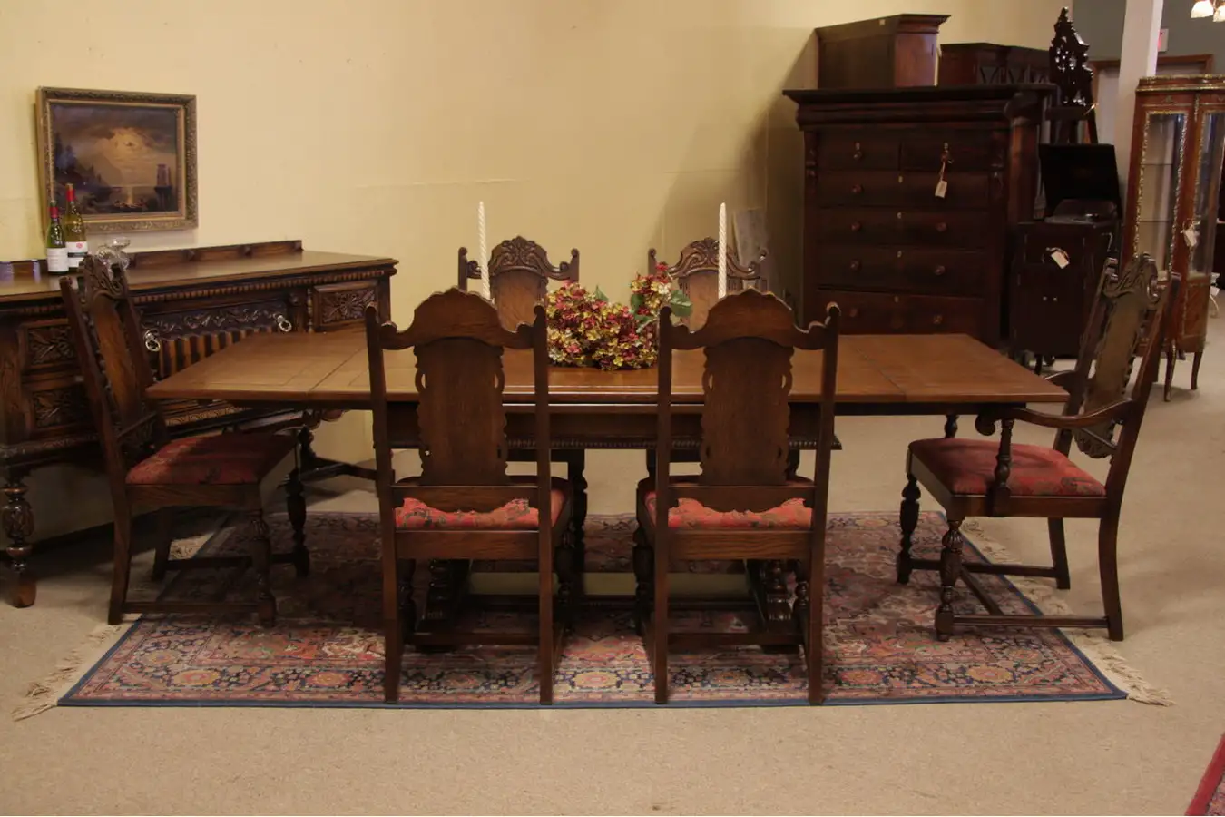Richly carved of oak in the English Tudor or Renaissance style, this 8 piece dining set includes a table with 2 draw leaves, 6 chairs and a long sideboard or buffet. The gleaming medium brown finish is impeccable, all pieces are sound and sturdy furniture.