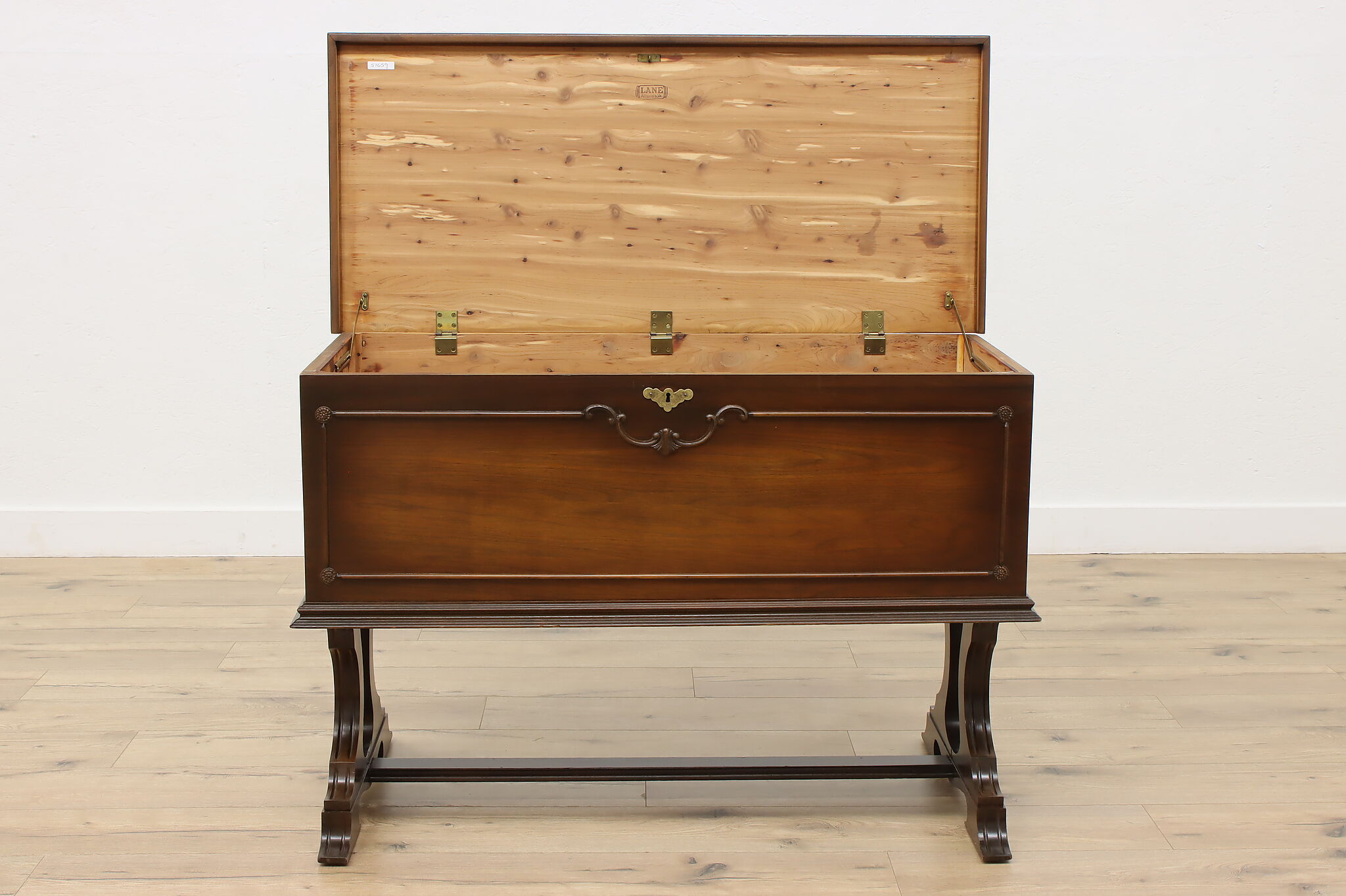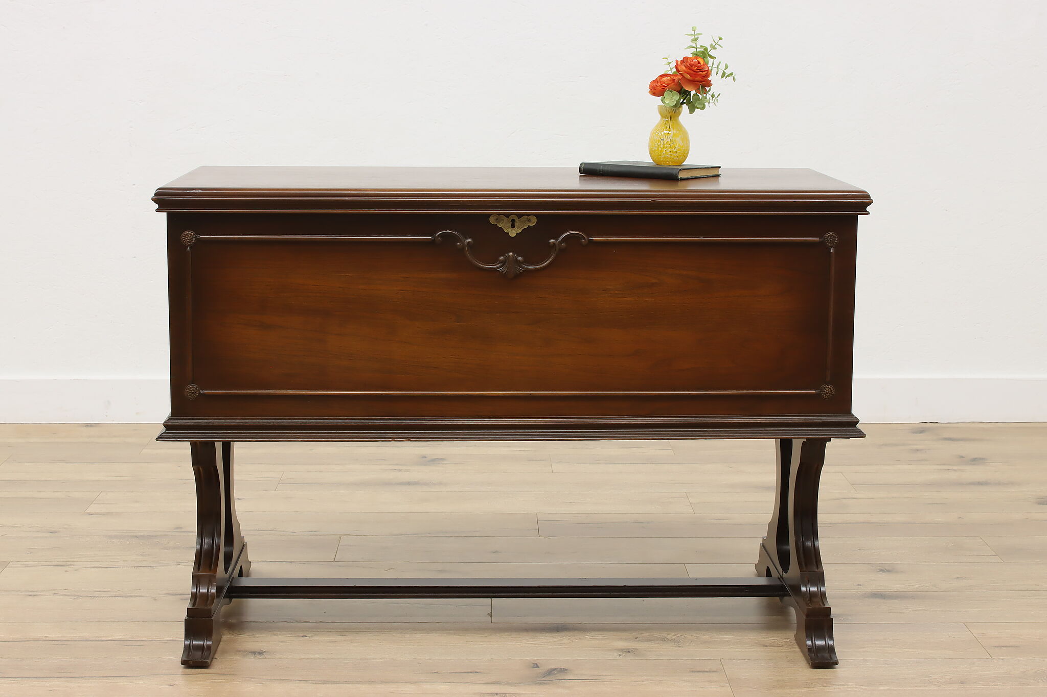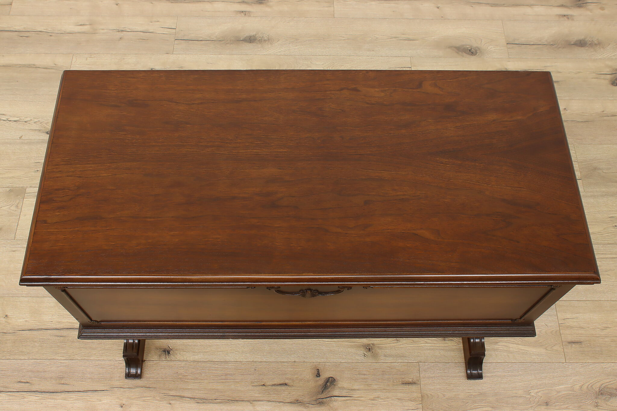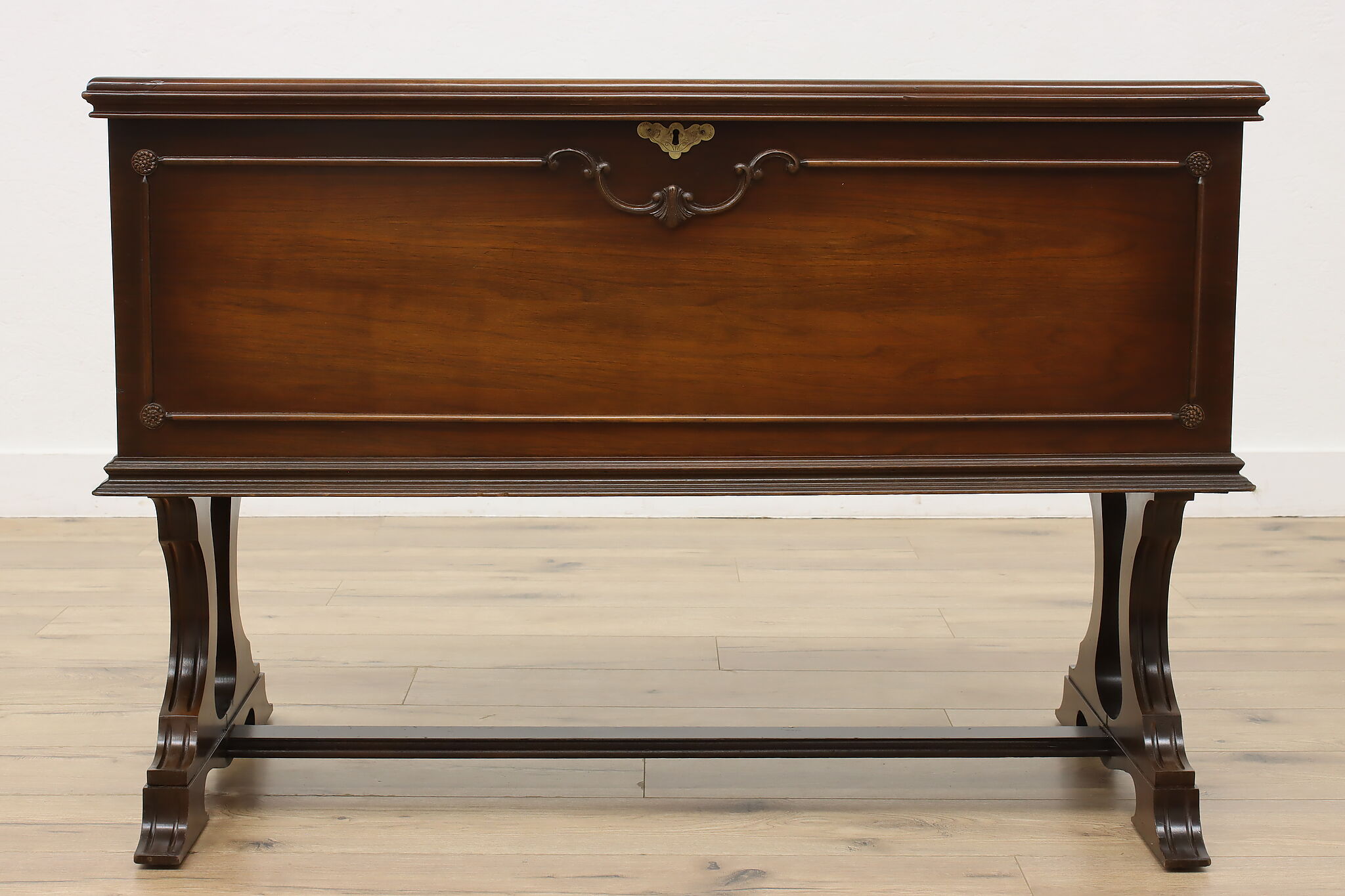 This Tudor design blanket chest or storage trunk is lined with cedar to keep your wool sweaters safe.