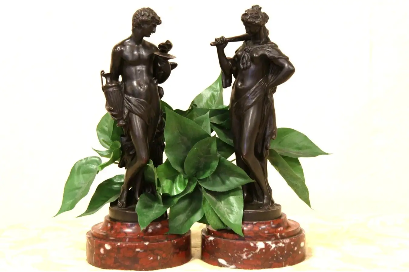 Companion bronze is a Classical Bronze Sculpture of a Man & Eagle mounted on a red Marble Base. This bronze statue in classical style depicts a man with an eagle and pitcher, mounted on a red marble base. There are tiny rough spots on the edges of the marble base, height is 12 1/2."