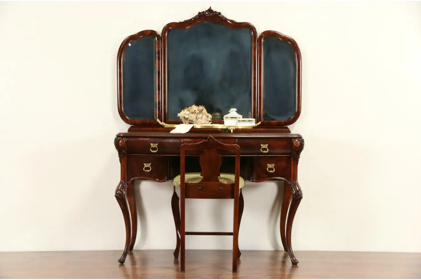 There is a brass plate from the retailer, "Revelle of Chicago." Matched flame grain mahogany has an excellent gleaming finish. Lavishly curved and carved, drawers have dovetailed joints. Embossed brasses are original, the key operates all locks on this American made vintage furniture. Beveled and shaped hinged mirrors are removable and have a little antique "smoke" to show their age.