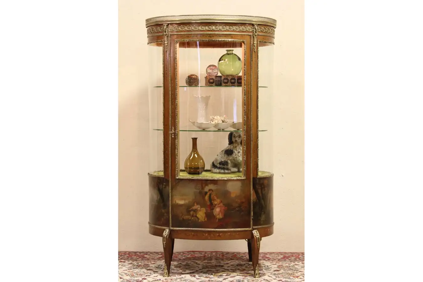 Charming hand painted courting scenes recall the 18th Century manner. An interior light was added later with standard American wiring. The lower removable shelf and interior have worn original velvet, and could be recovered if desired. Plate glass shelves have polished edges and are removable.
