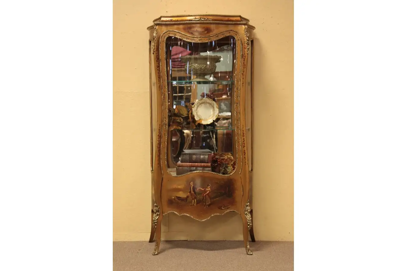 This outstanding curved glass curio display cabinet or "vitrine" is all original, and hand-painted with the famous "Vernis Martin" frosty golden finish. The burnished cast bronze mounts are exquisite, the artistic paintings of cherubs and courting scenes is subtle.