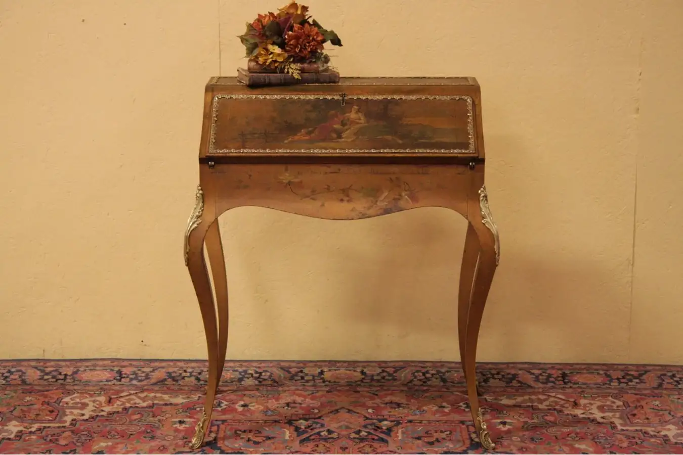 This charming antique secretary desk is handpainted, with a "Vernis Martin" finish of translucent gold dust. The historic "frosted" finish technique was developed in the 1700's, and is skillfully applied over delicate hand painting.