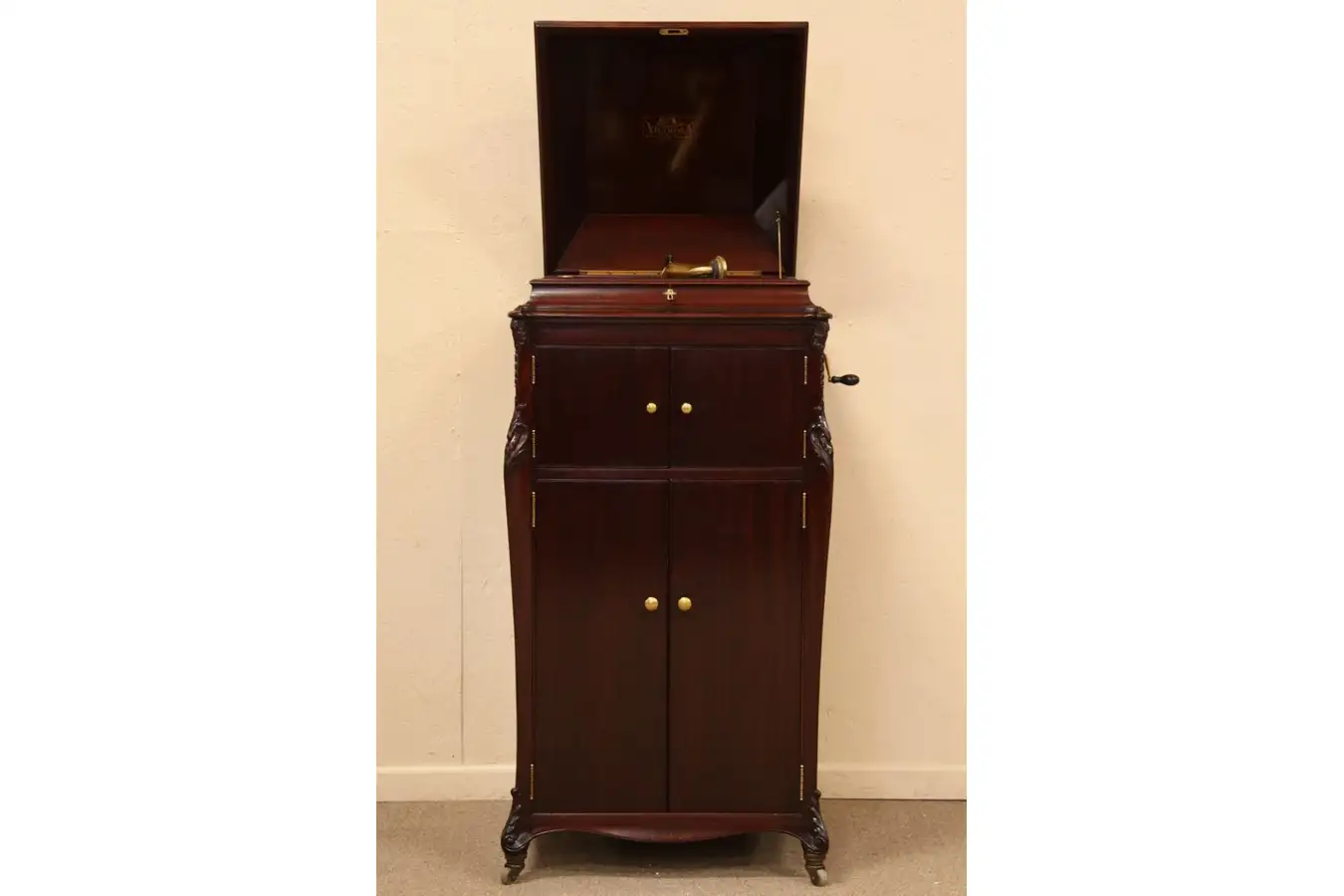 This Victrola or Victor Talking Machine record player is model VV-XVI from around 1910. The carved mahogany case has a gleaming original and remarkably well-preserved finish, see photos of minor scratches. Gold plated hardware is all original on this top-of-the-line large size model.