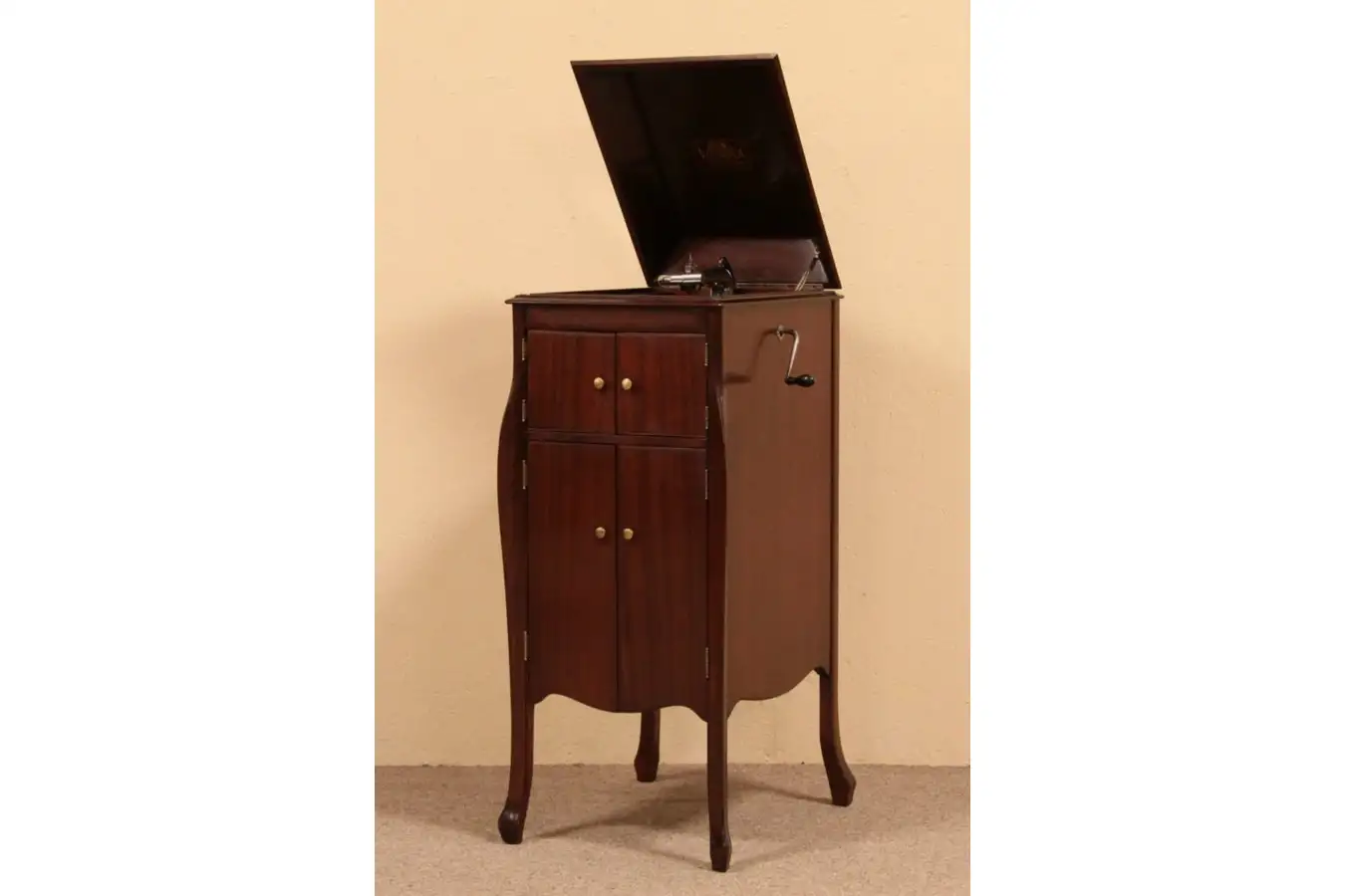 This Victrola or Victor Talking Machine record player is model VV-X from around 1915. The mahogany case has a warm reddish brown finish, and is in very fine condition with only minor scratches. Nickel over brass hardware is all original.