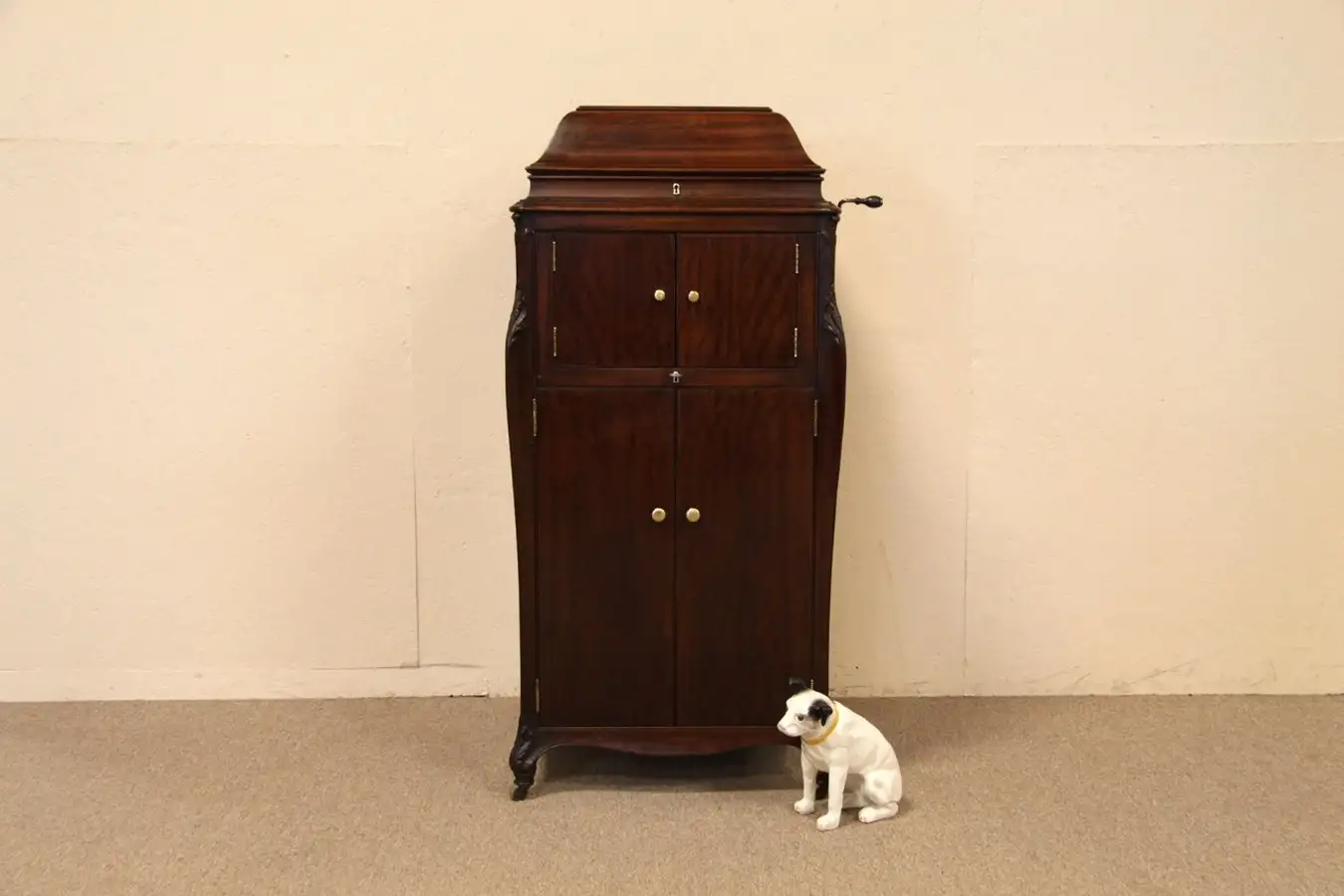 This player works well, the speed control is operational and there is an automatic shutoff at the end of play. Crank is removable, the spring motor is in good running order. Volume control is soft (both doors closed), medium (one door open) and loud (both doors open).