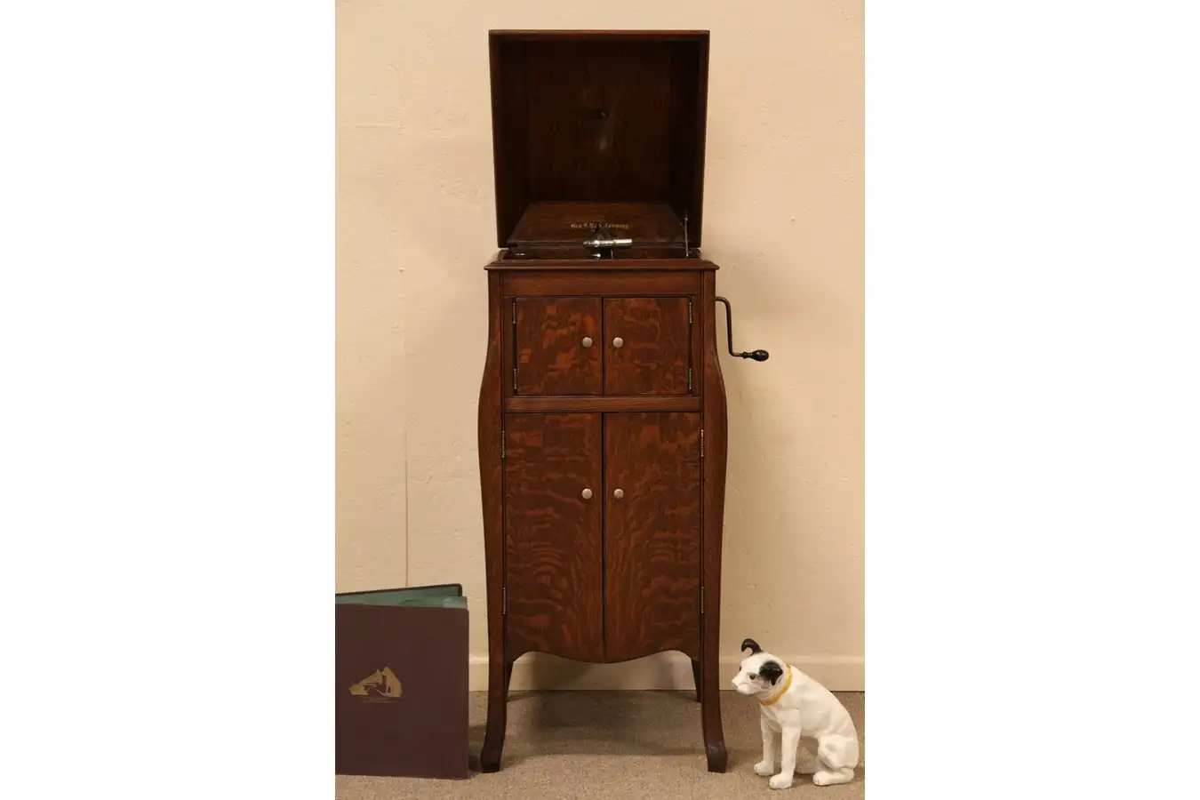 In the lower record storage area are three original albums of various records. The famous "His Master's Voice" design with the dog "Nipper" is under the lid.