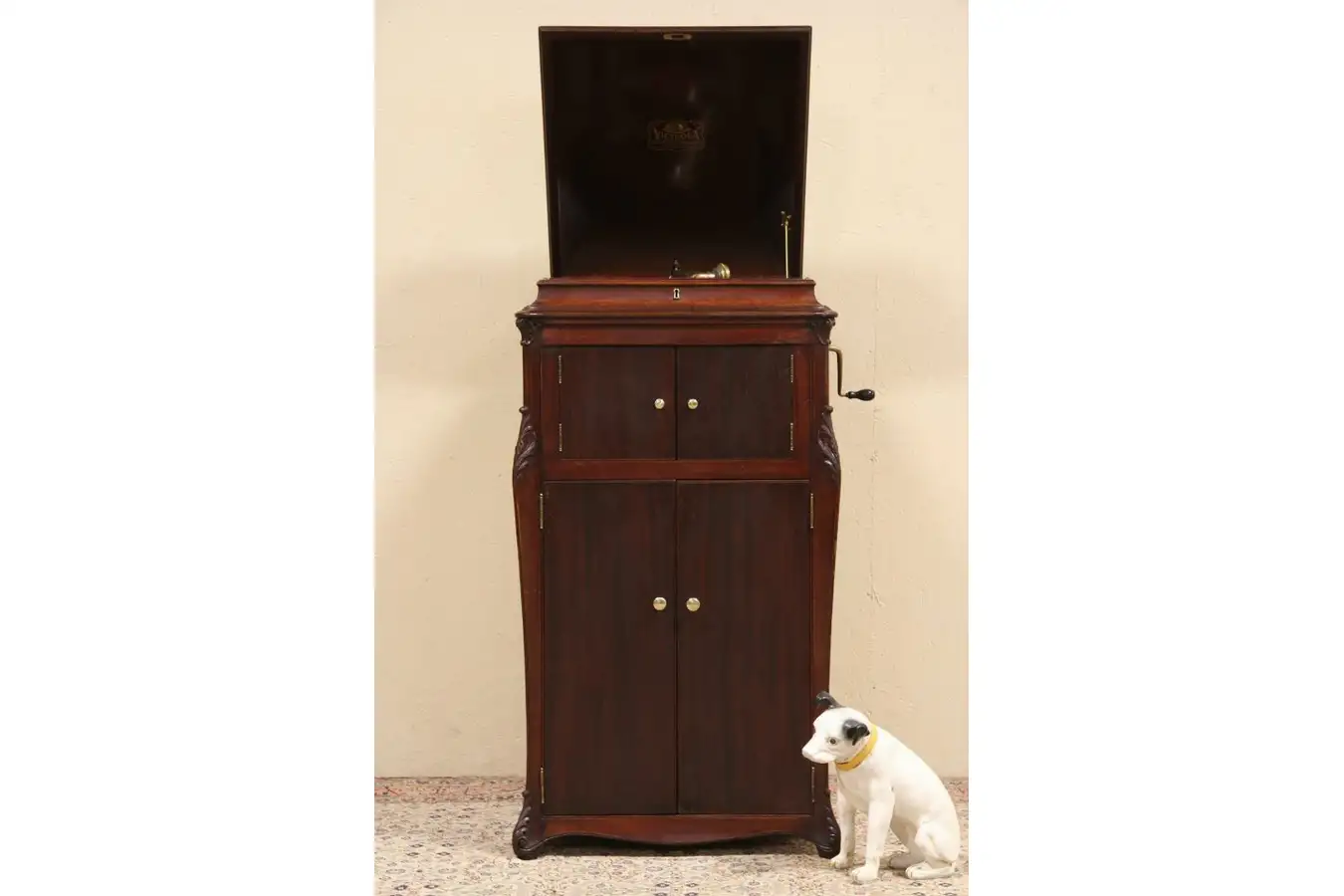 This player works well, the speed control is operational and there is an automatic shutoff at the end of play. Crank is removable, the spring motor is in good running order. Volume control is soft (both doors closed), medium (one door open) and loud (both doors open).