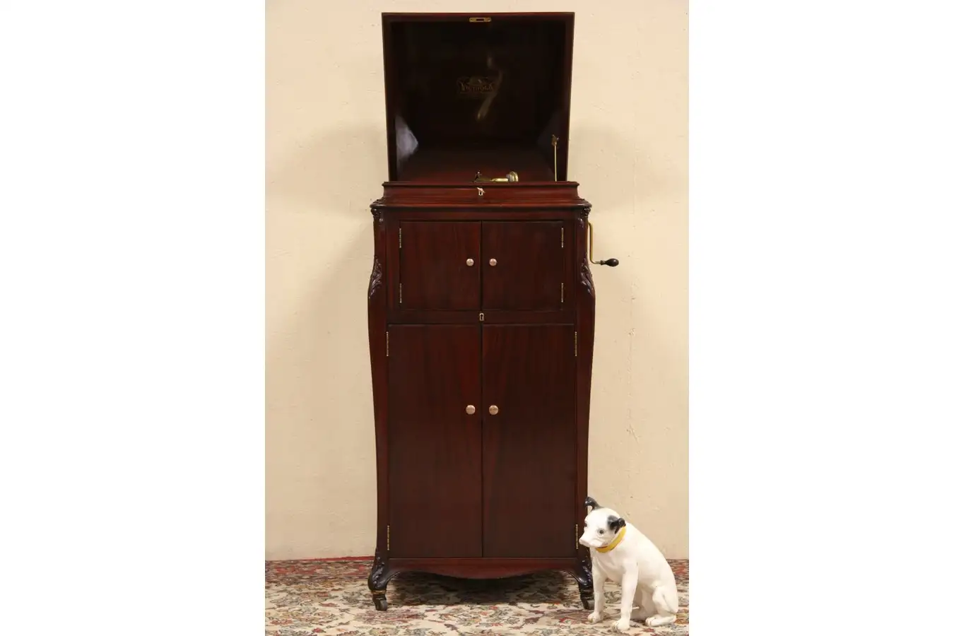 There are minor mars and fine crackling or crazing for antique character, see photos. Gold plated mounts are in excellent condition, there are on/off and speed controls and working locks. Volume control is soft (both doors closed), medium (one door open) and loud (both doors open). The graceful case has delicate carving. Signed "Victor Talking Machine Co.," the famous "Nipper" dog mascot is under the lid.