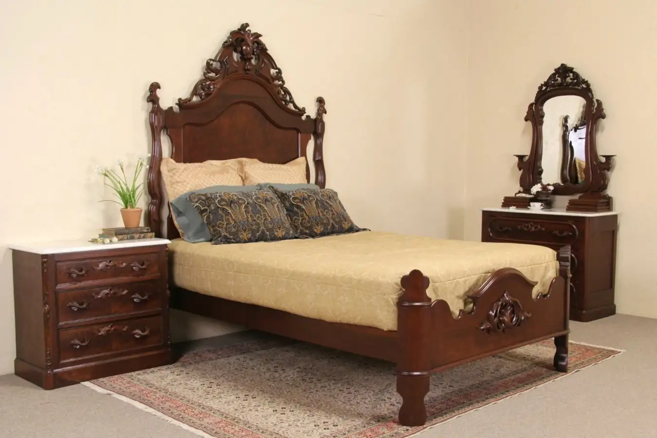 Richly carved in the 1860's, this three piece bedroom set includes a queen size bed plus a marble top dresser and a bedside chest. Solid walnut has an excellent finish on this American made antique furniture. Three dimensional details show masterful artistry.
