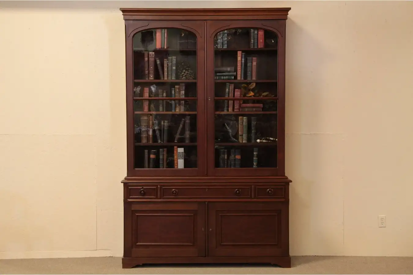 This bookcase has the original arched wavy glass doors and a pull-out desk with an adjustable leather top. Hand-made of solid walnut in the 1860's Civil War era, the upper section has shelves adjustable on wooden supports.