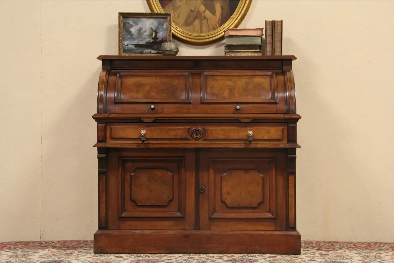 Hand crafted about 1875, this gracious and functional Victorian secretary desk has a cylinder or barrel roll top. Solid walnut with matched burl panels, the original finish has warm patina with just enough wear and mars for antique character. The top shelf has been rebuilt and varnished for durability, the rest has been waxed and polished, so an occasional wipe with a soft dry cloth is all that is needed to maintain the warm luster.