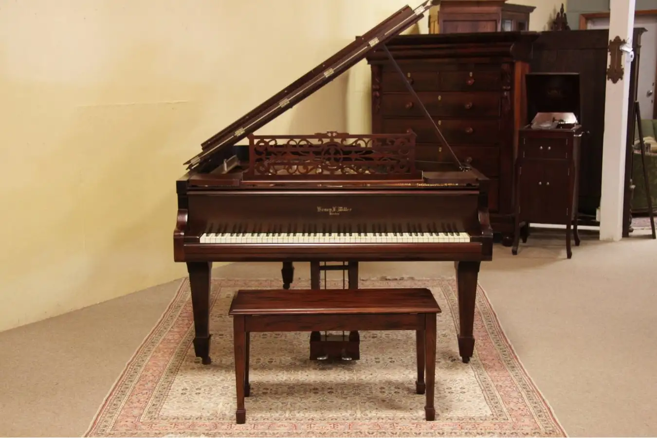 This Victorian grand piano is signed "Henry F. Miller, Boston," and dates from 1884. The case has a beautiful satiny finish on rosewood and mahogany, included is a bench with a matching finish.