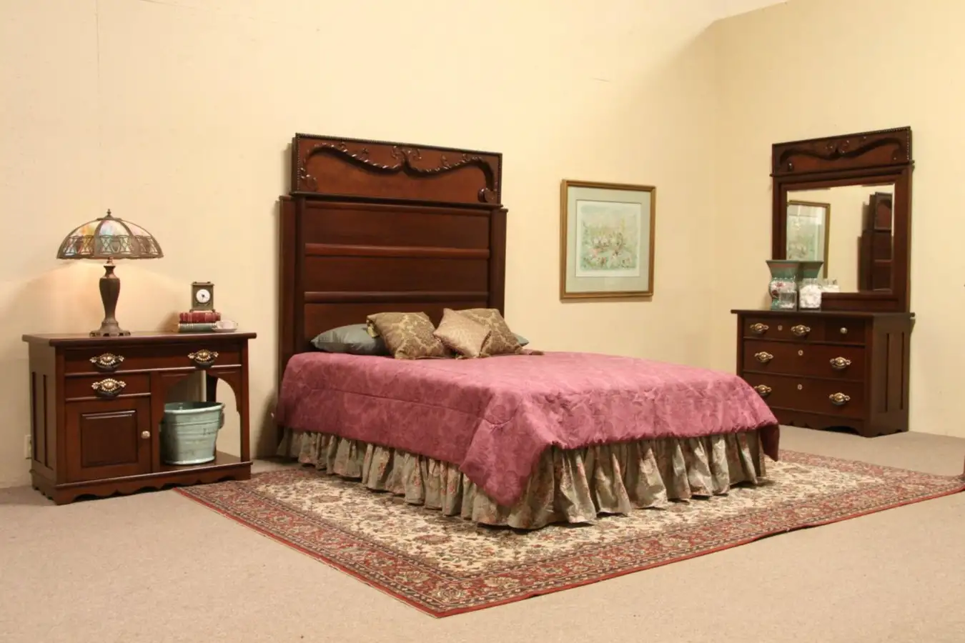 Carved of solid mahogany about 1885 during the Victorian period, this electic bedroom set includes a queen size headboard, dresser and mirror plus nightstand.