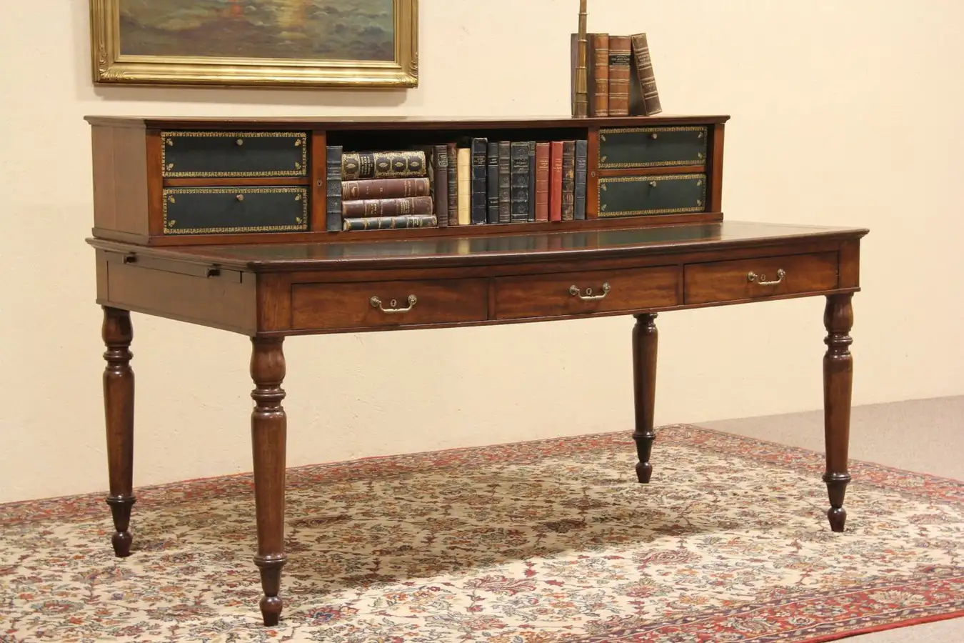 An unusual 1890 era Victorian writing desk has an upper gallery that can lock removable leather files. The writing surface is also gold tooled leather with a few mars and separations from age, see photos. There are two pull out shelves on each side, and this desk is finished on all sides - see photos. Note the gentle sway of the desktop due to age.
