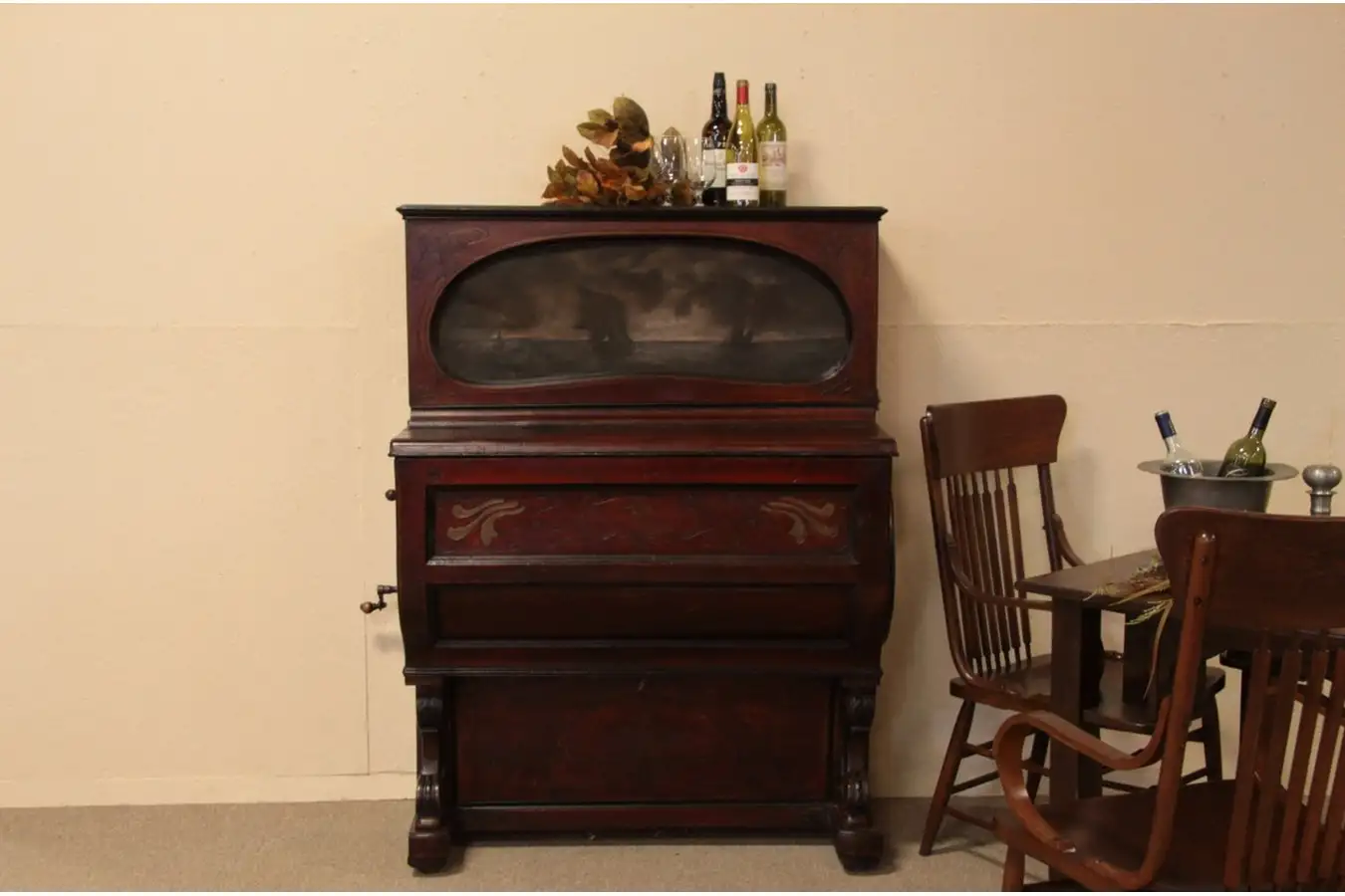 An authentic coin-operated barrel piano plays 10 French tunes, and is a larger version of the Victorian street piano or roller piano. The carved case has an oil painting, there is a wind-up mechanism and another crank to adjust the barrel to play 10 different French tunes shown on an indicator dial and hand-written list.