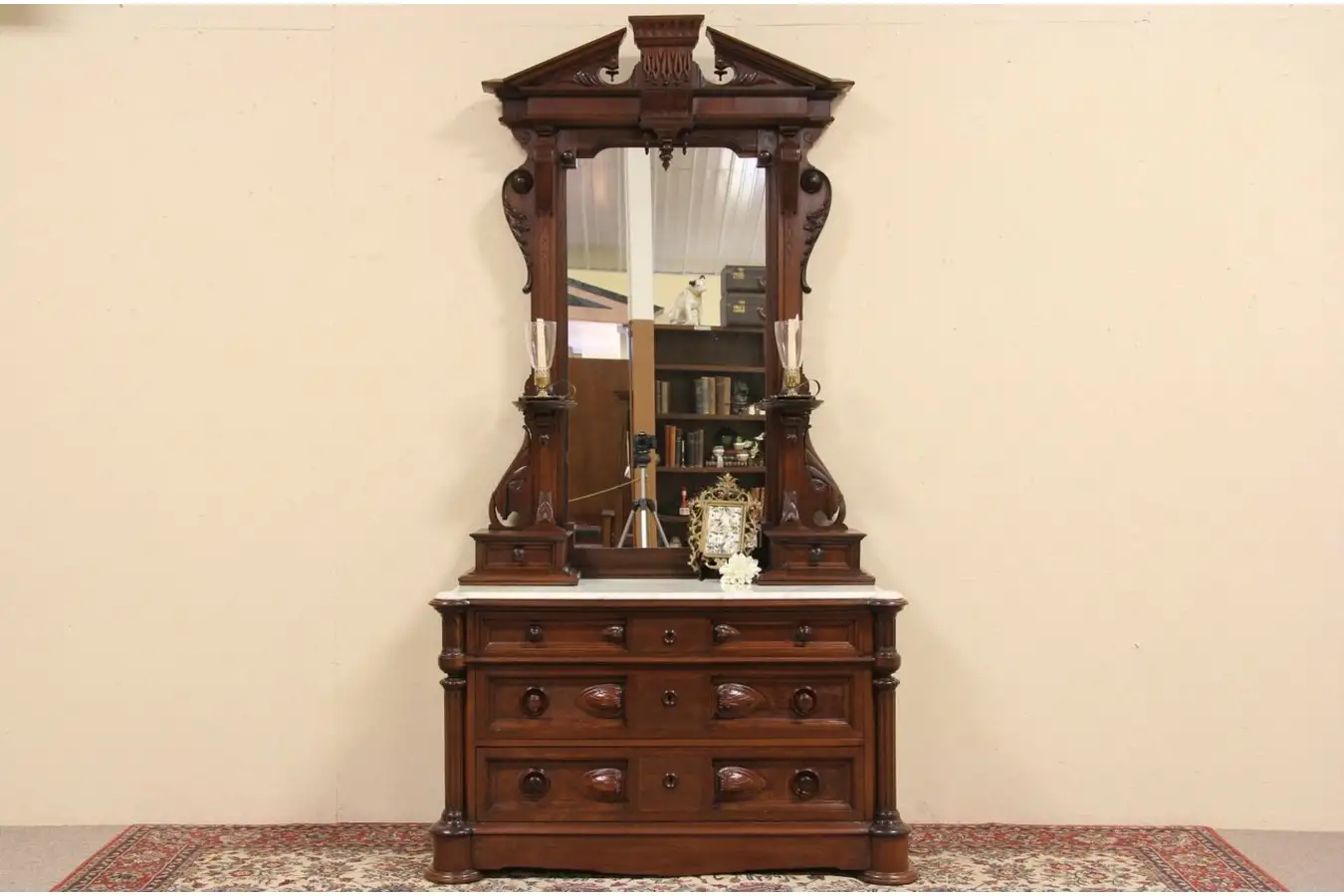 Carved during the Victorian period about 1875, a grand solid walnut dresser has a marble top and mirror. The finish is in excellent condition, enhancing burl grain panels, with small mars at the edges. The marble is in very fine condition and has been polished and sealed, there are minor stains, see photos. There is a little golden "smoke" to the mirror to show its age.