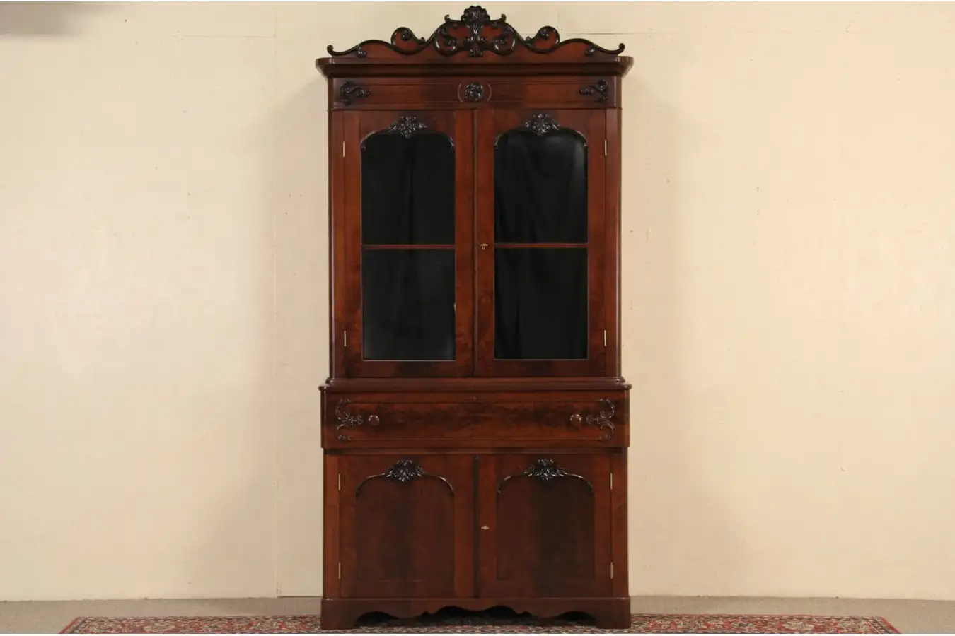 The removable bookcase has wavy glass mirrors that appear original, interior shelves adjust on wooden supports. Both door locks and keys still work. The hand planed back is secured with square cut nail.