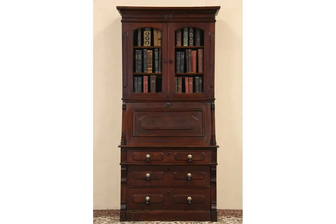 A classic Victorian period secretary desk with bookcase top was crafted of solid walnut and burl panels around 1880.