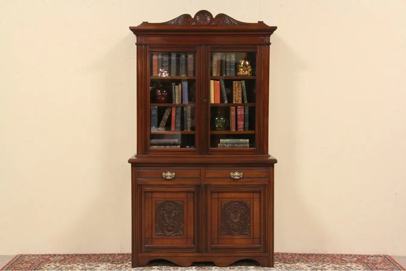 Whether used as a bookcase or display cabinet, this carved mahogany antique from about 1900 has understated fine detailing.