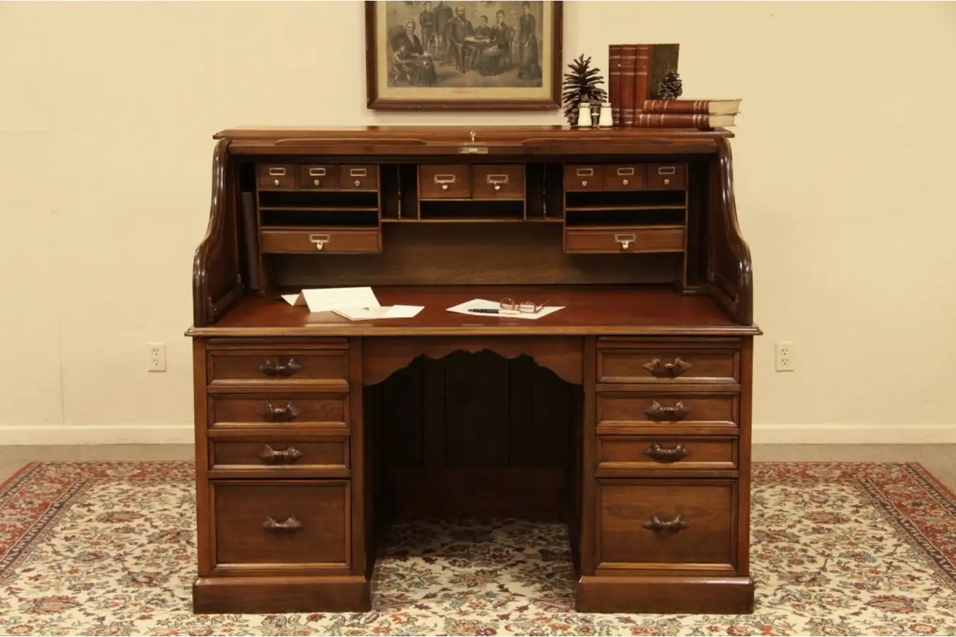 This antique "S" curve roll-top desk dates from about 1885 and is paneled and finished on all sides, it has original hand-carved drawer pulls. New saddle leather in the top and both pull-out shelves has natural variations and grain. The rich deep finish is in excellent condition with warm antique patina. There is a working lock on the roll top, which slides smoothly.