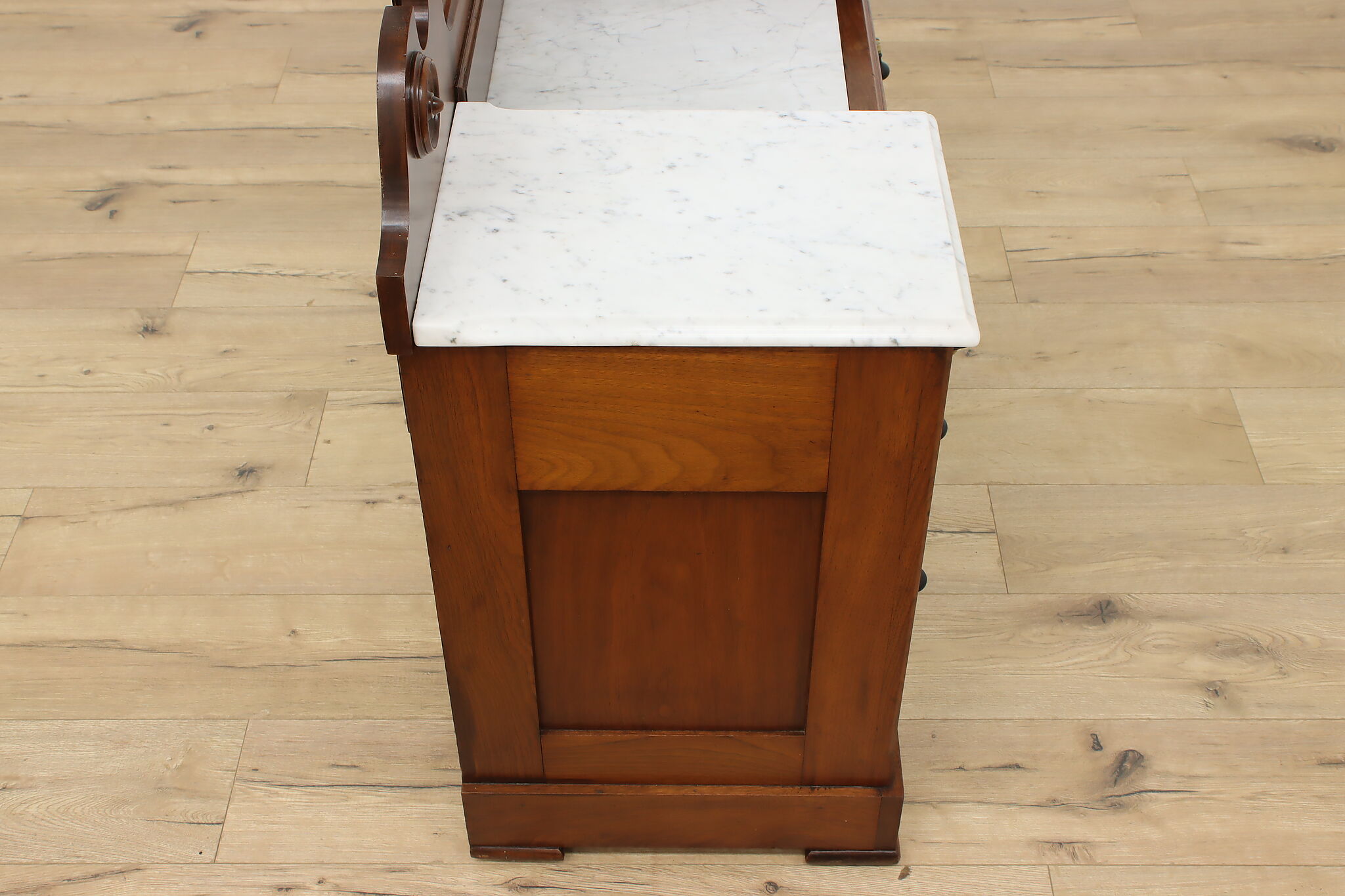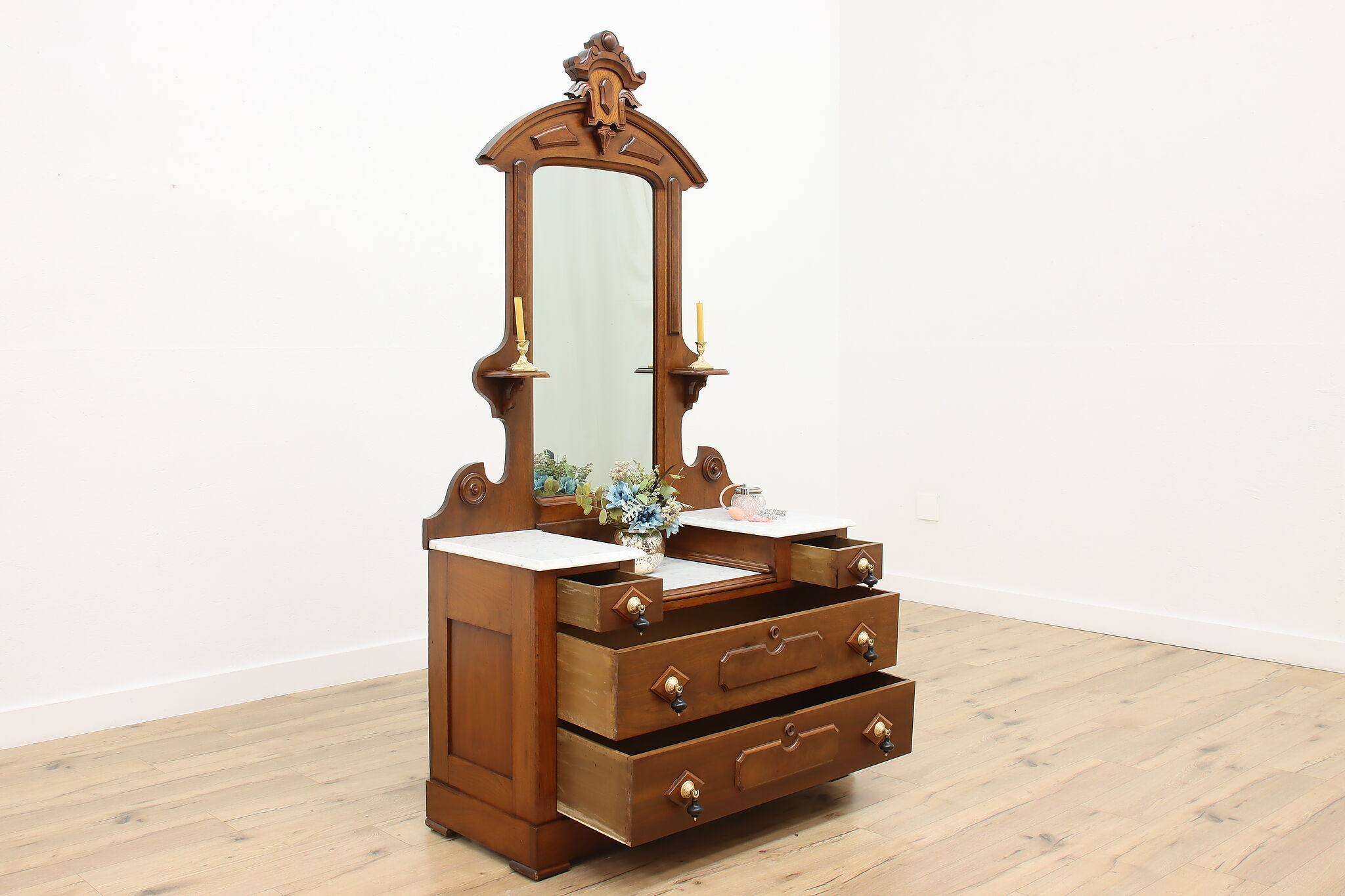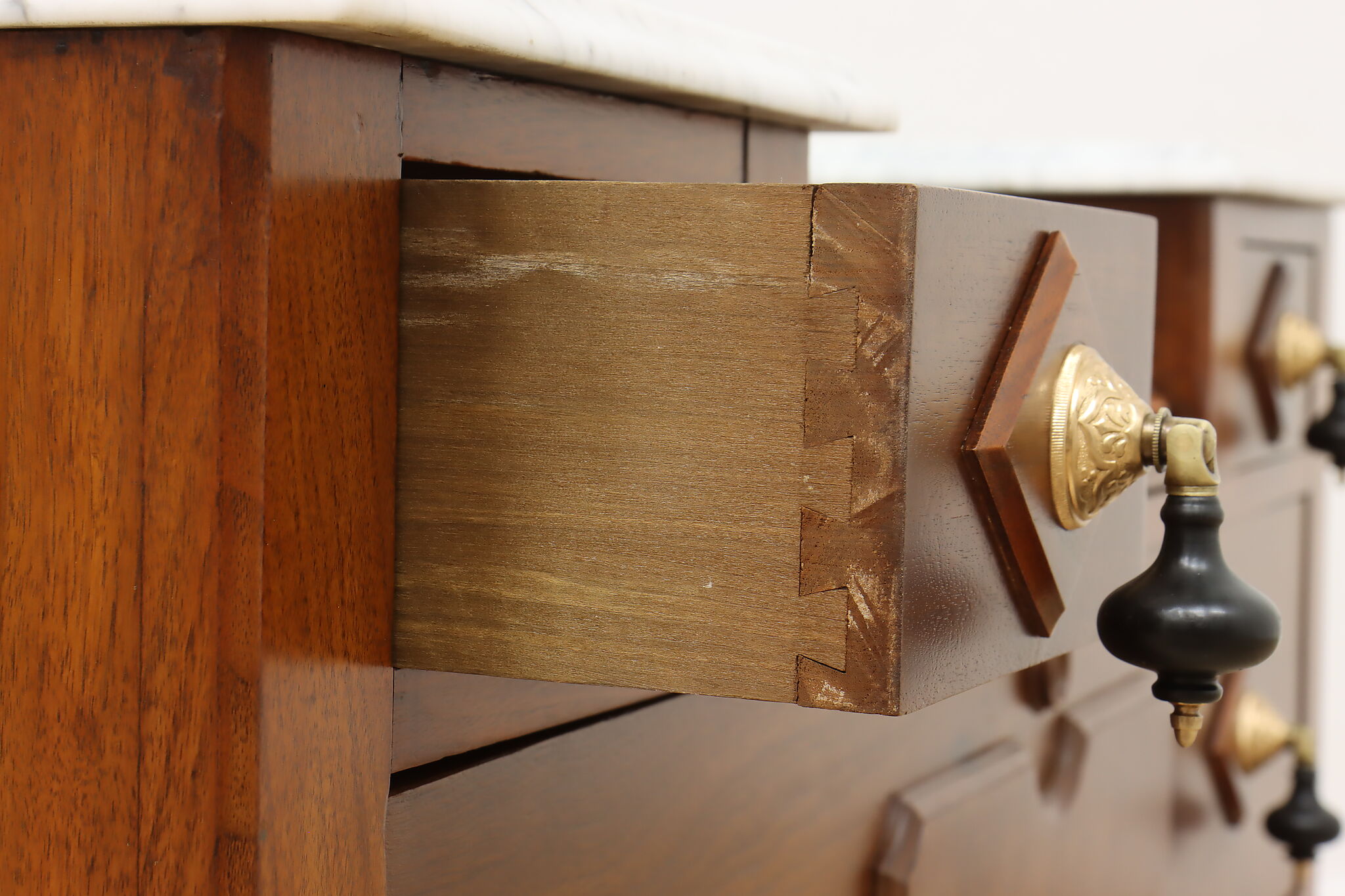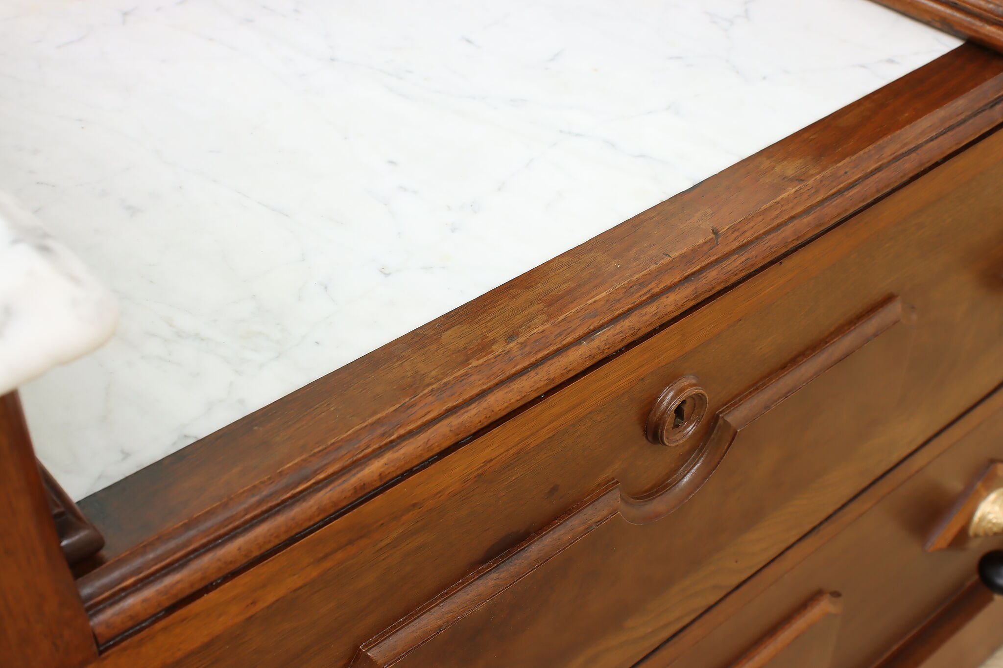 This Victorian period dresser or chest is adorned with beautiful white marble tops for a polished, elegant look.