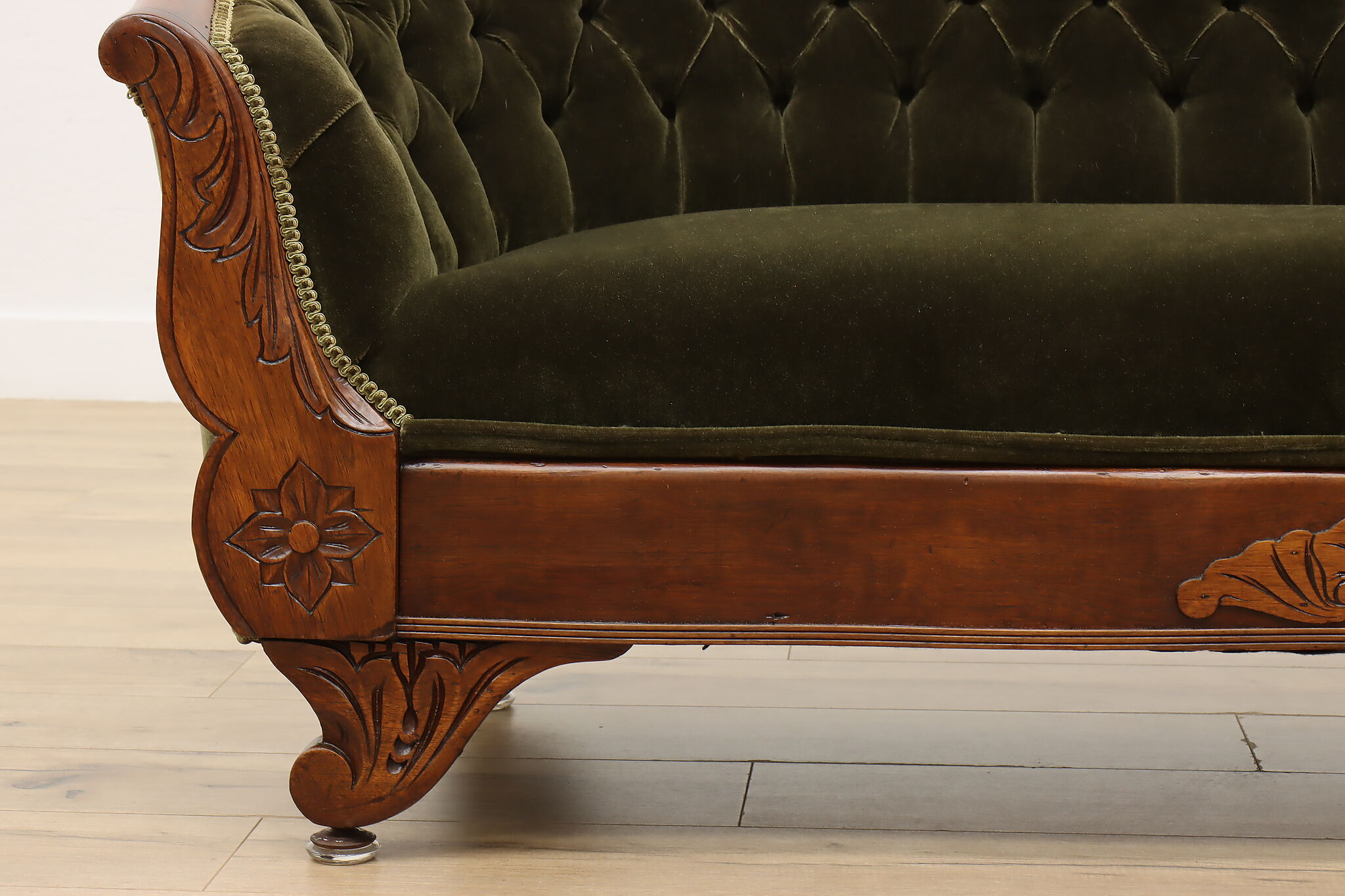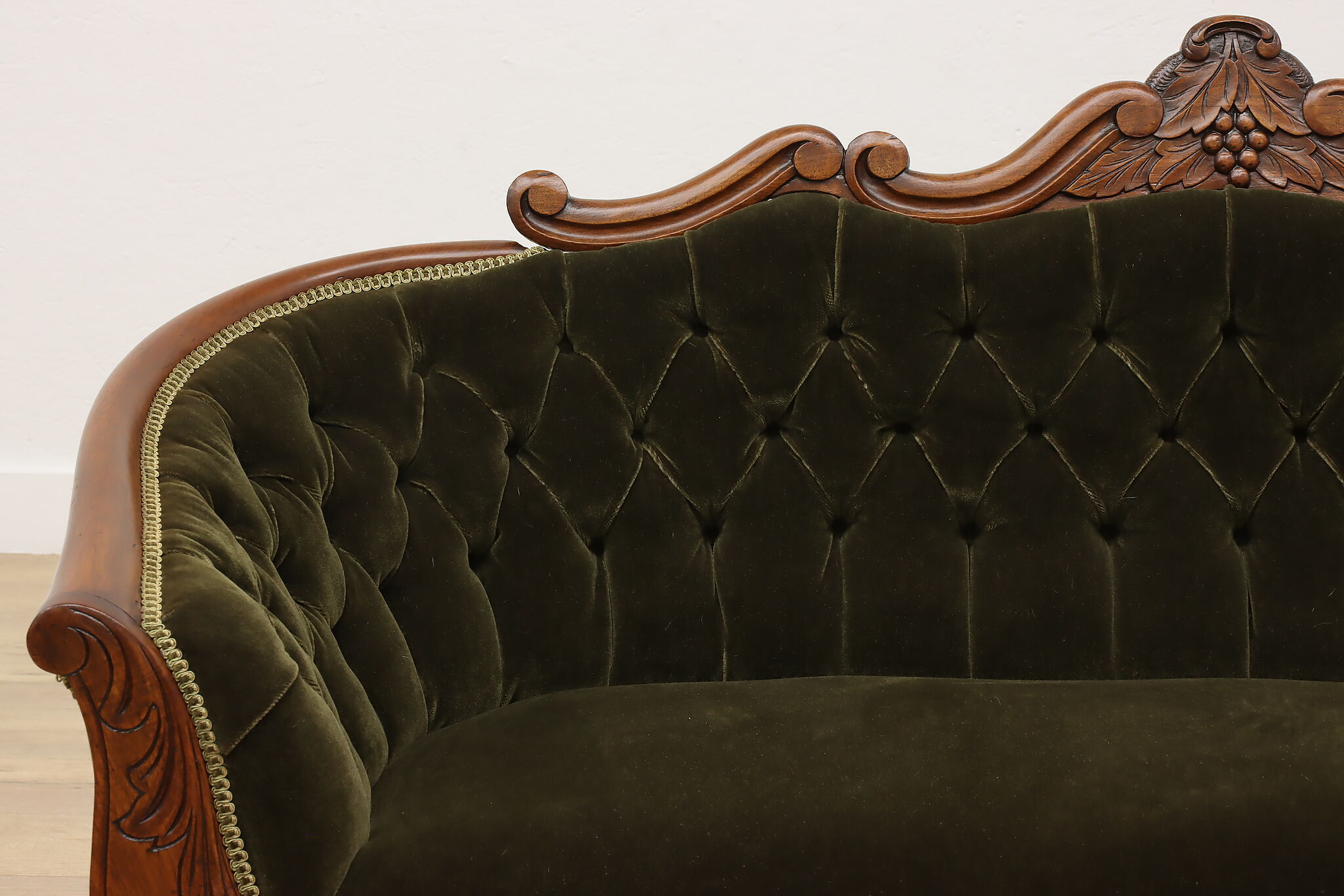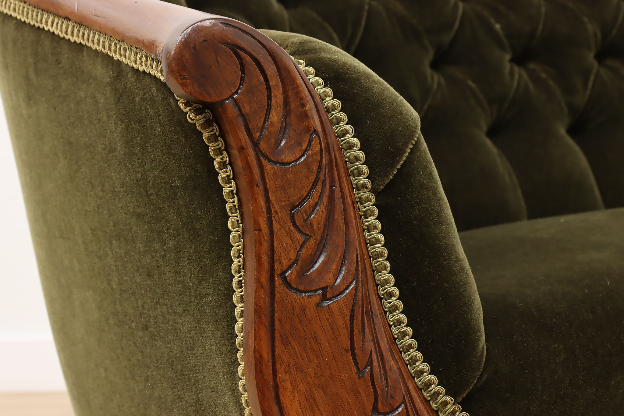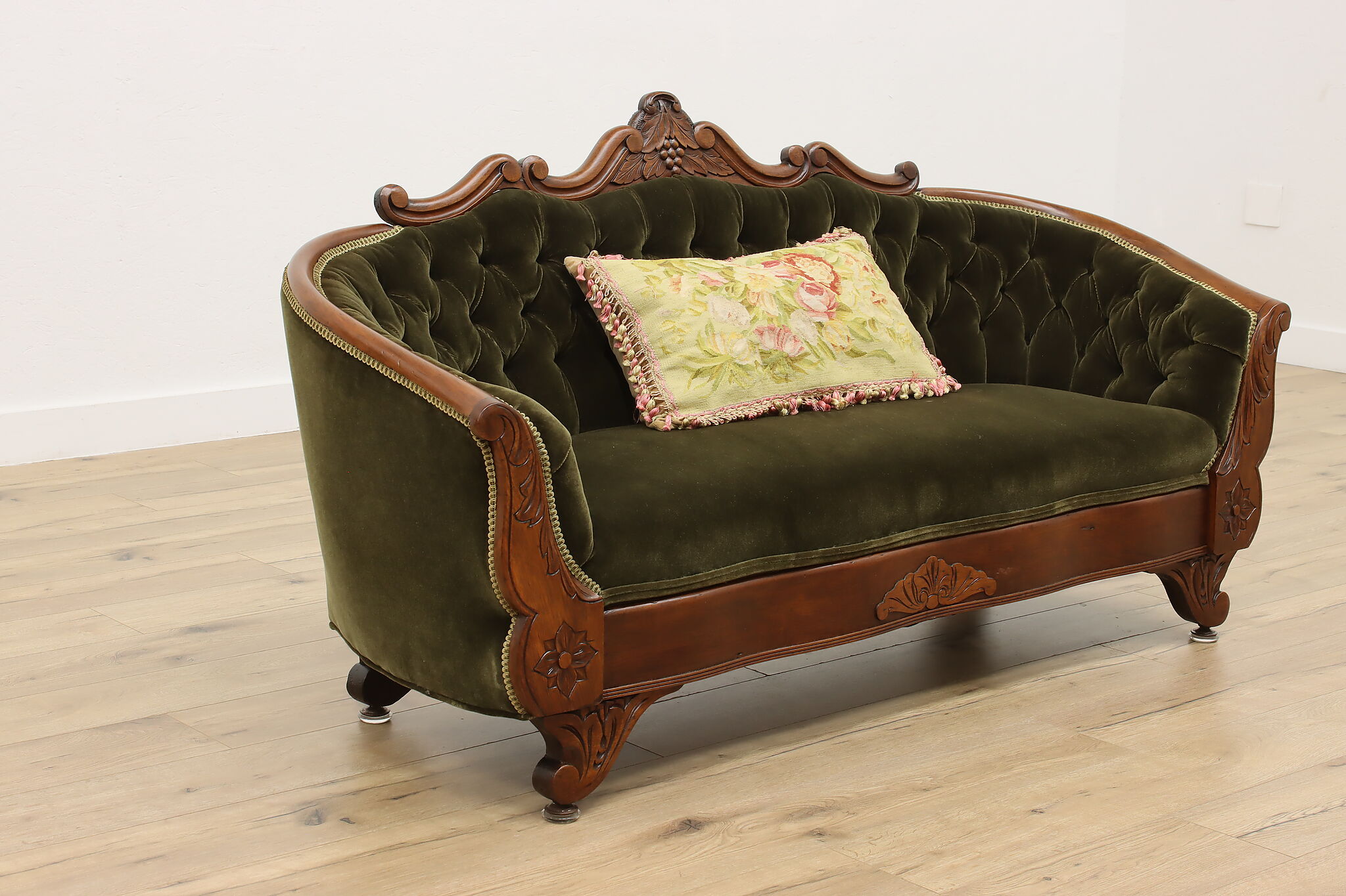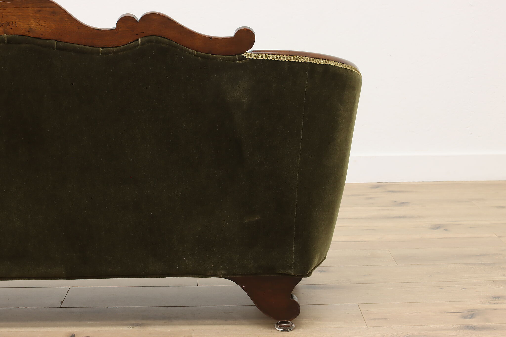 The lovely green genuine mohair upholstery on this Victorian period loveseat, settee or sofa is the perfect compliment to a study or library.