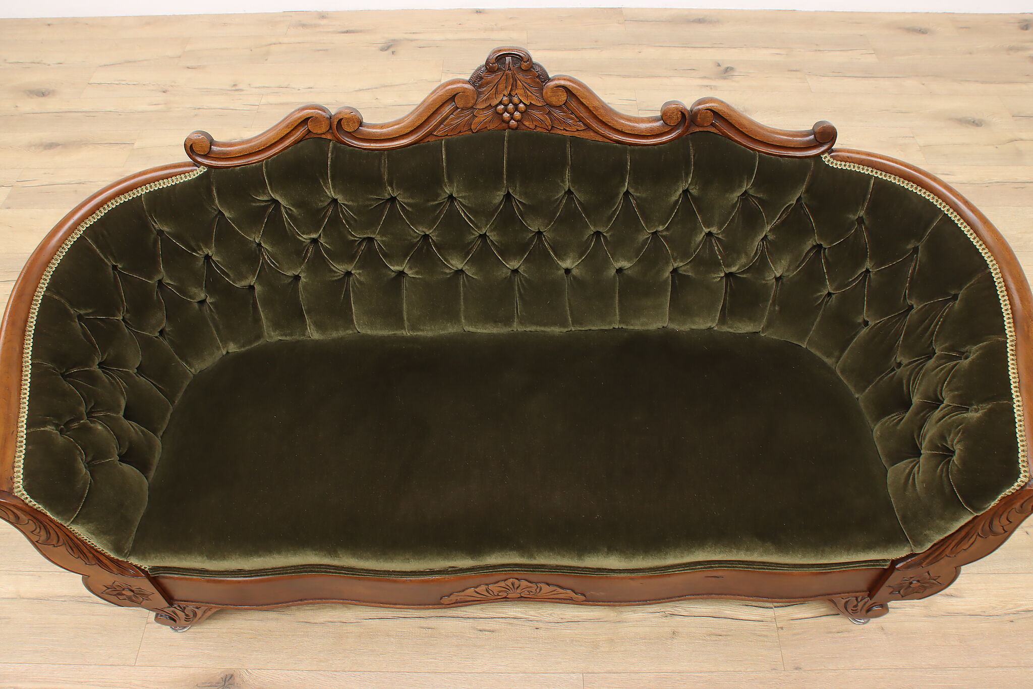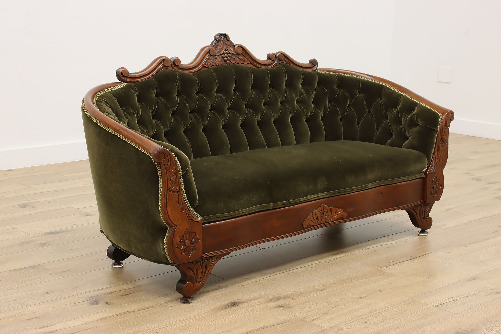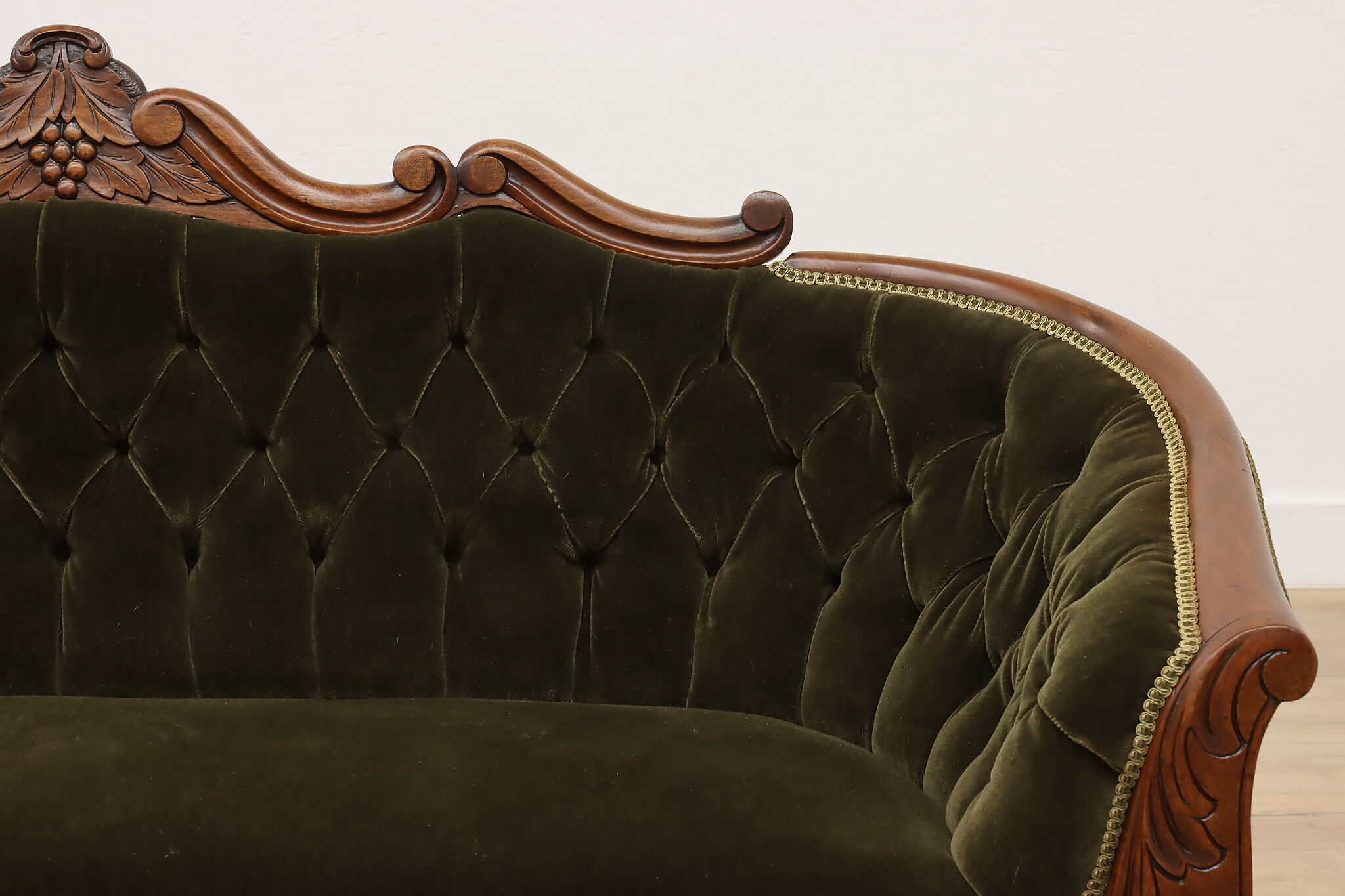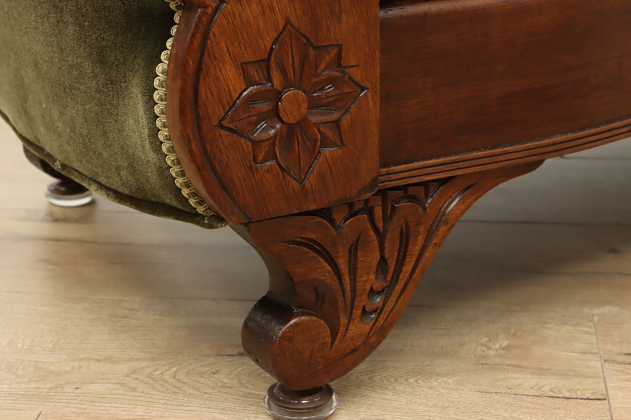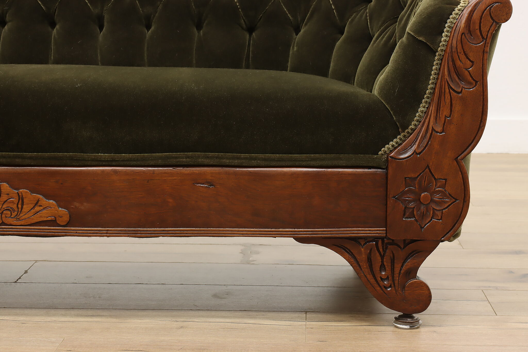 The lovely green genuine mohair upholstery on this Victorian period loveseat, settee or sofa is the perfect compliment to a study or library.