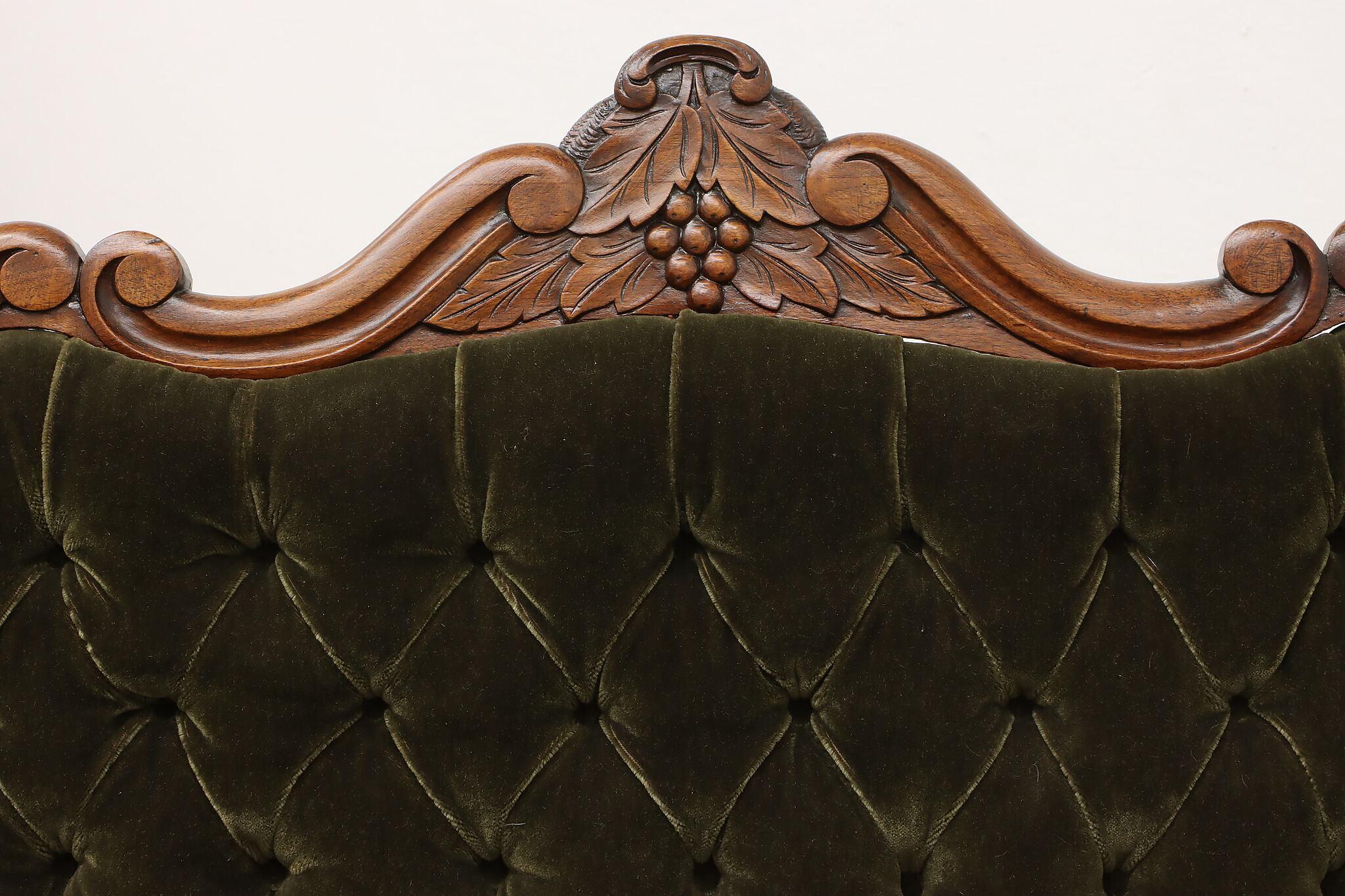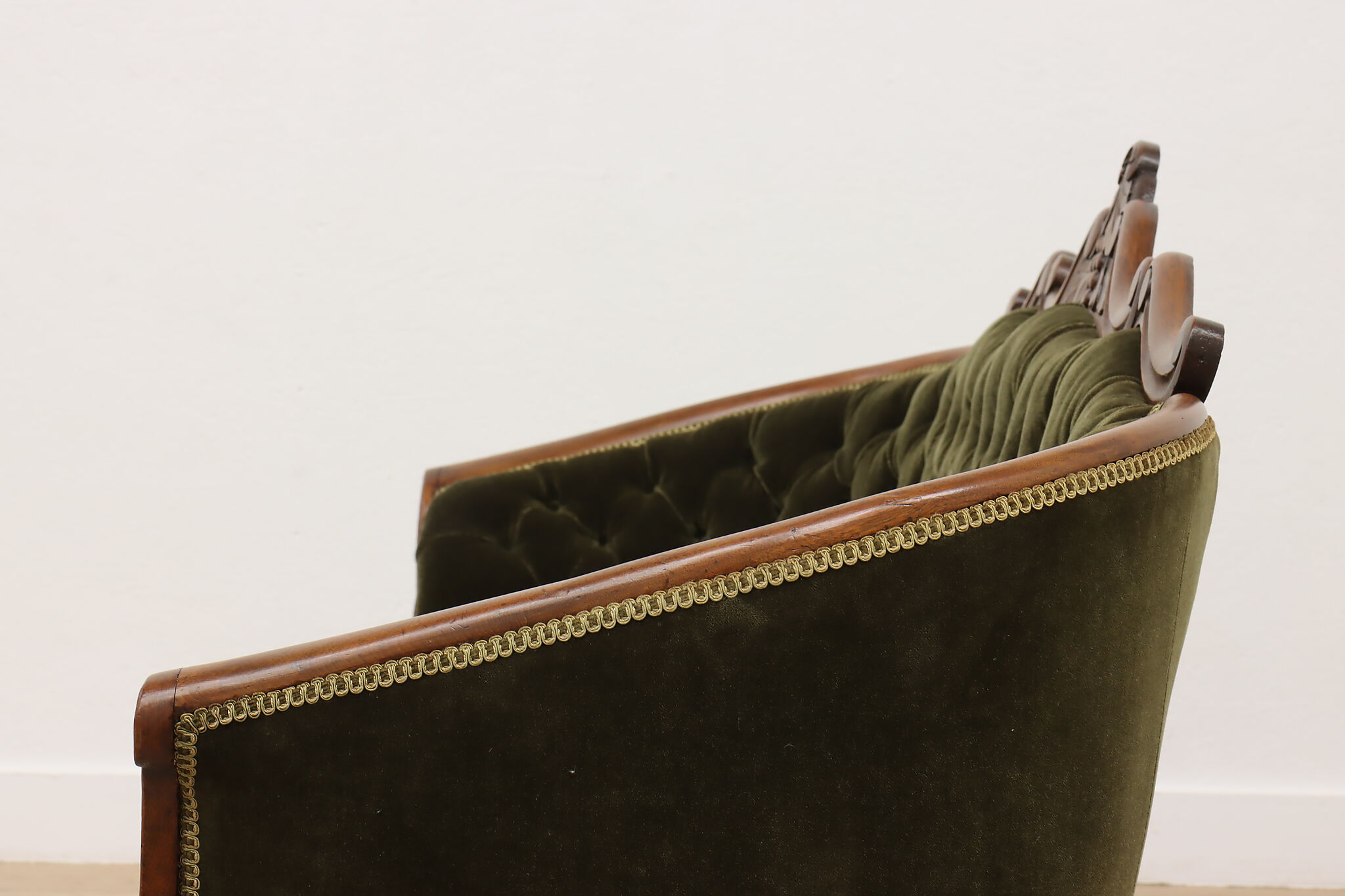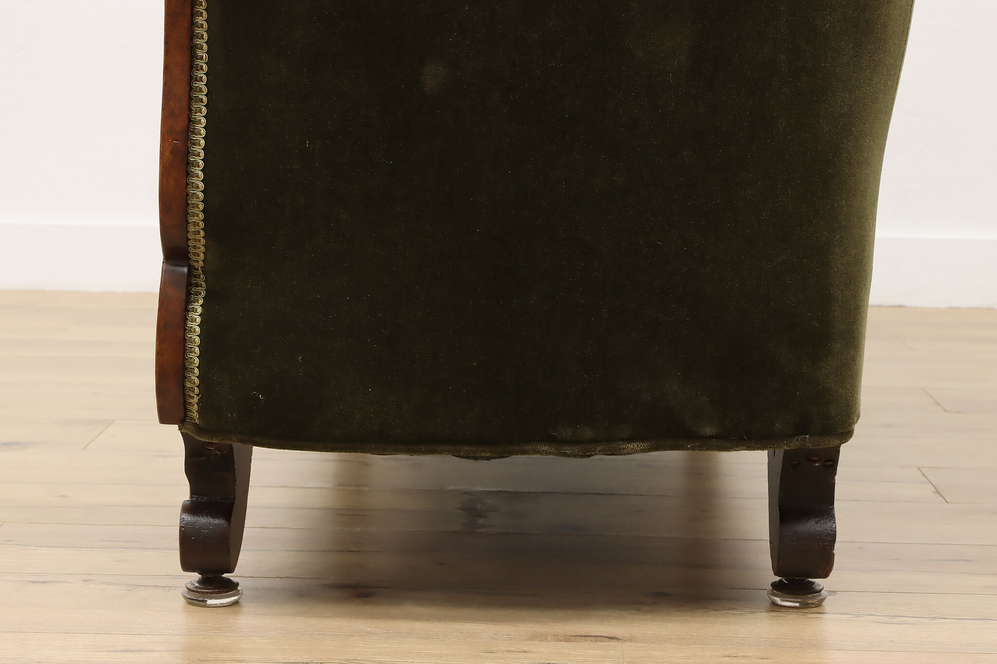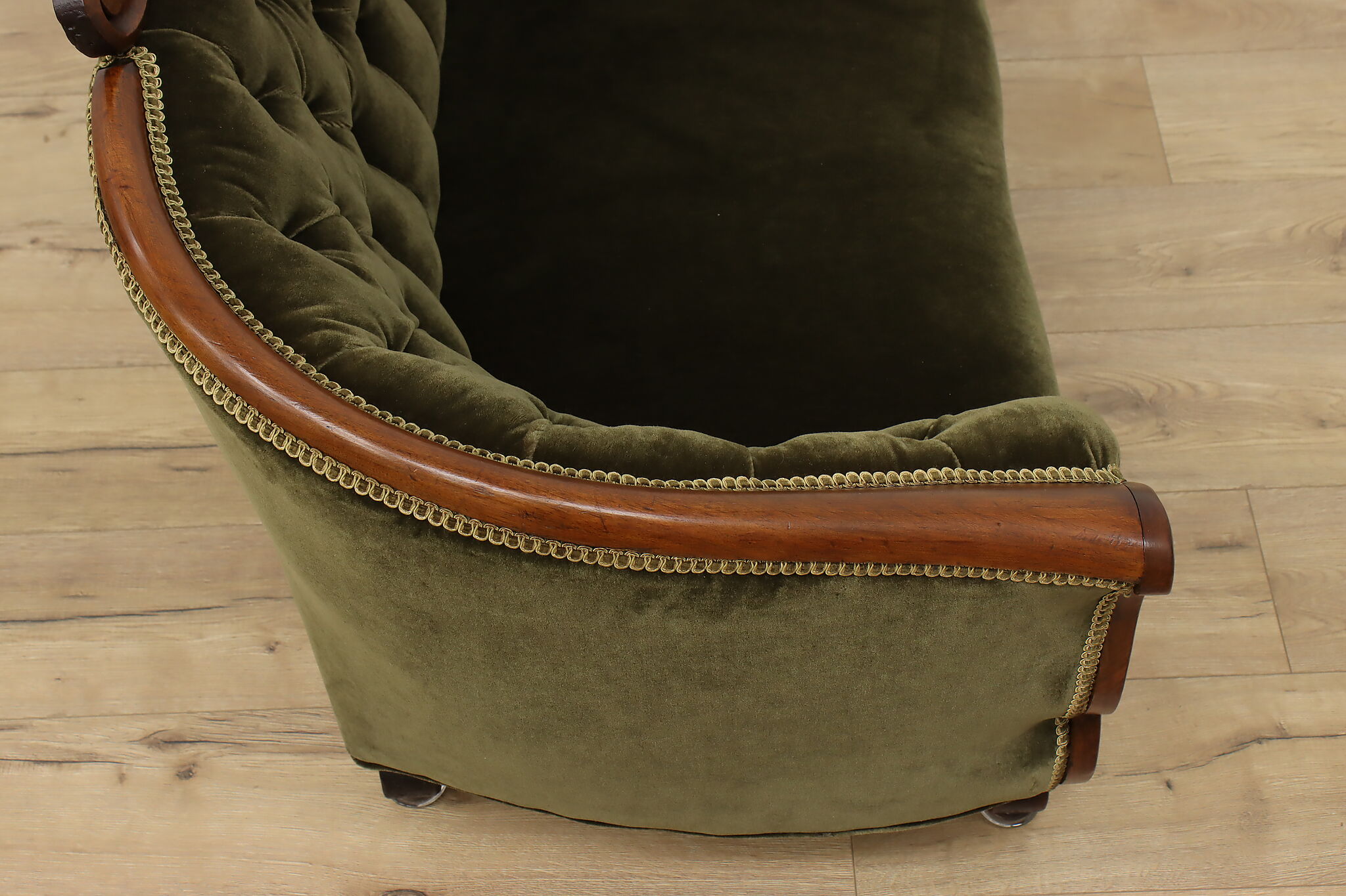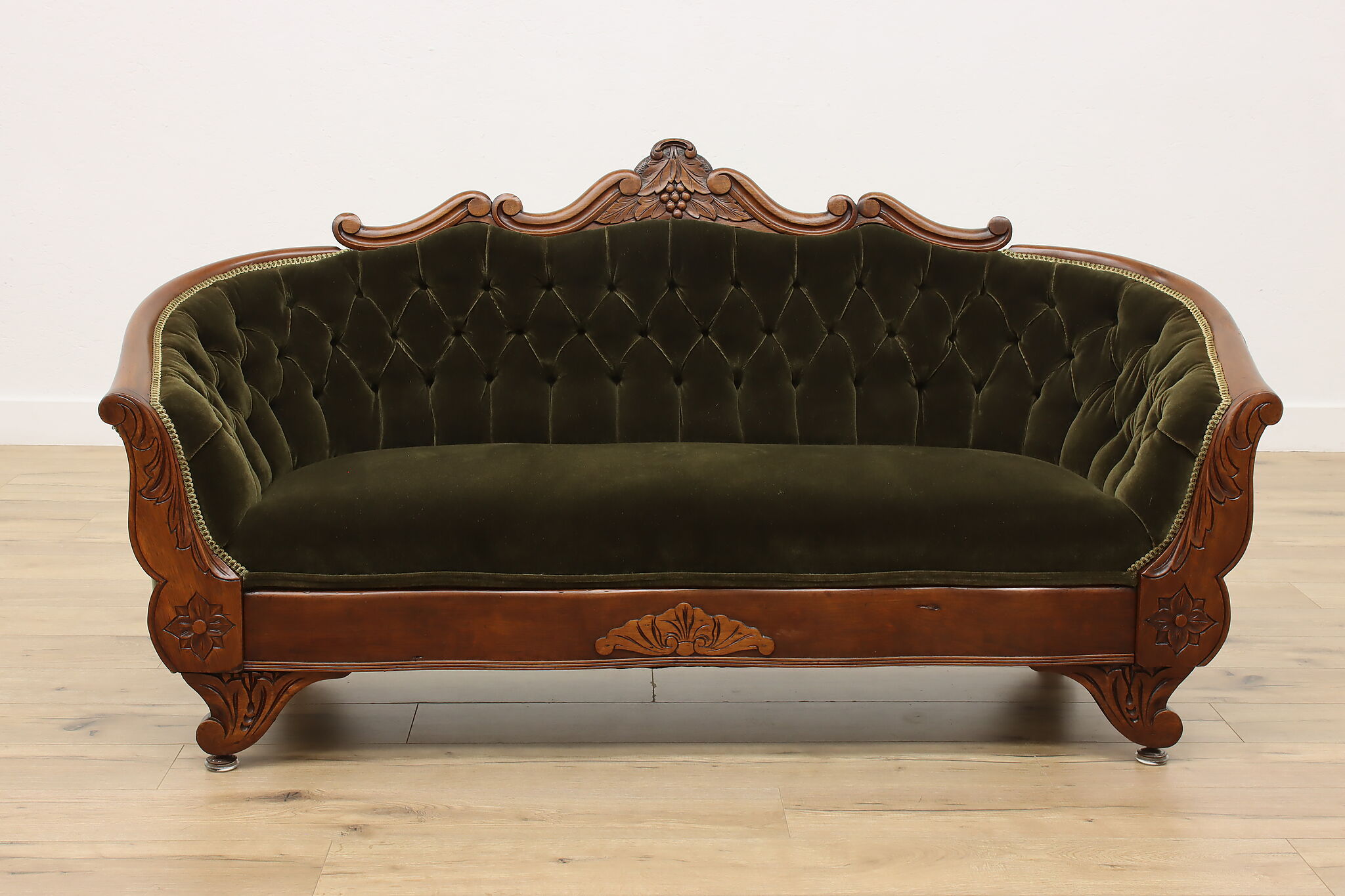 The lovely green genuine mohair upholstery on this Victorian period loveseat, settee or sofa is the perfect compliment to a study or library.