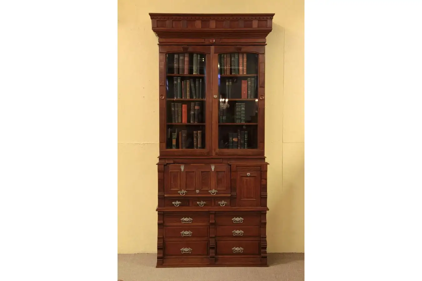 Said to be from an apothecary or drugstore, this Victorian secretary desk with bookcase top has combination locks on three different compartments. We have no combinations for the nickel locks, they protected confidential prescriptions and drug records. The locks appear complete, but we do not know if they are operational, we suggest contacting a criminal for help in figuring out the combinations.
