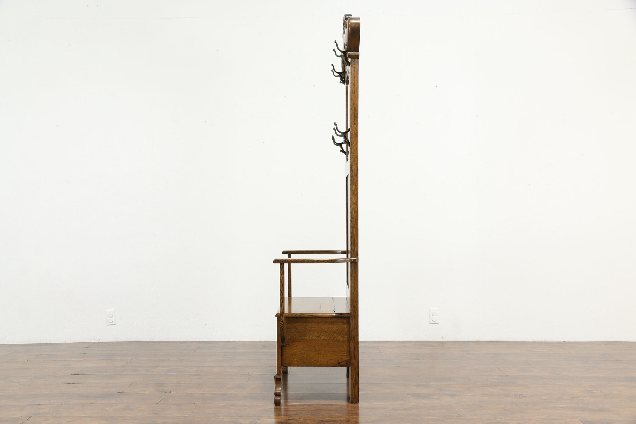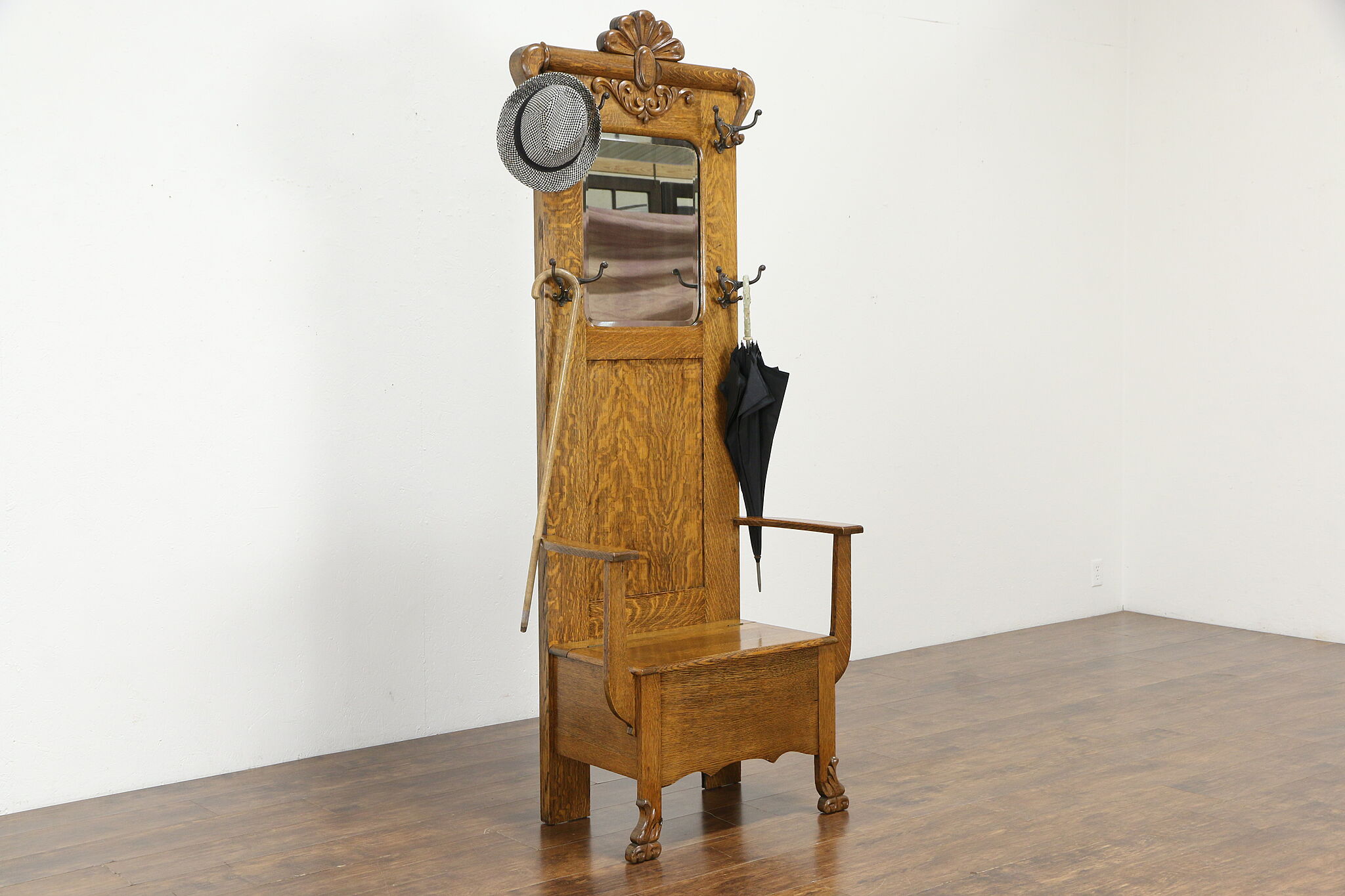 A Victorian period hall stand with bench and shaped and beveled mirror from about 1900 is solid quarter sawn oak. Feet are carved lion paws, there is a shell carved crest and storage under the bench seat. Coppery finished coat and hat hooks are original.
