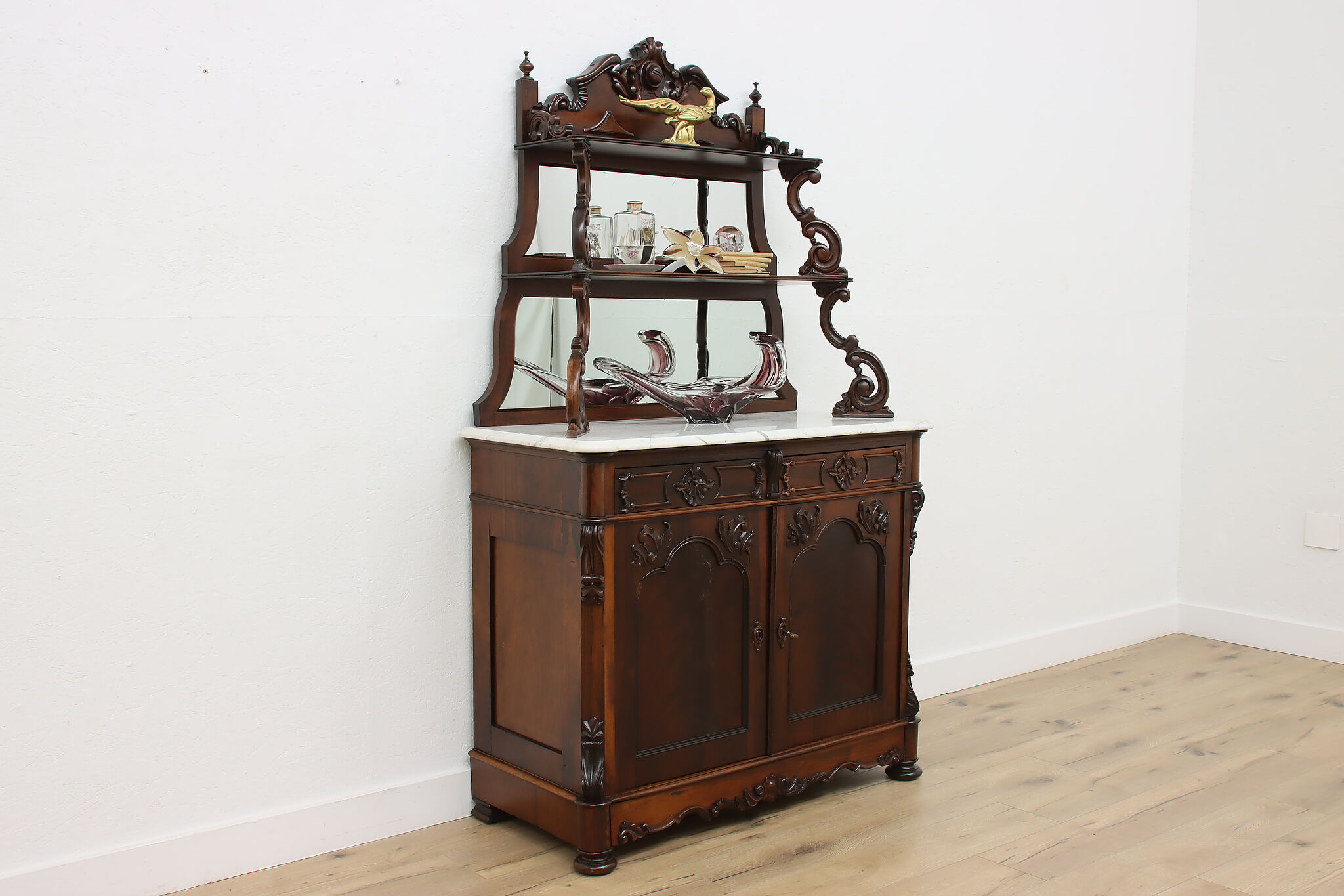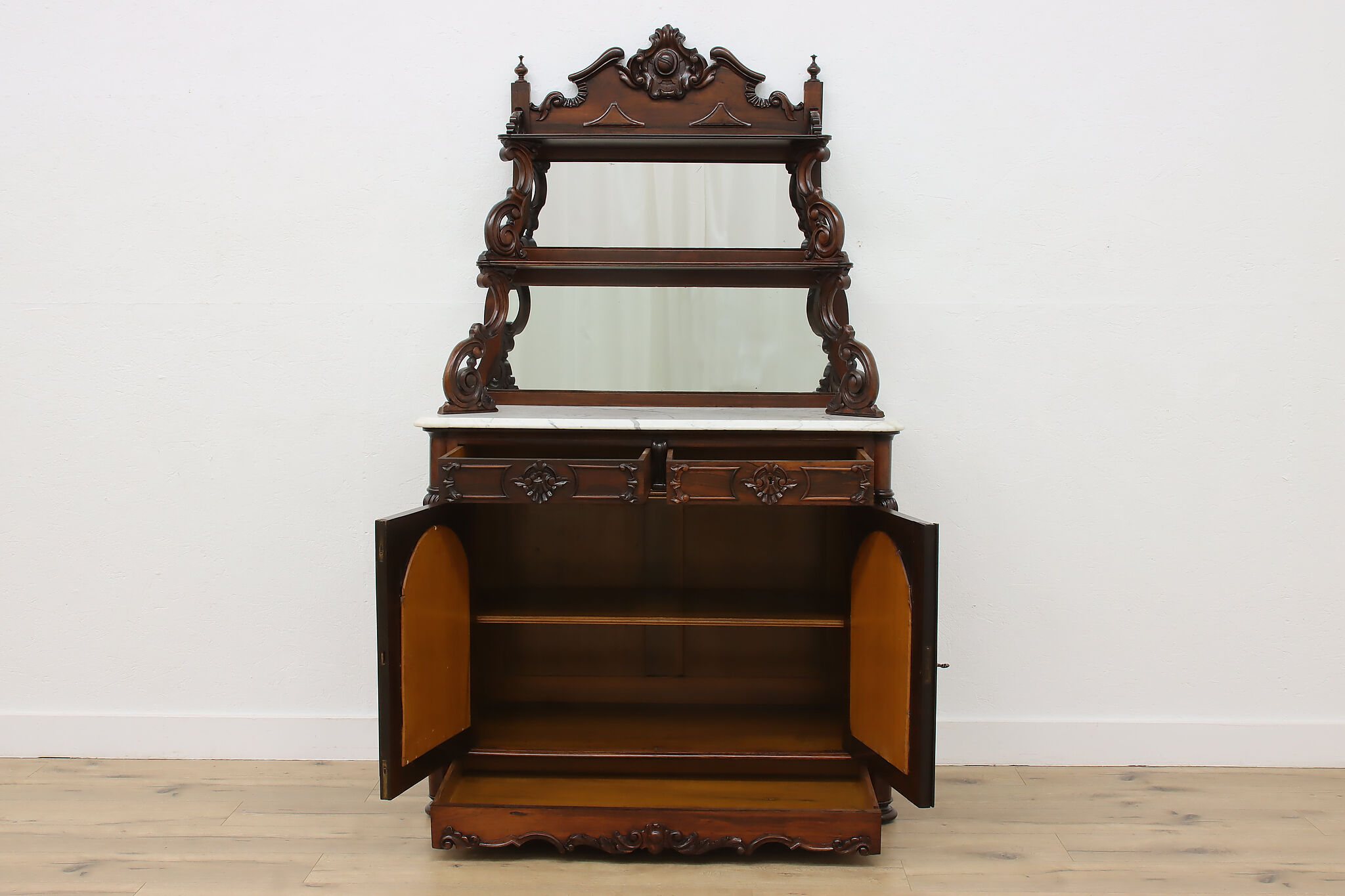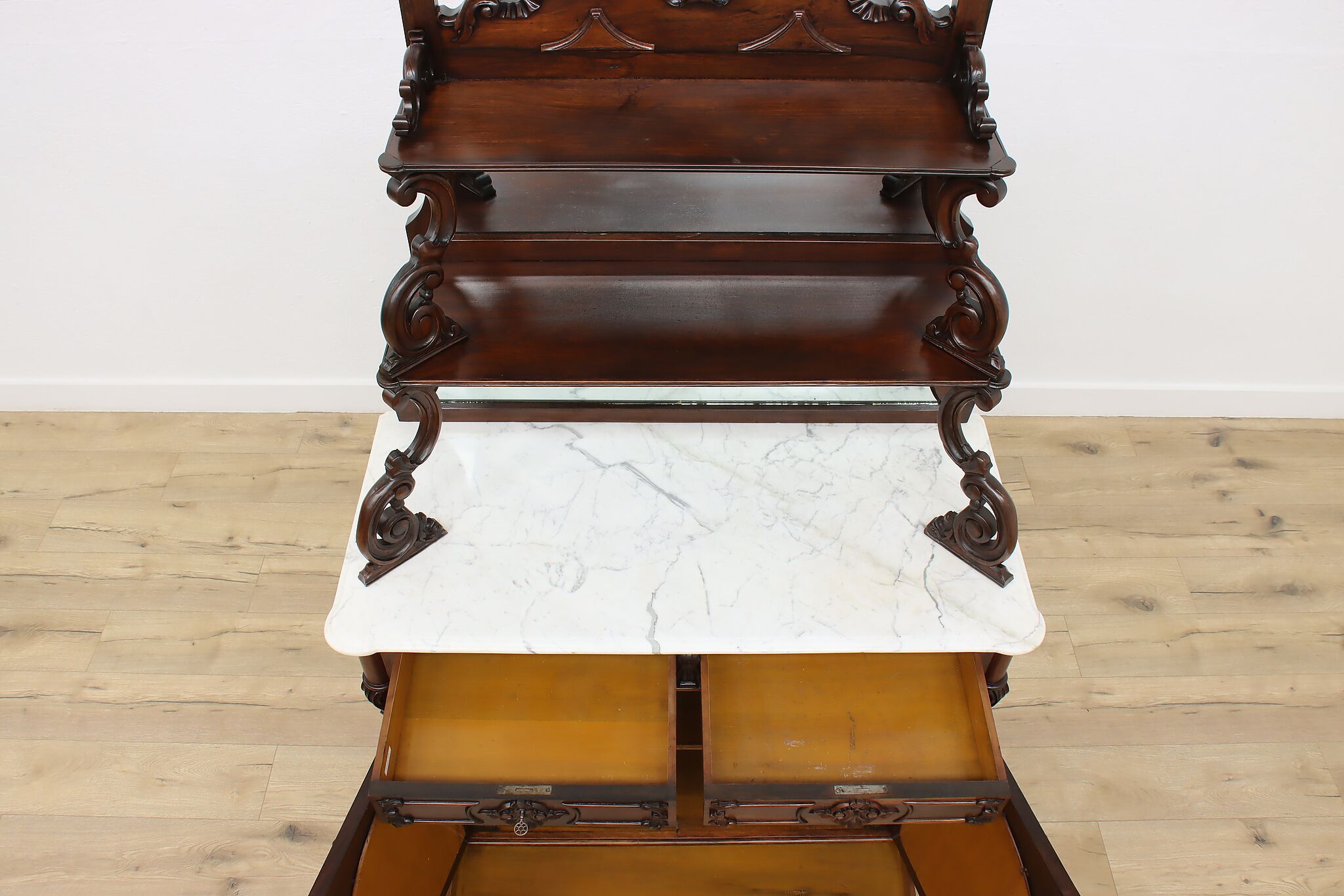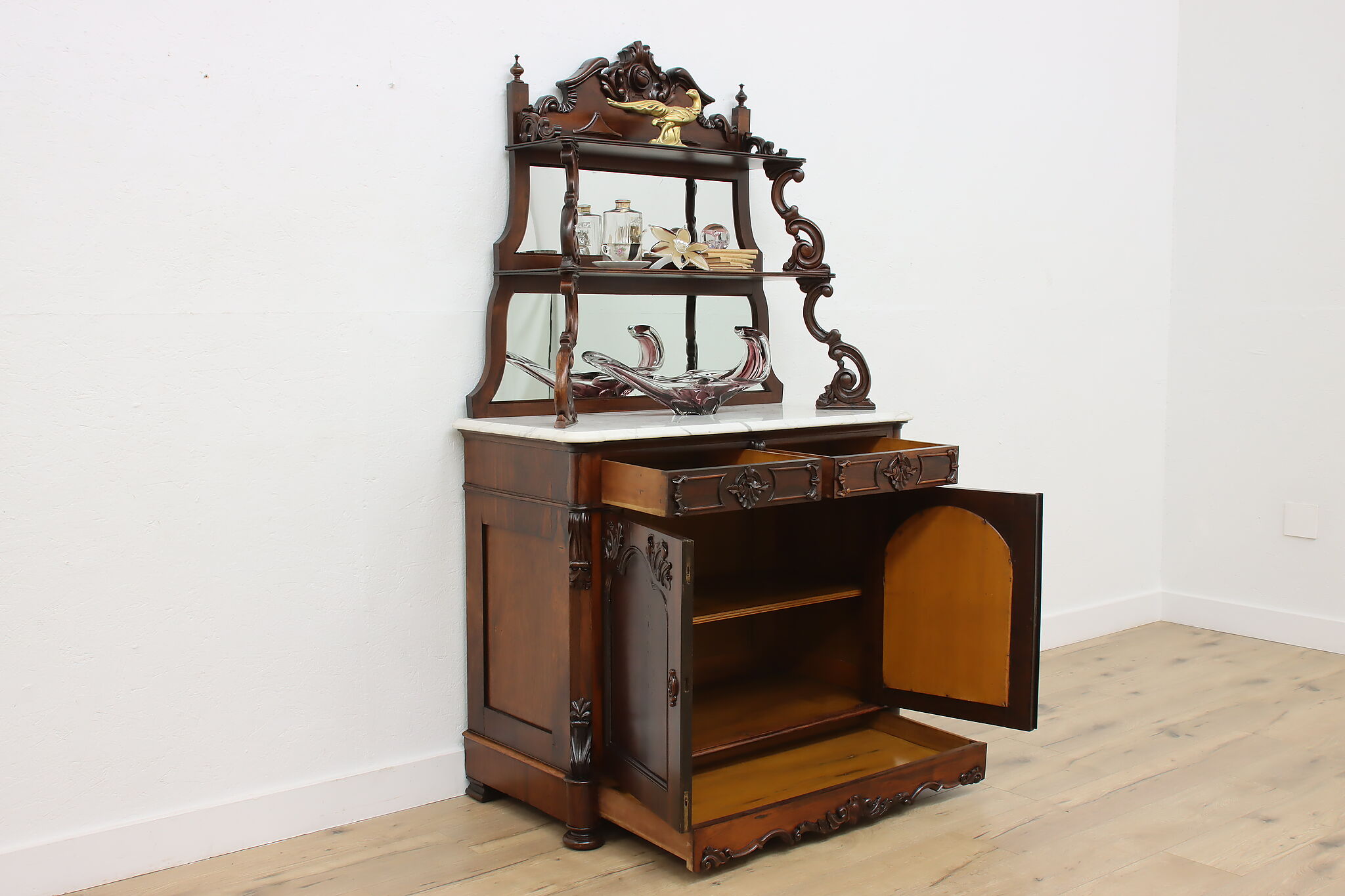 This gorgeous Victorian era buffet, bar, or display cabinet has a secret drawer on the bottom to hide valuables or maybe sweet treats!