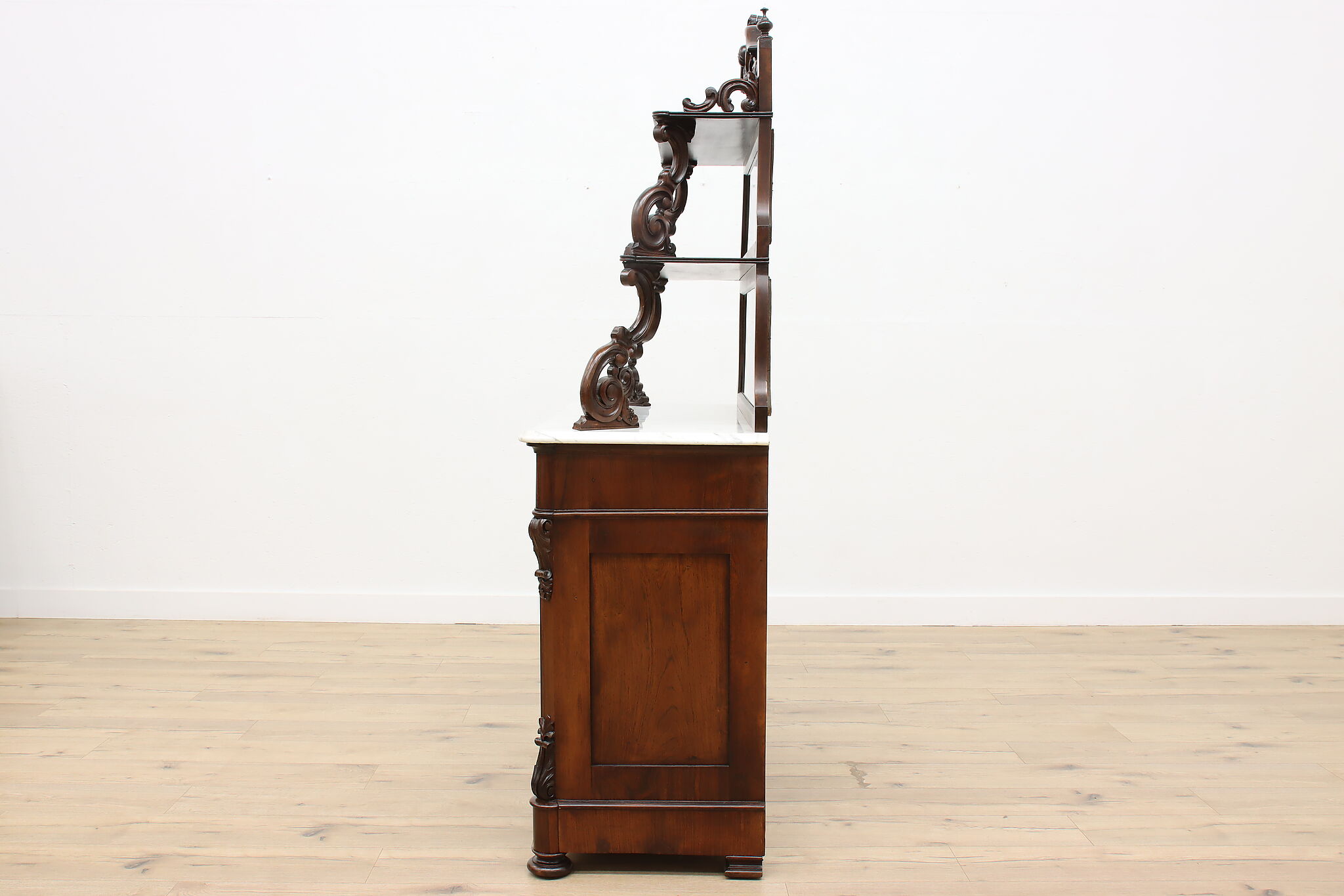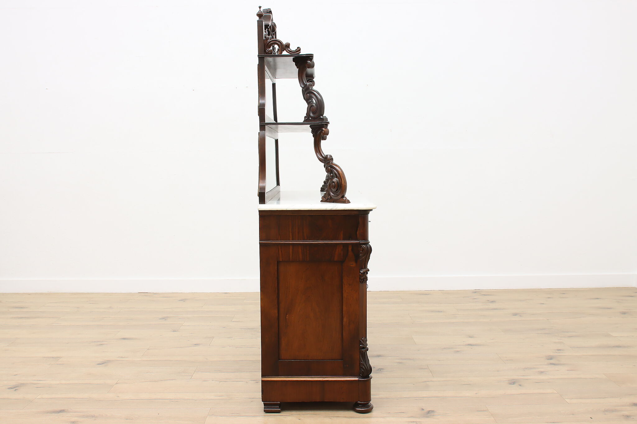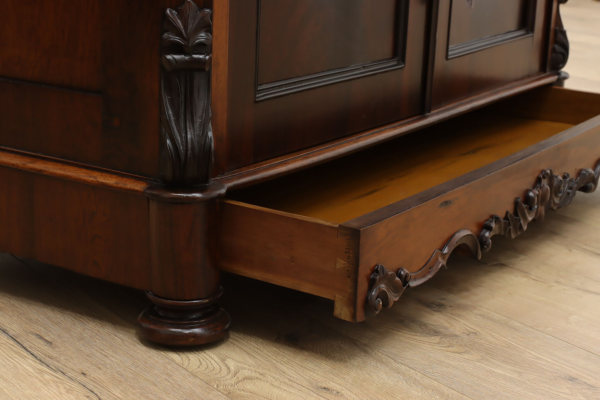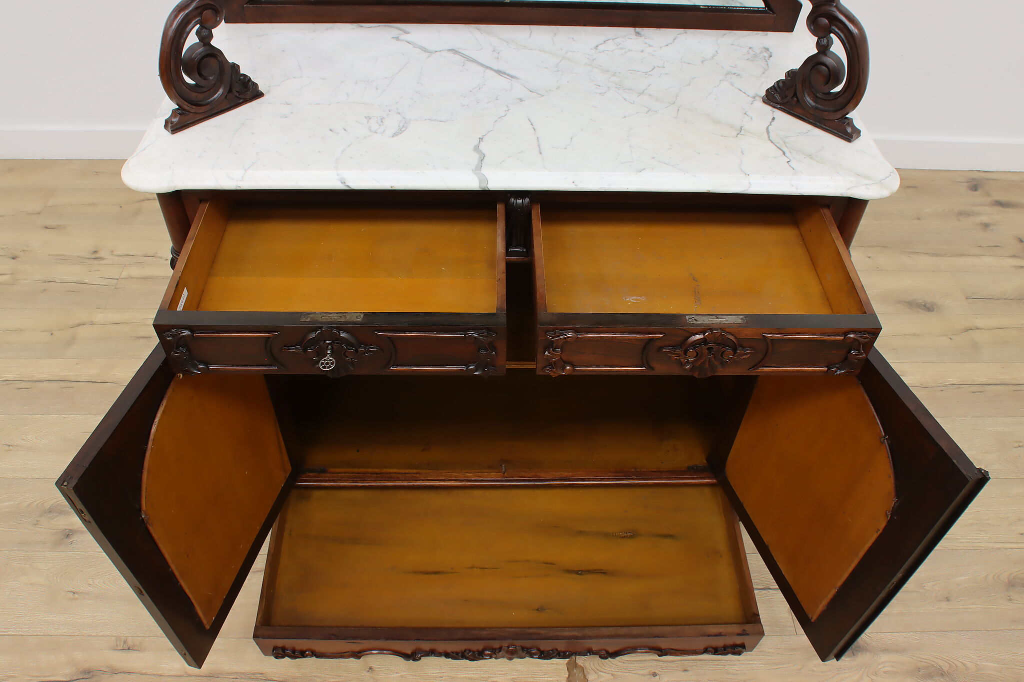 This gorgeous Victorian era buffet, bar, or display cabinet has a secret drawer on the bottom to hide valuables or maybe sweet treats!