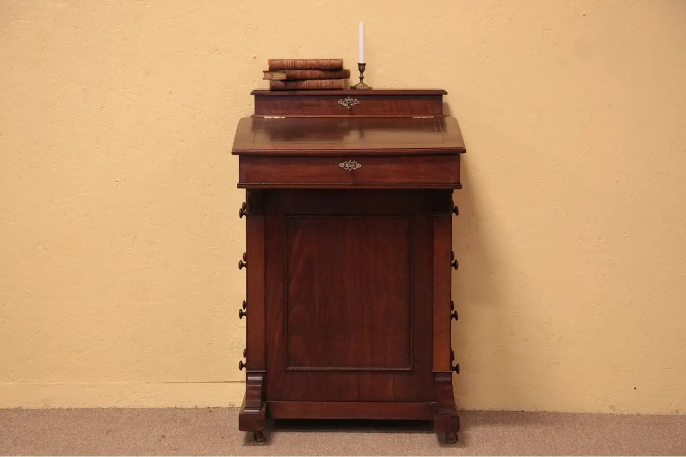 Very charming, this jewel was called a "Davenport" desk after its Victorian inventor. It is also referred to as a "ship captain's" desk, popular on board because of its compact small size.