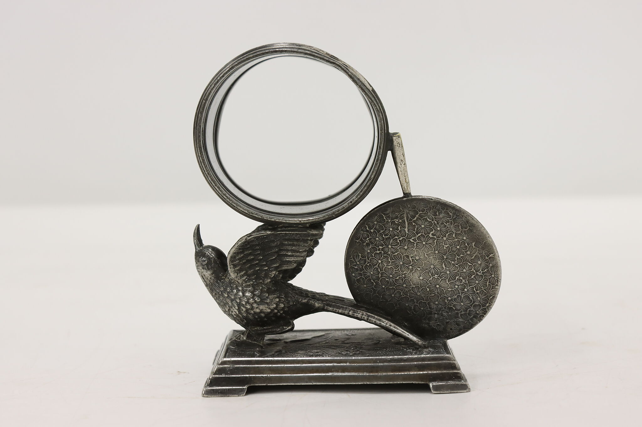 A Victorian period napkin ring has a beautiful bird and fan motif.