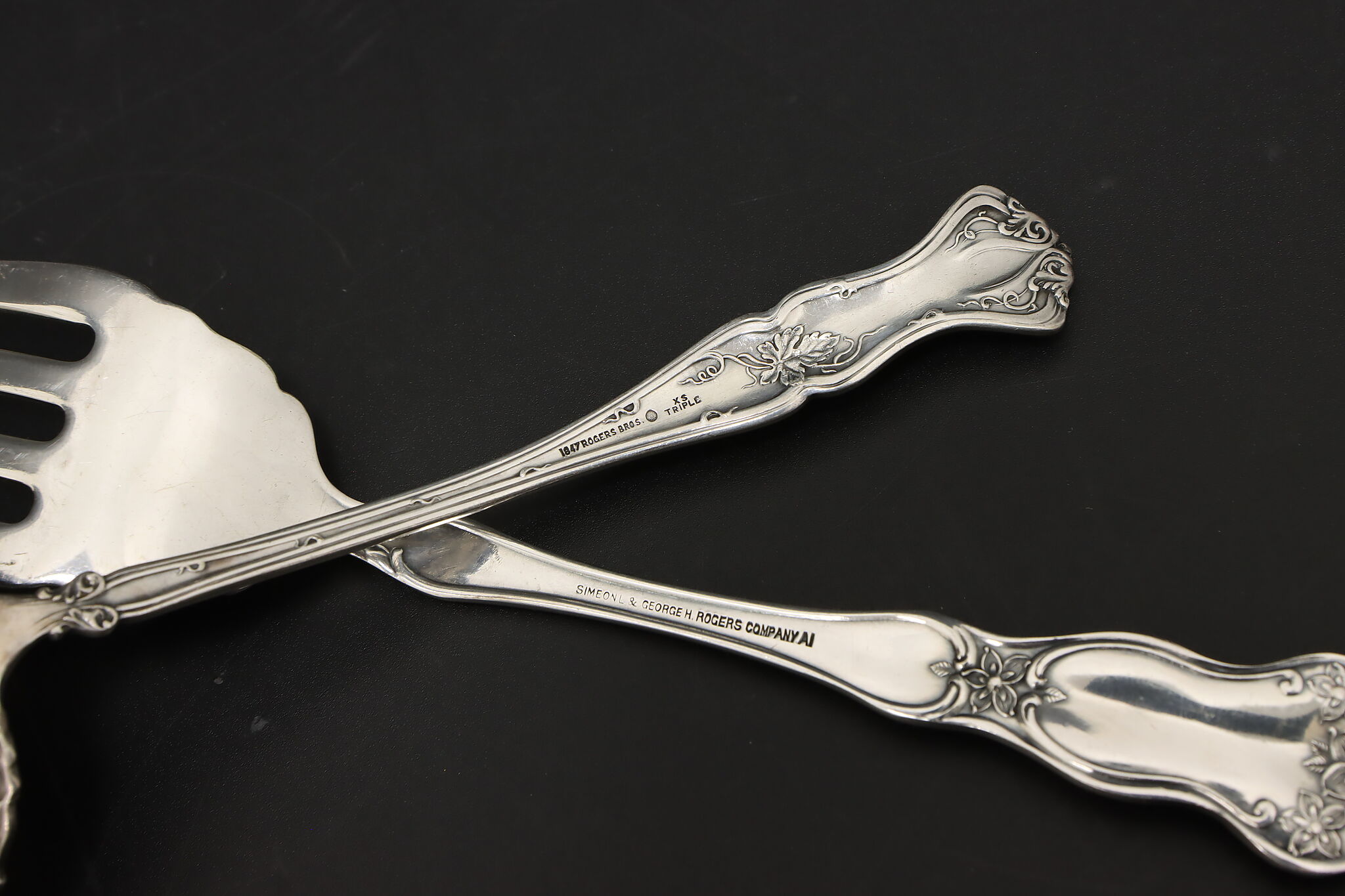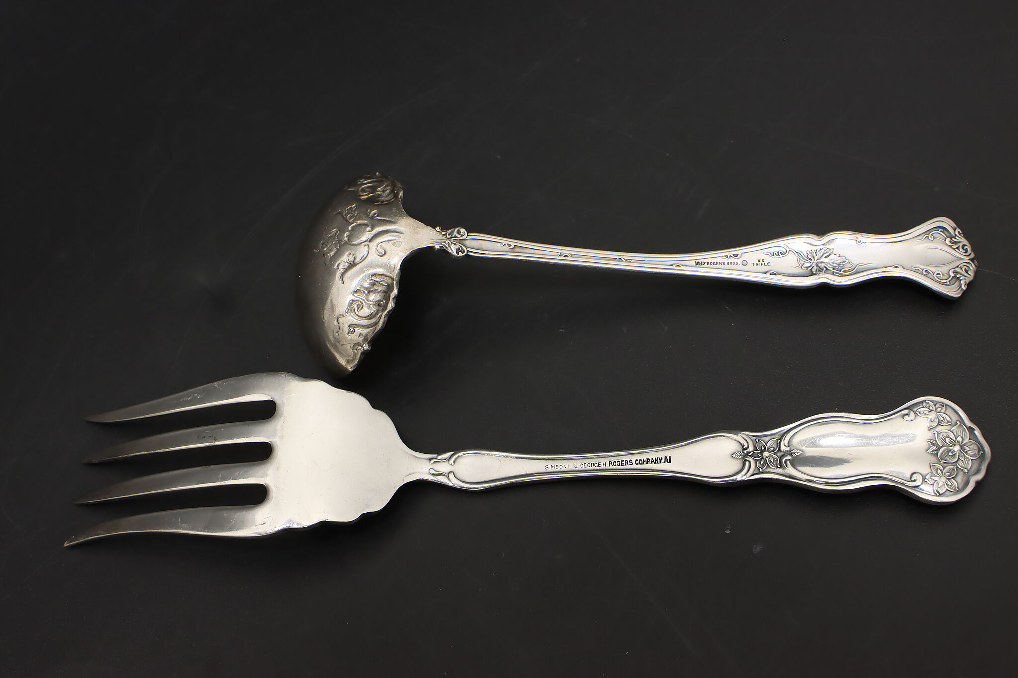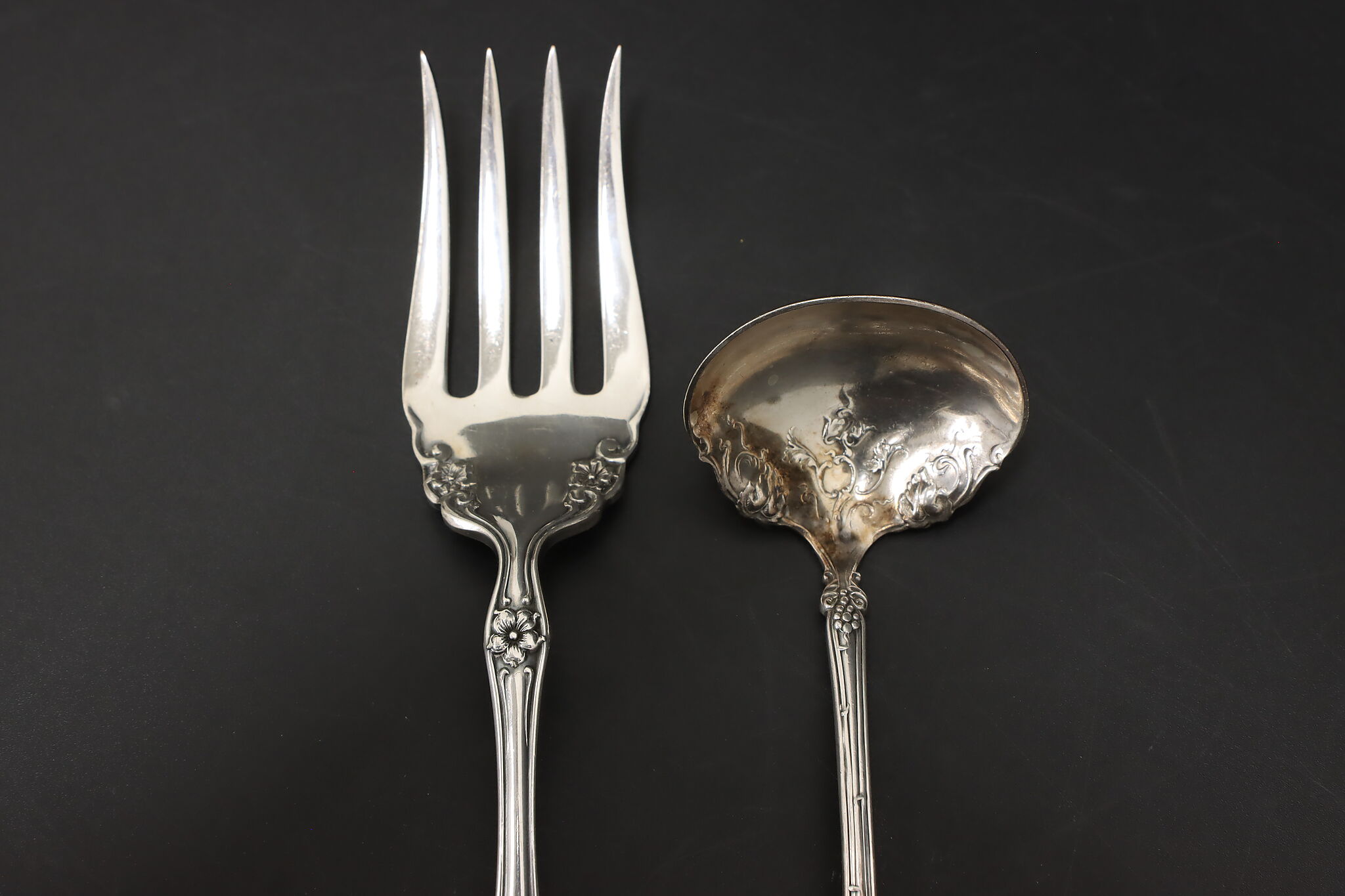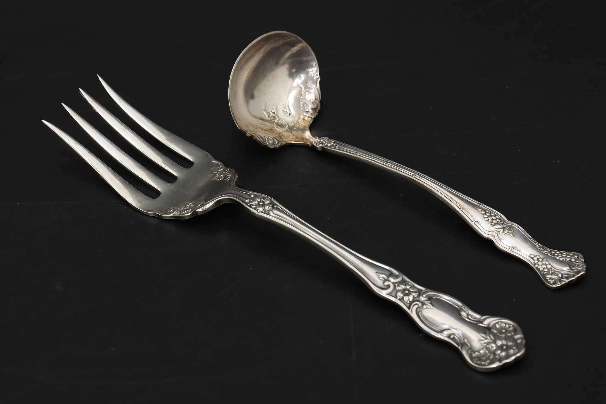 A delightful embossed ladle and serving fork would be wonderful additions to your serving set.