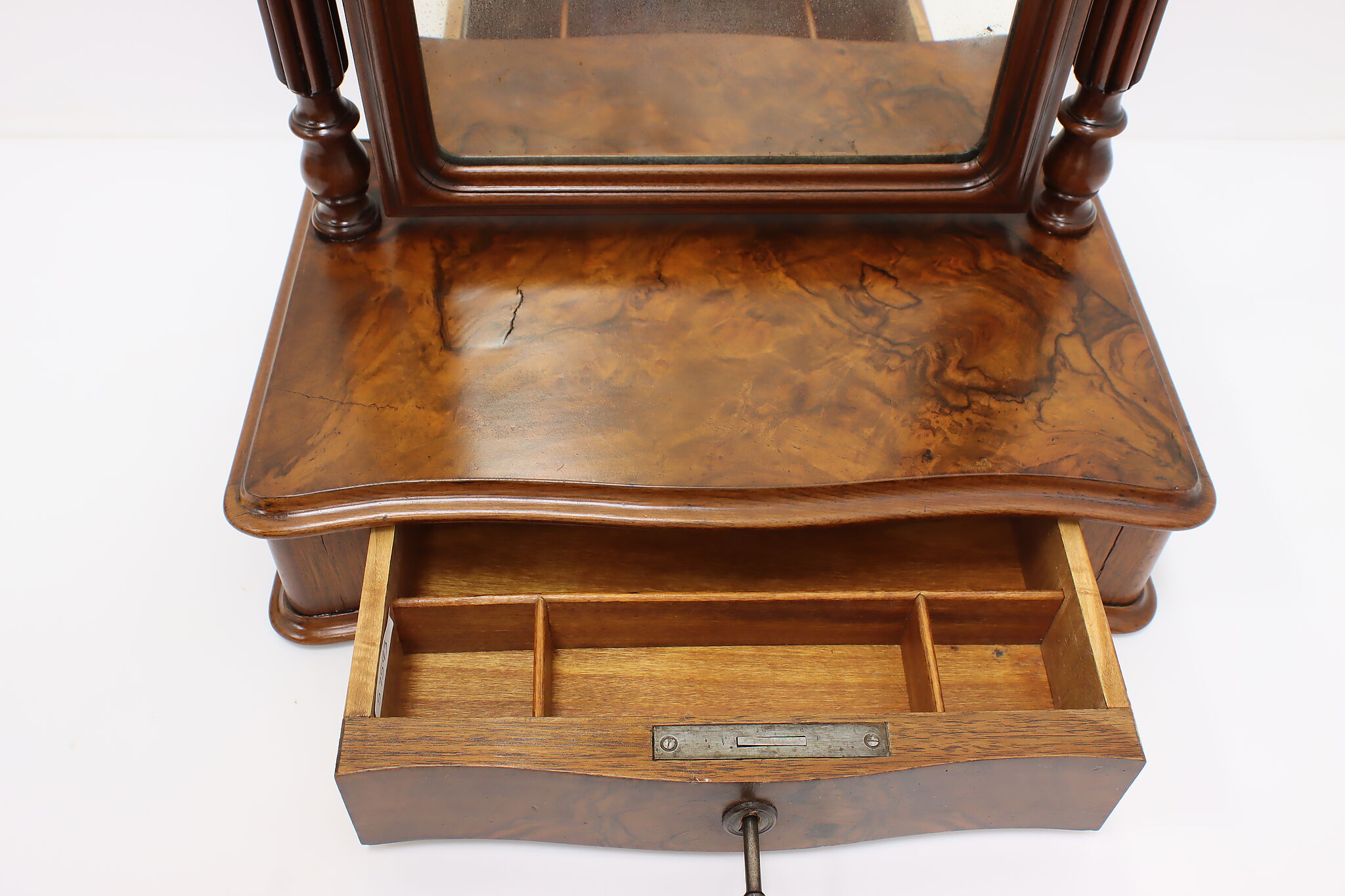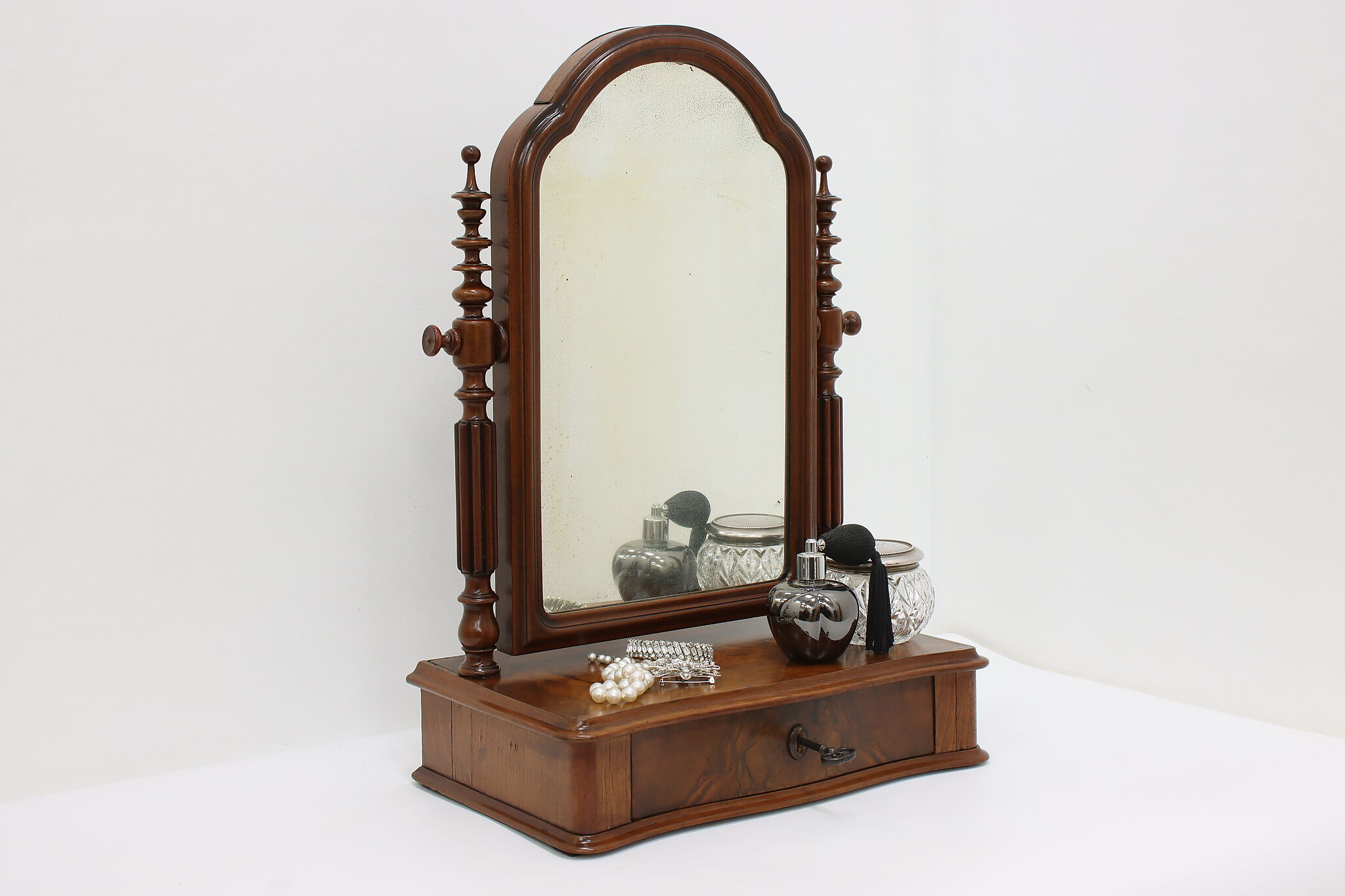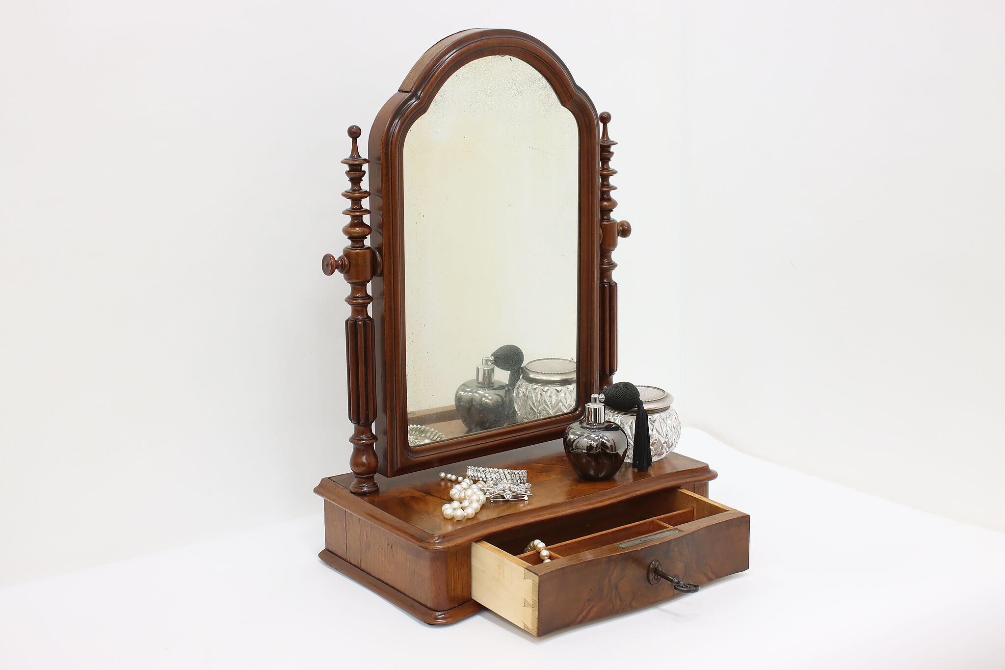 Do your beauty routine from any tabletop within your house with this portable Victorian era mirror and jewelry chest.
