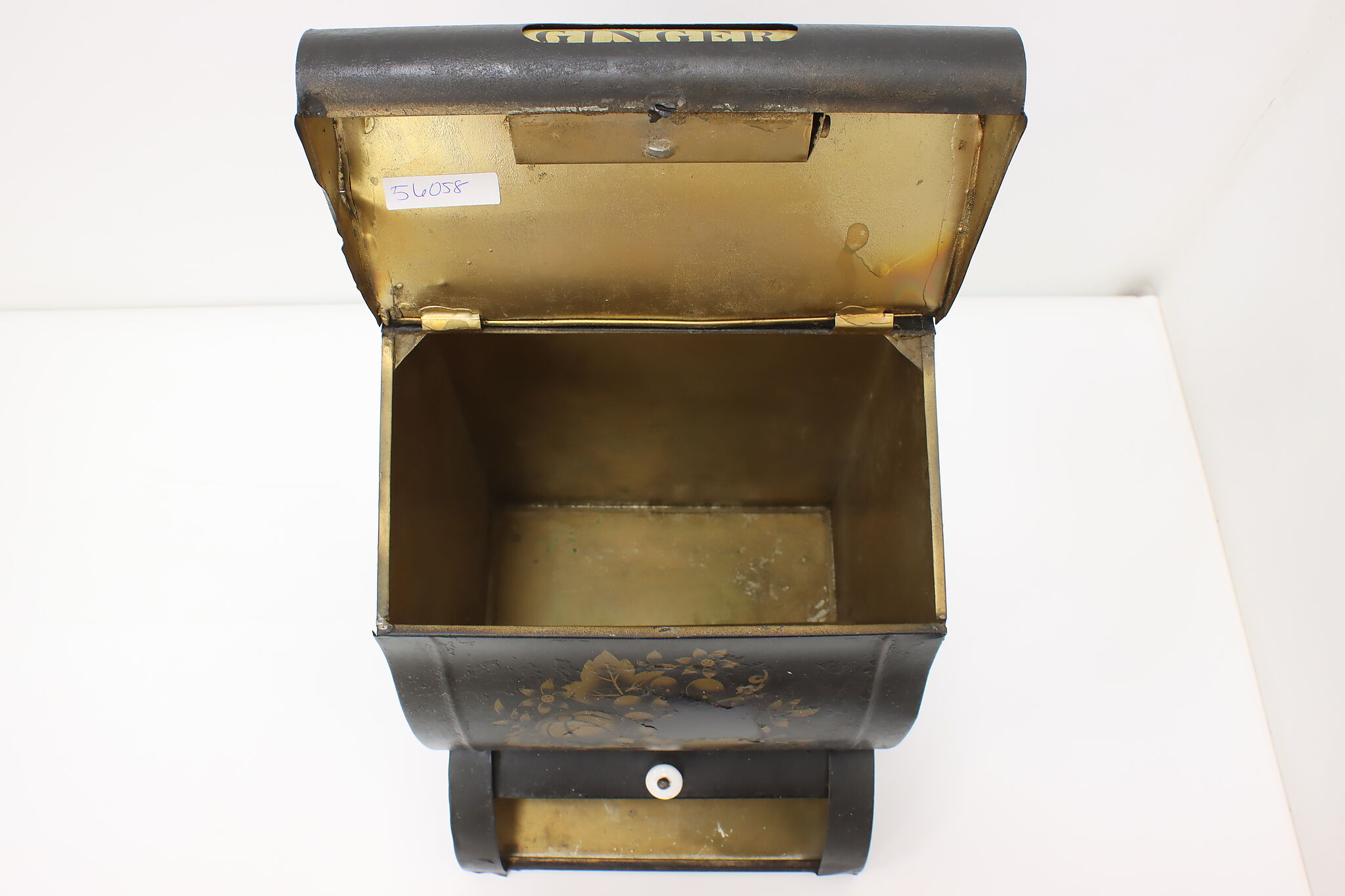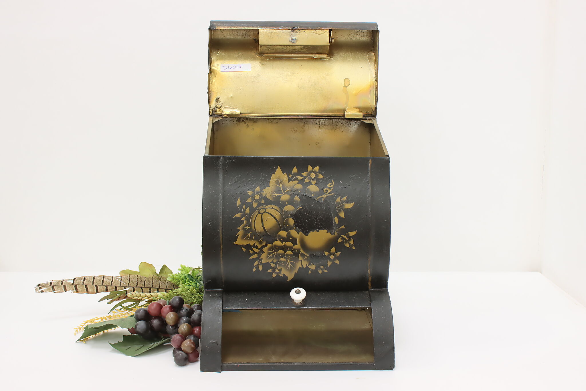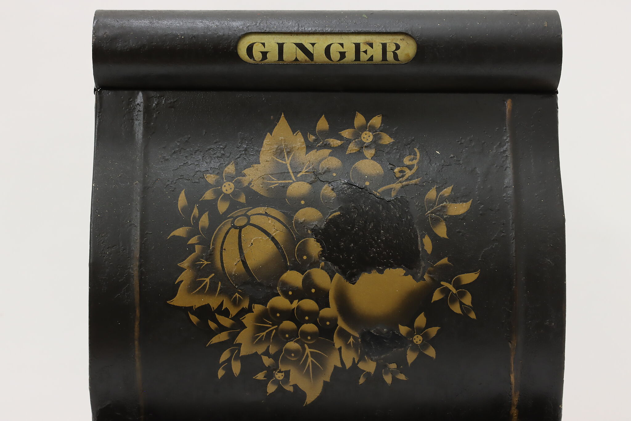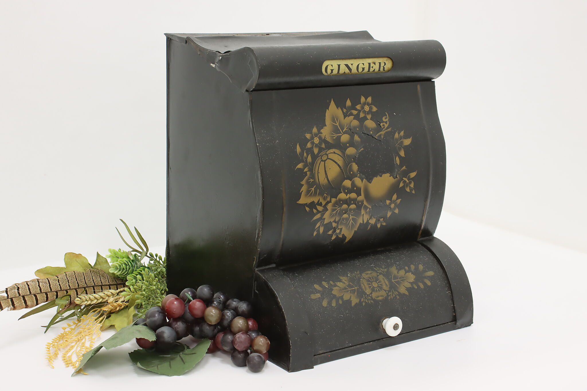 Once used for storing bulk spices in a general goods store, this kitchen pantry bin has a spinning label for different spices.