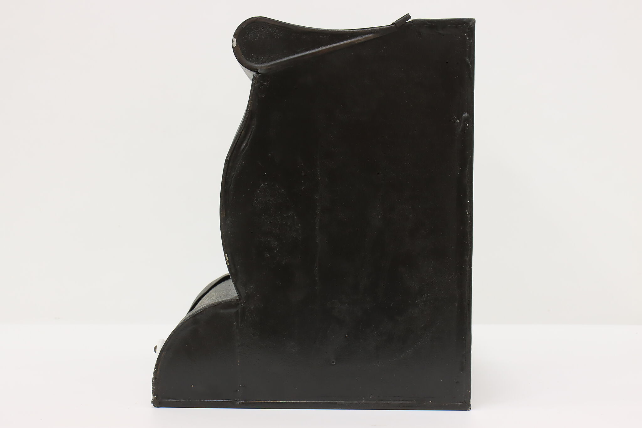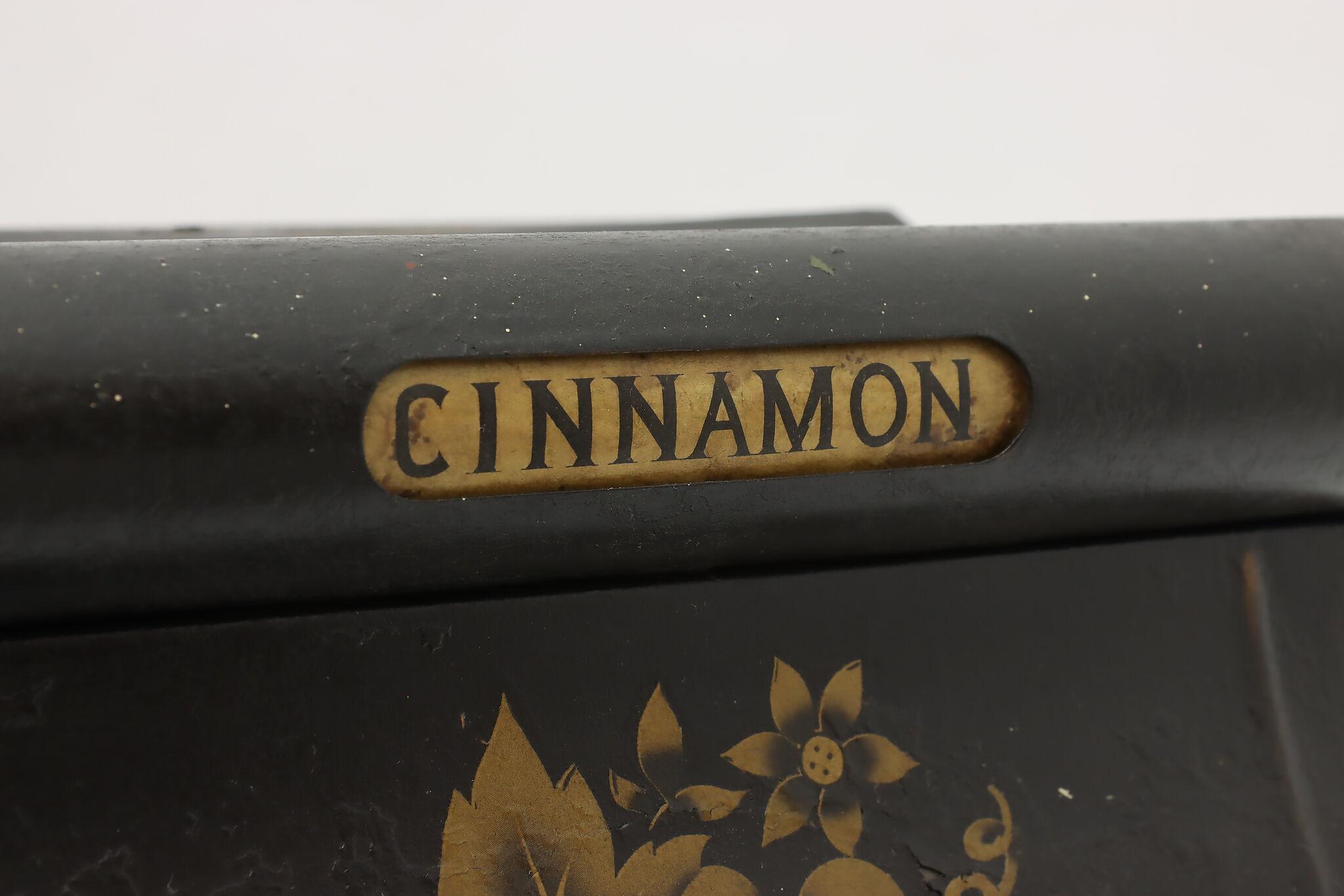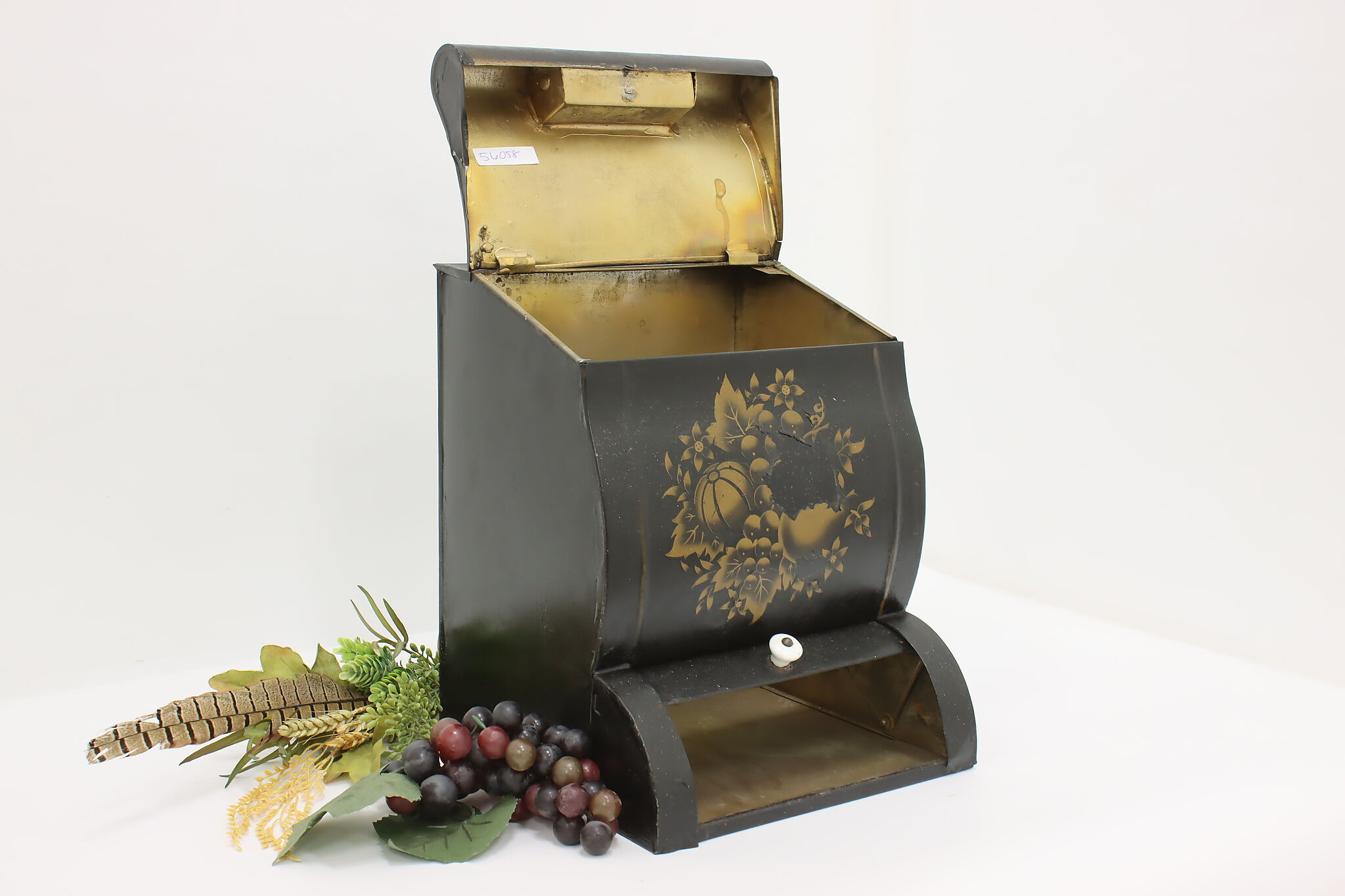Once used for storing bulk spices in a general goods store, this kitchen pantry bin has a spinning label for different spices.