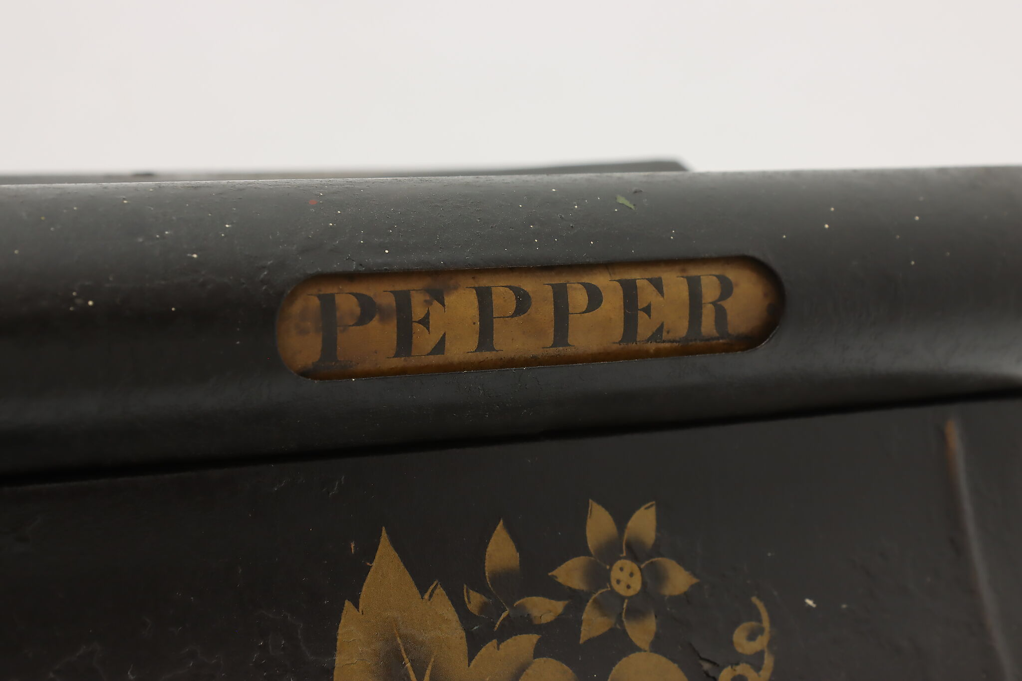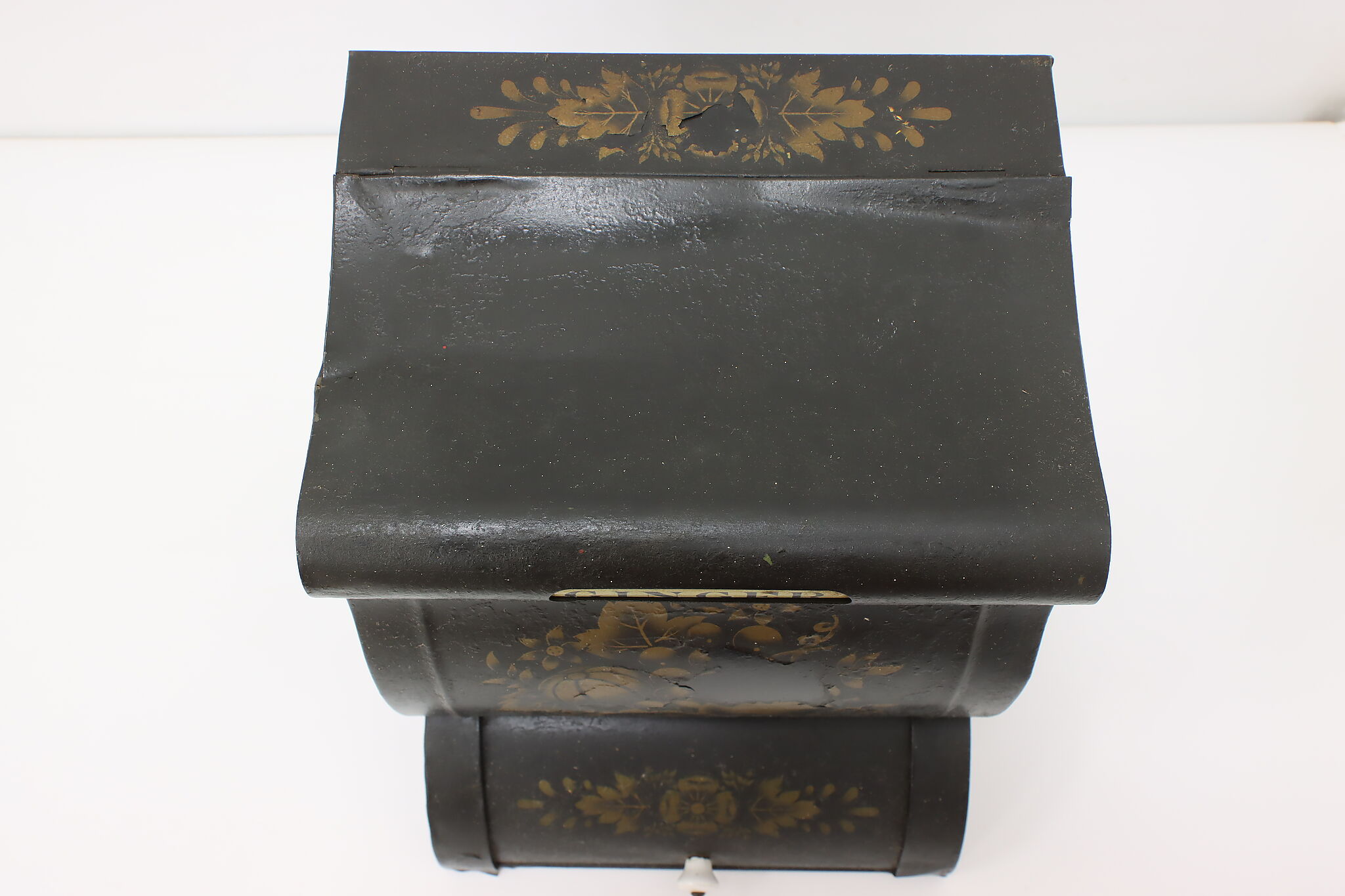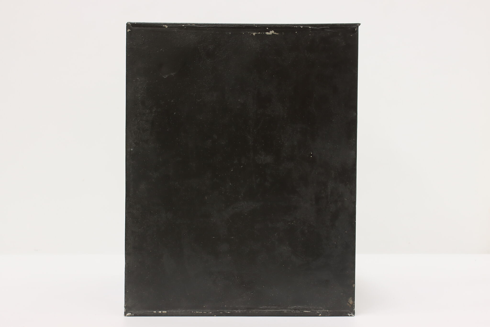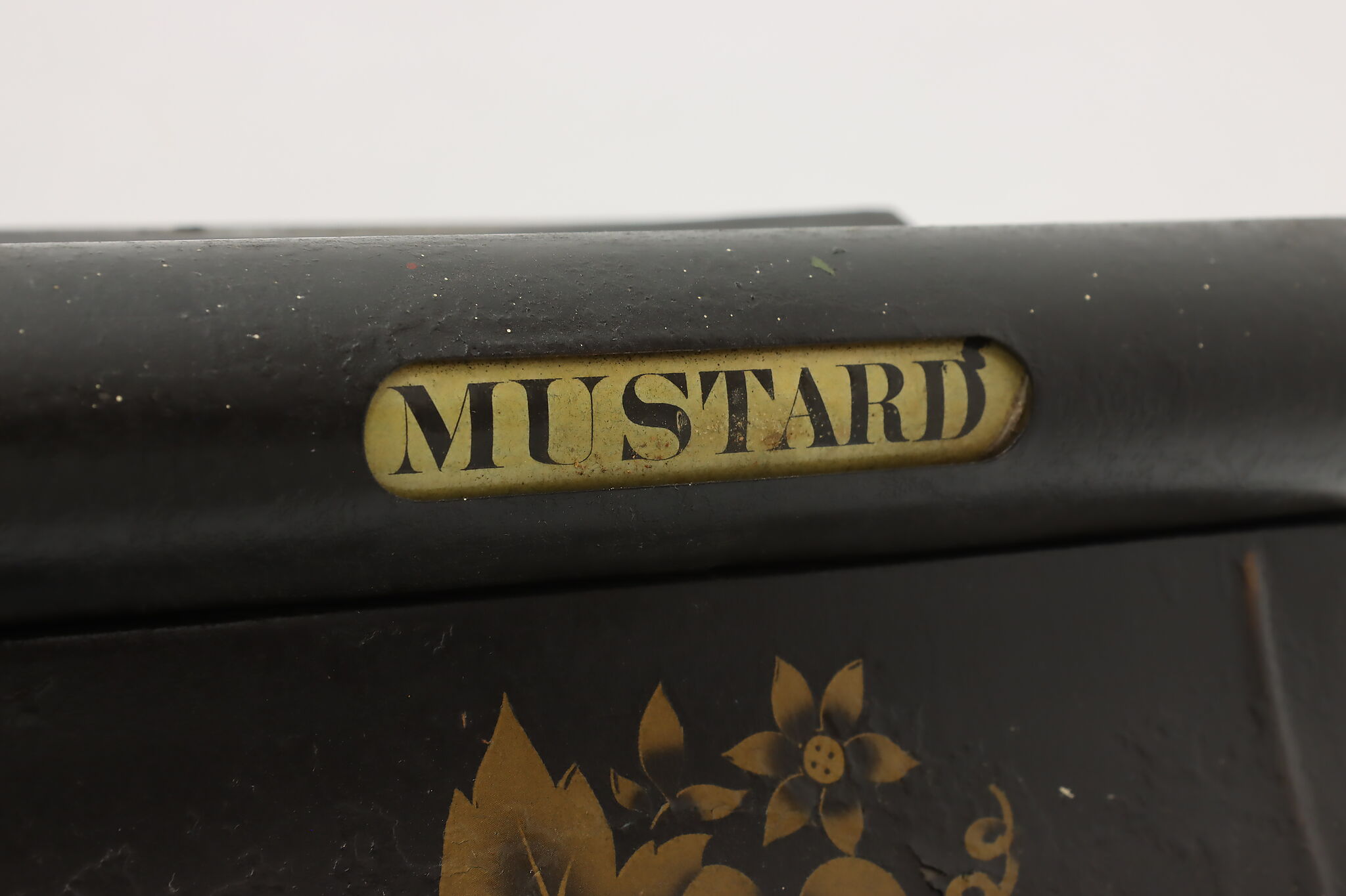 Once used for storing bulk spices in a general goods store, this kitchen pantry bin has a spinning label for different spices.
