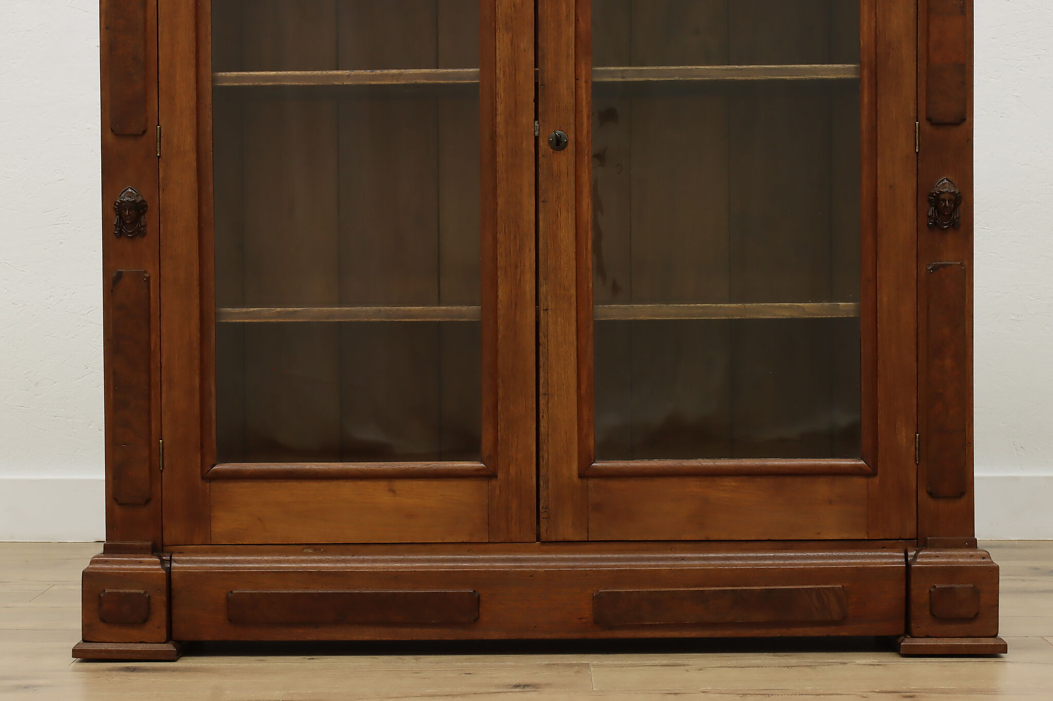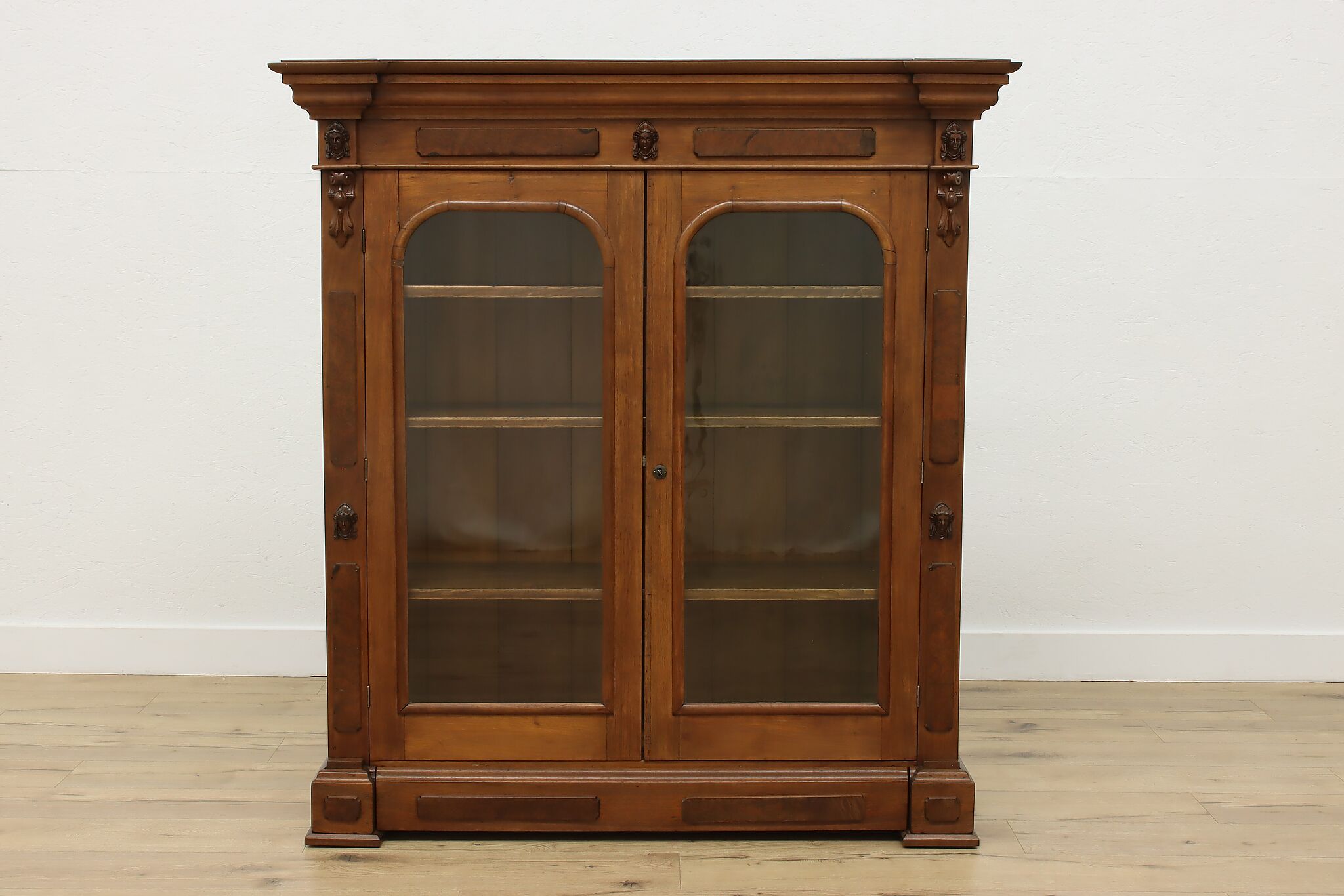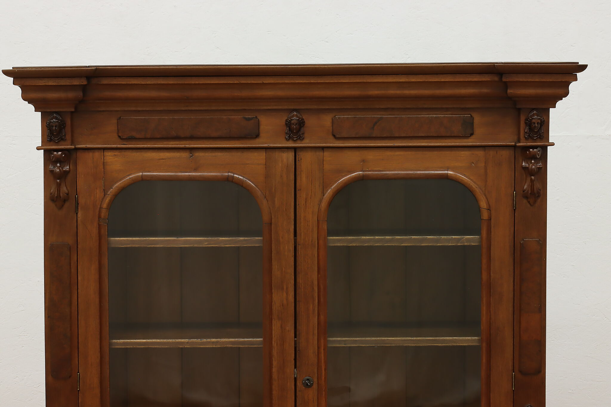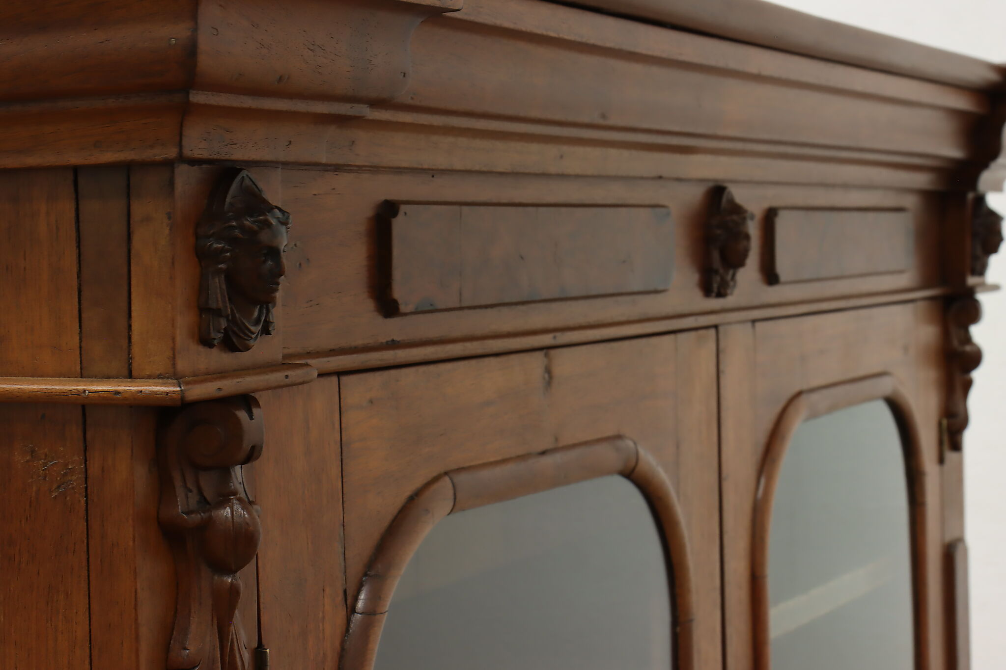 A Victorian era display cabinet or bookcase has carved busts of women, perhaps protectors of your valuables!