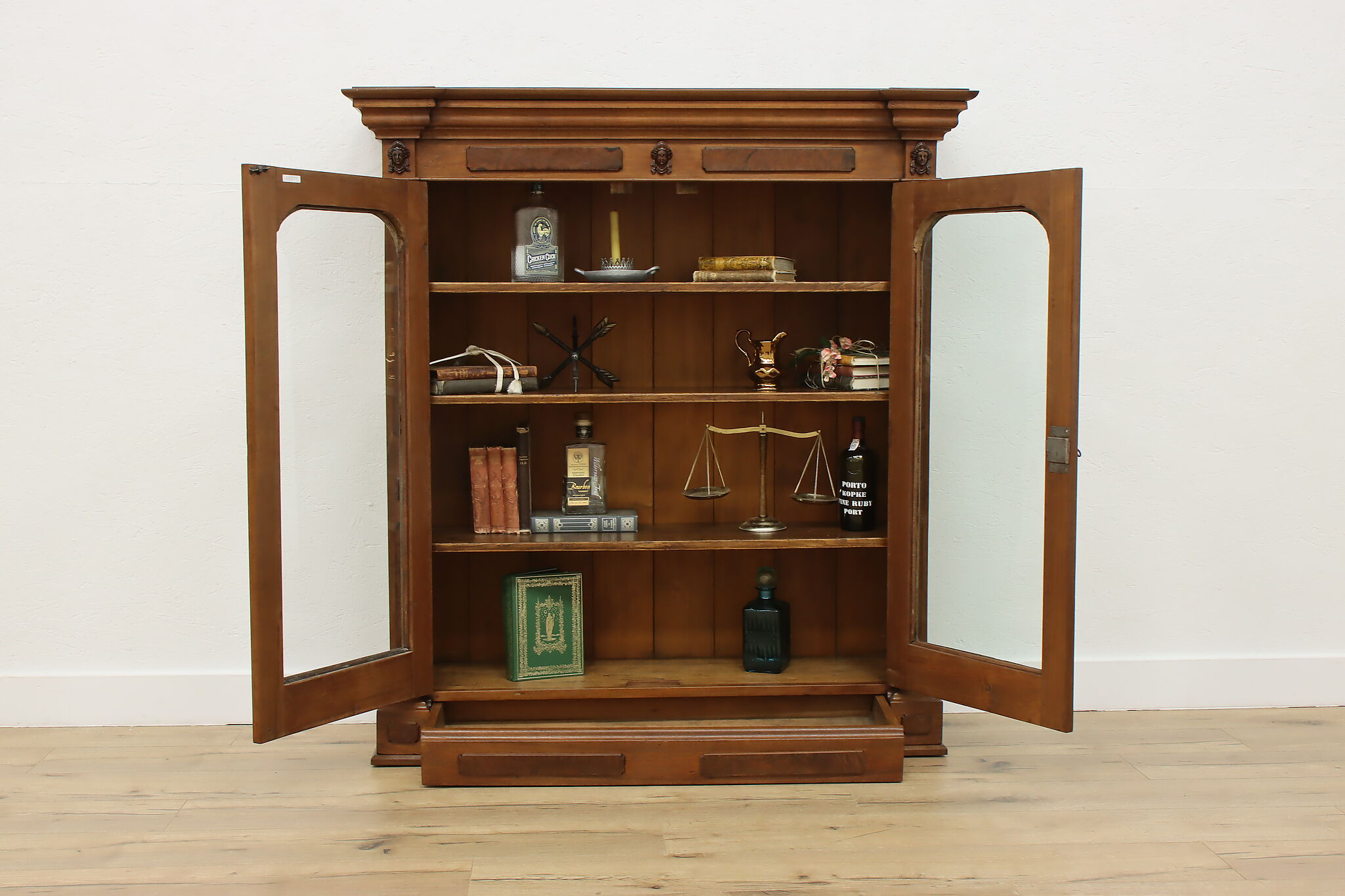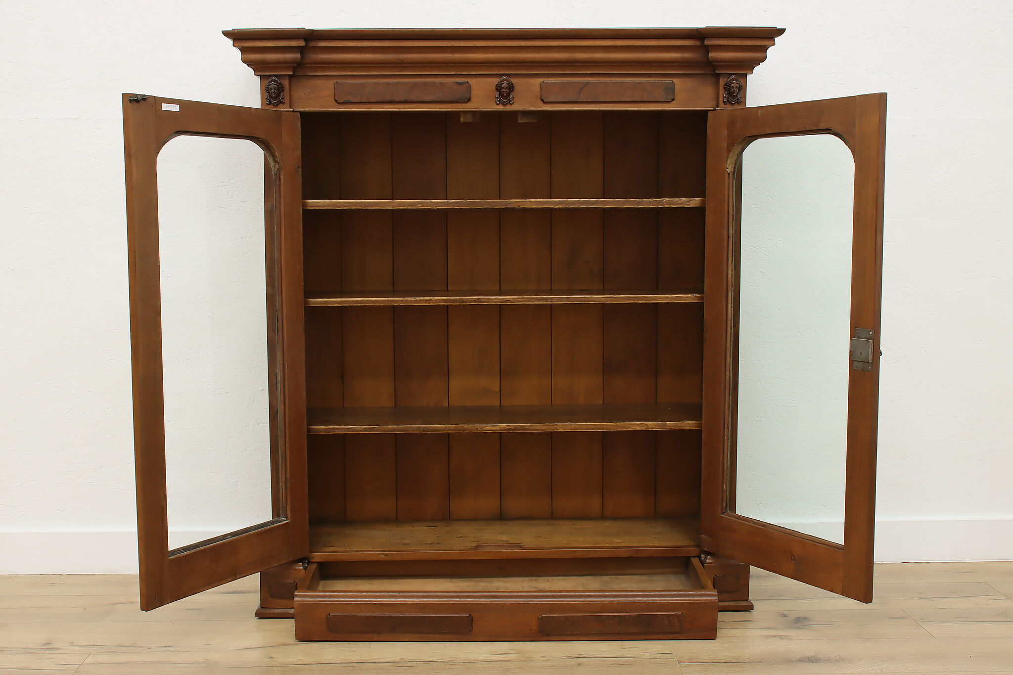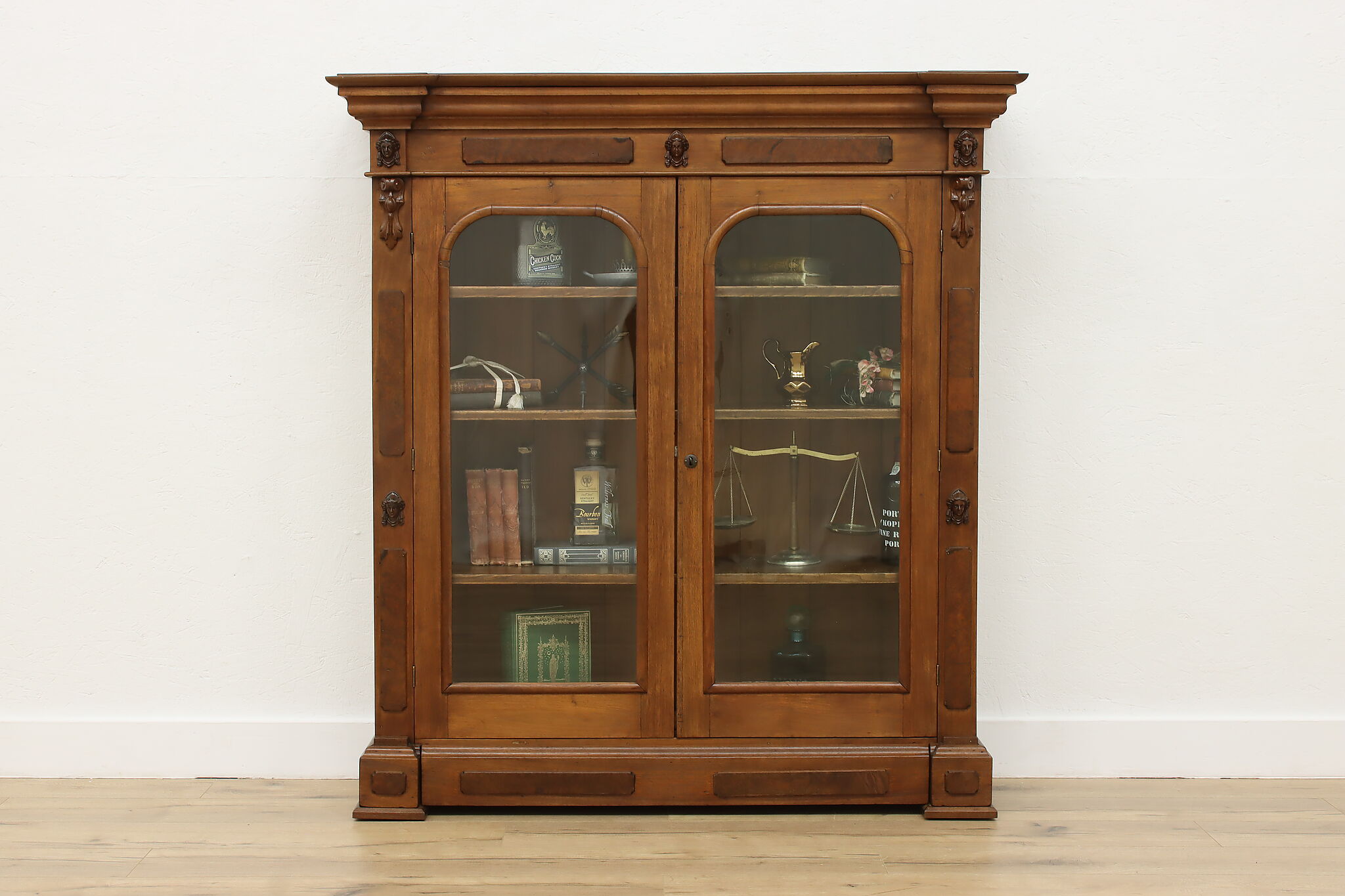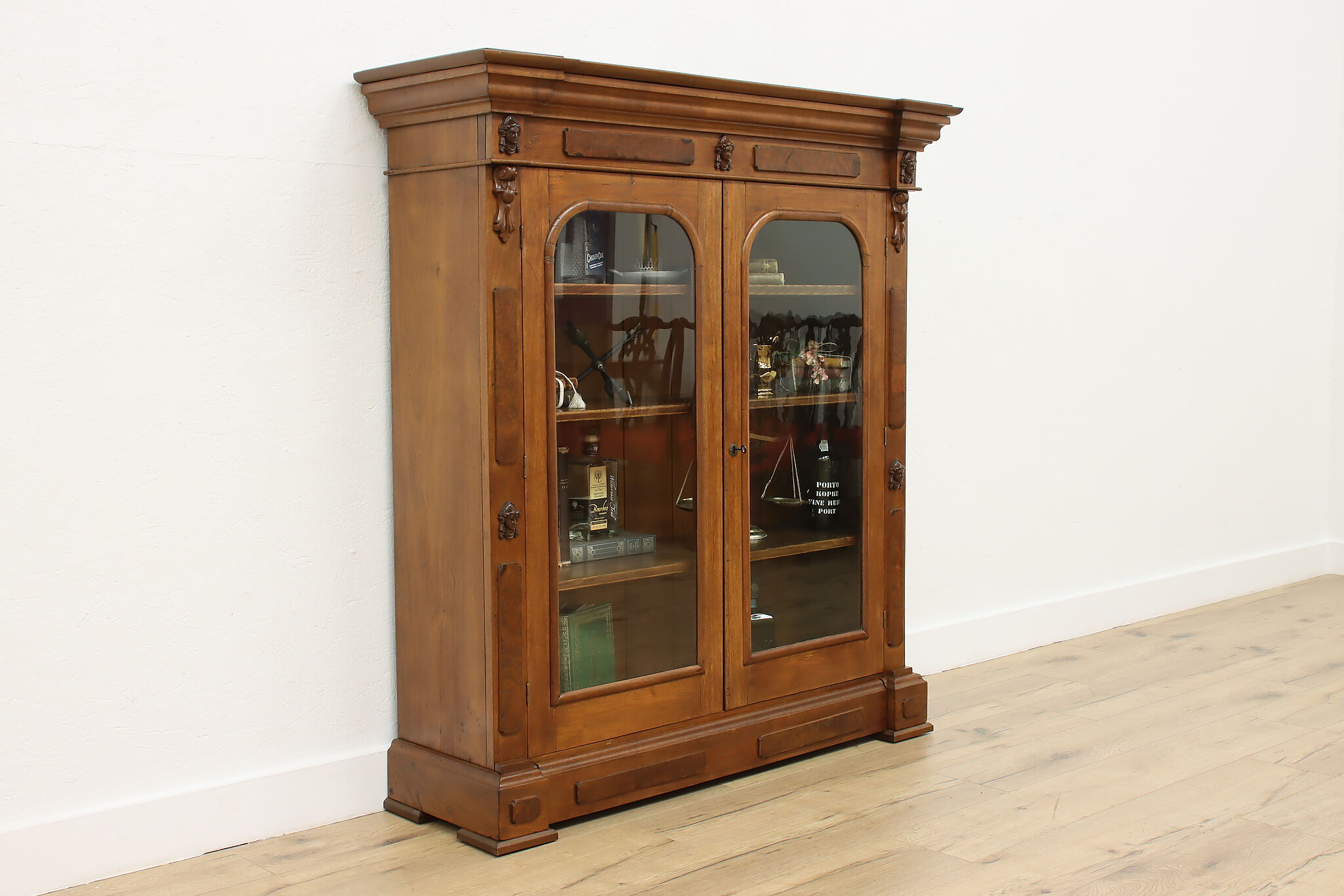 A Victorian era display cabinet or bookcase has carved busts of women, perhaps protectors of your valuables!