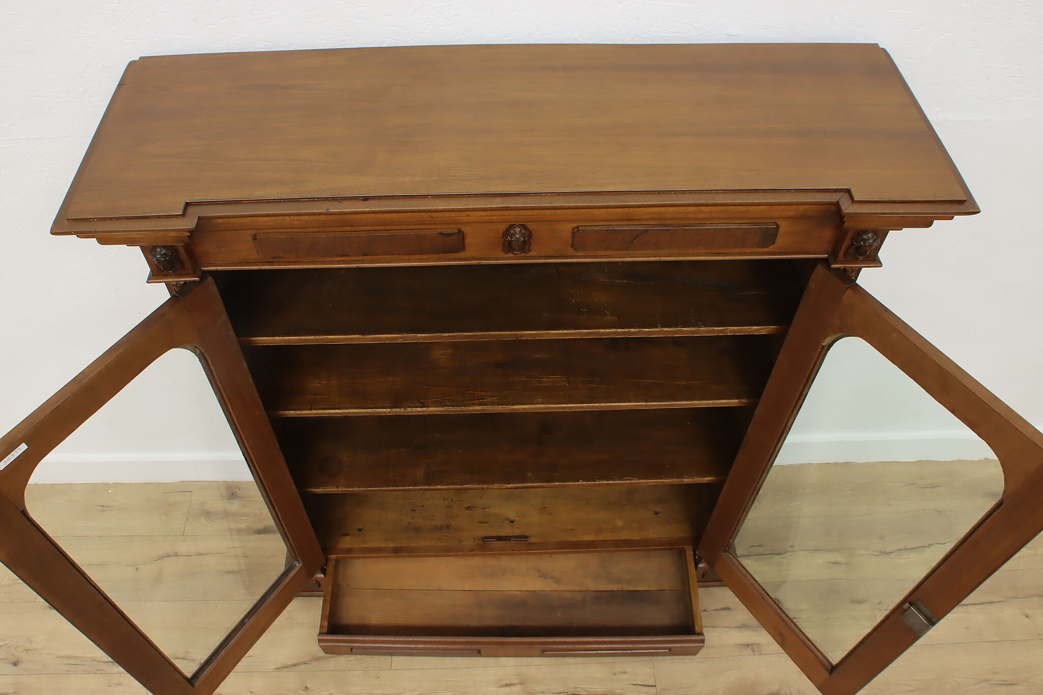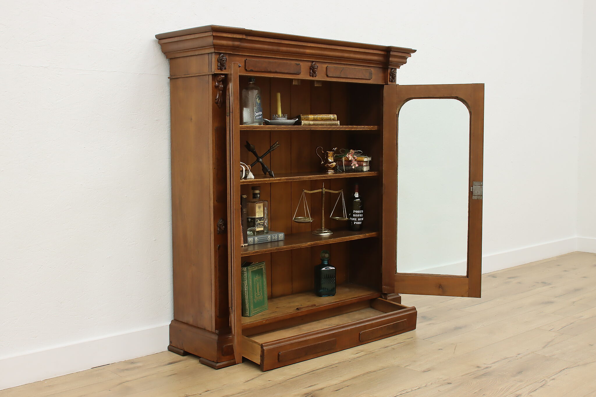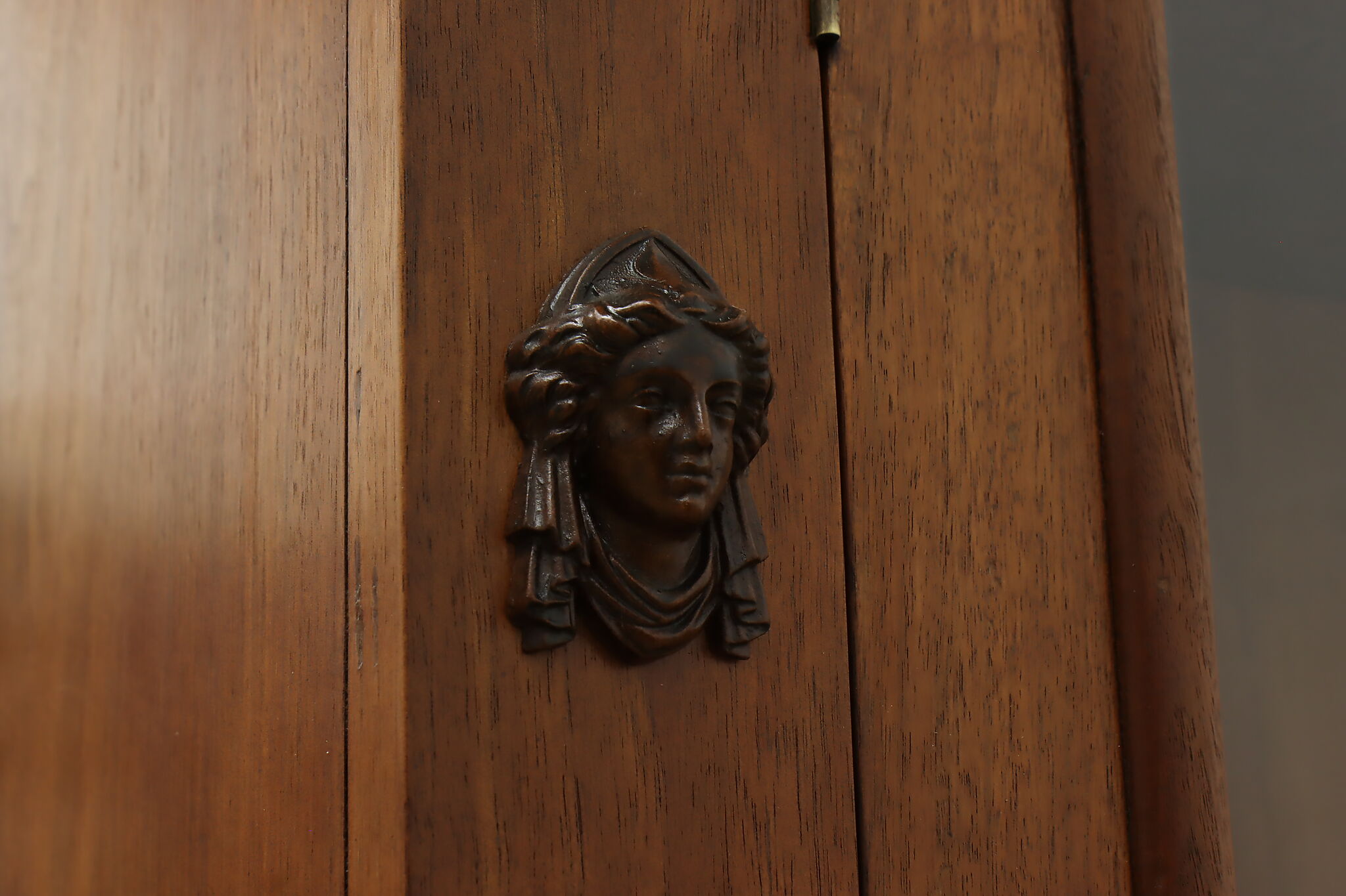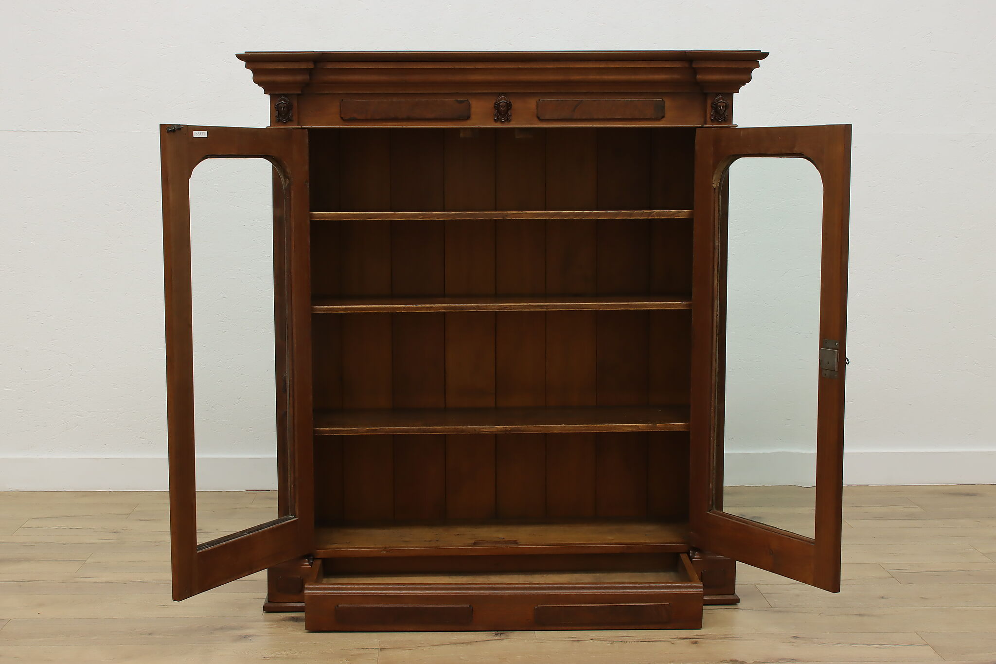 A Victorian era display cabinet or bookcase has carved busts of women, perhaps protectors of your valuables!