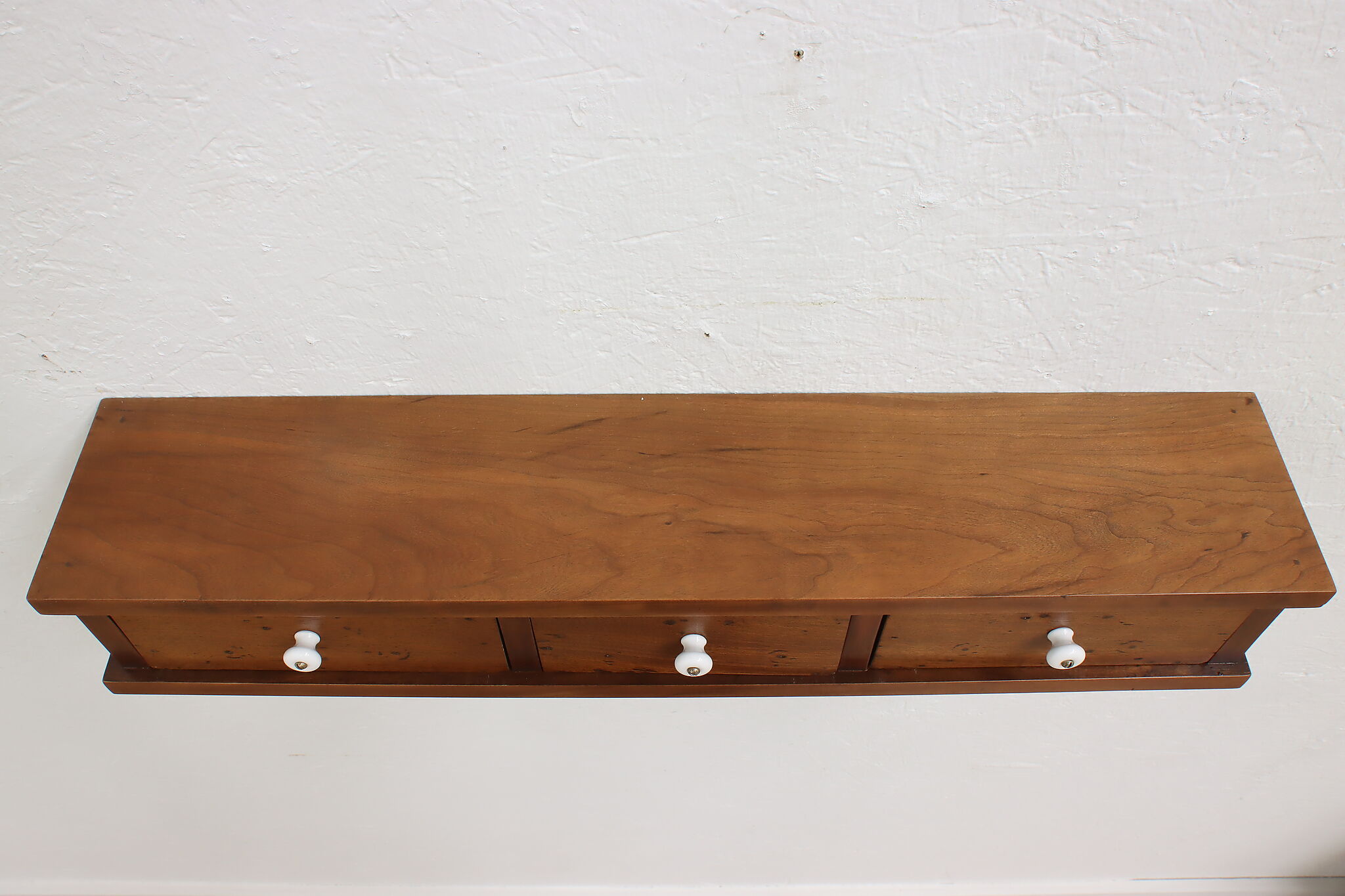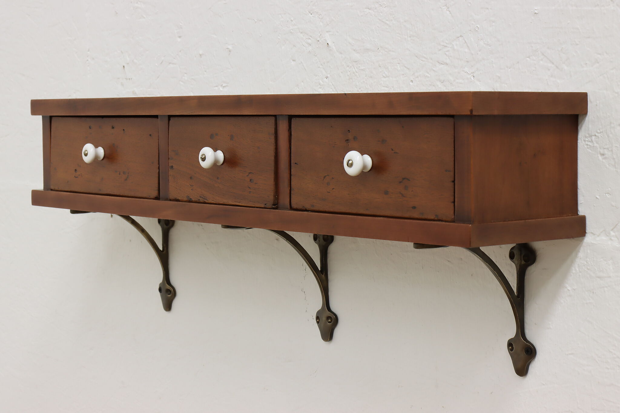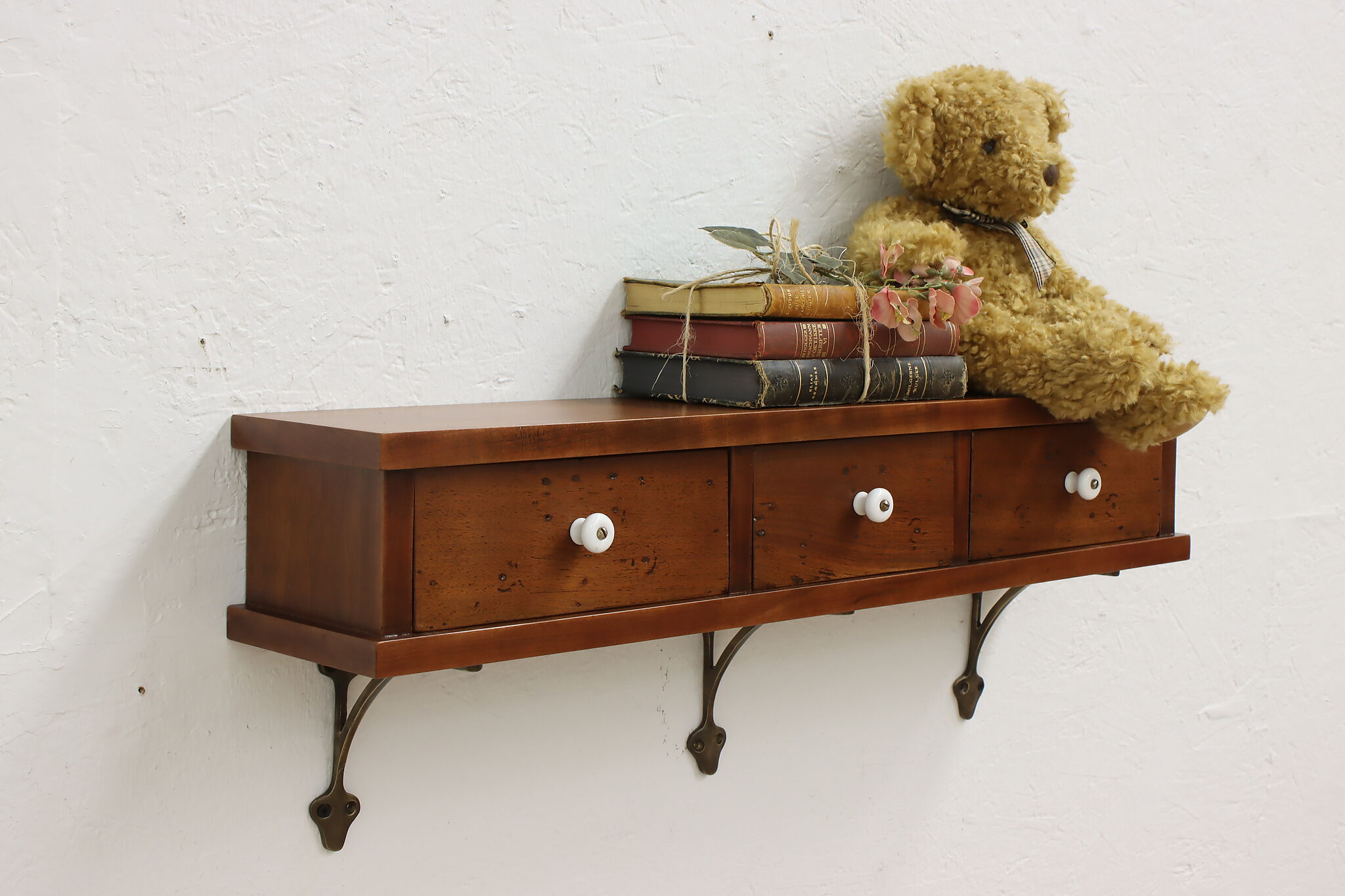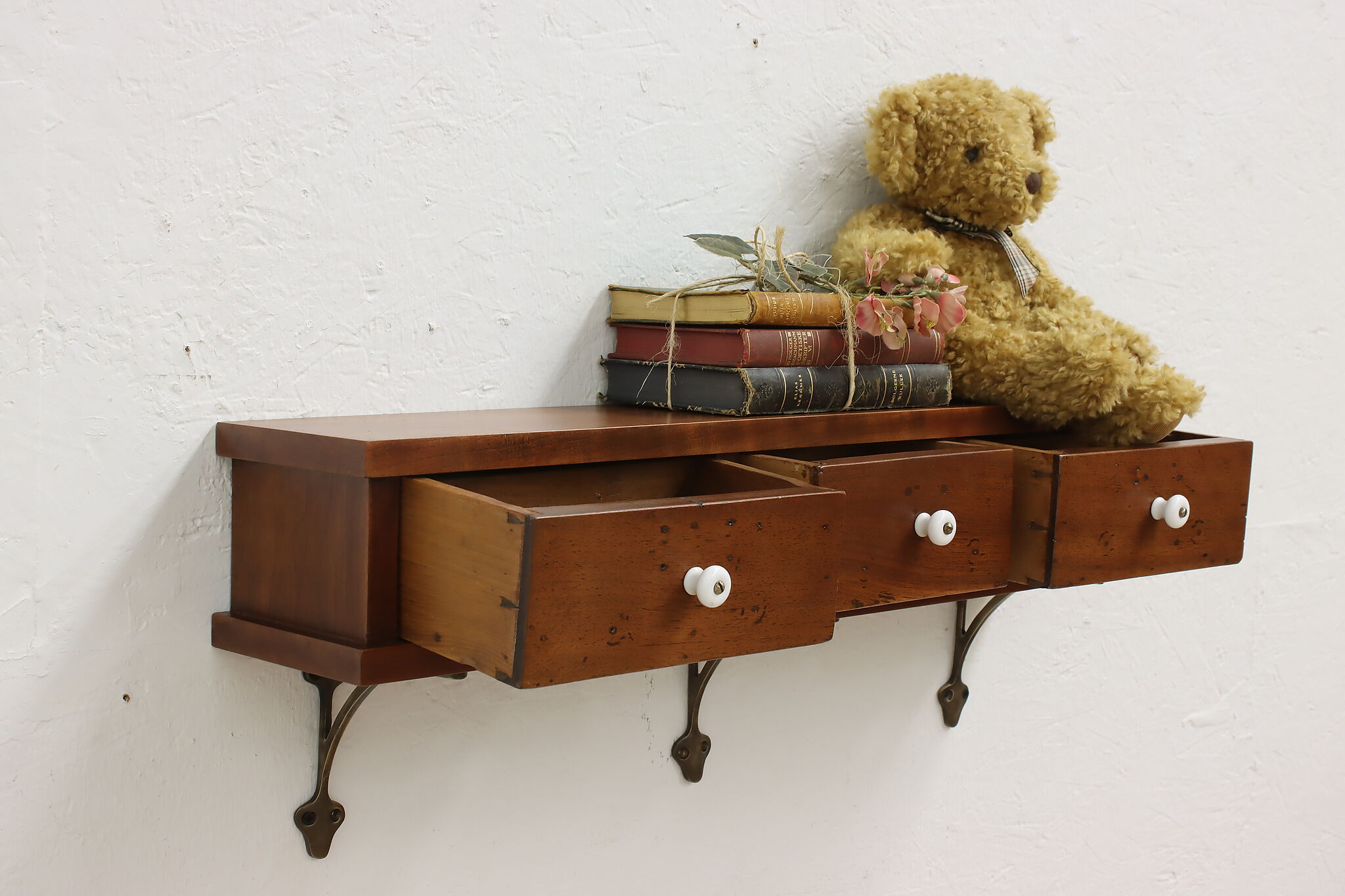 This darling Victorian era wall shelf has three drawers and would be a lovely way to display and collect trinkets.